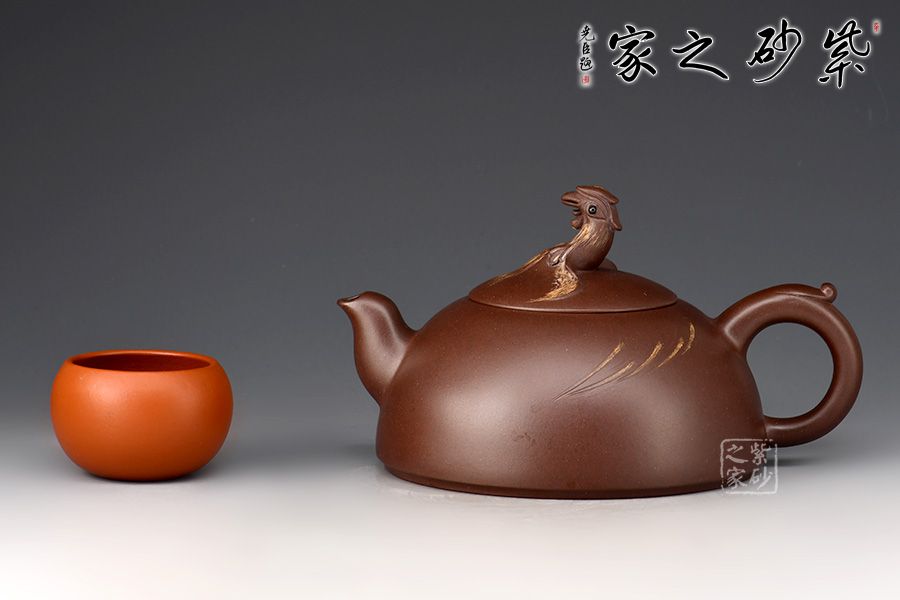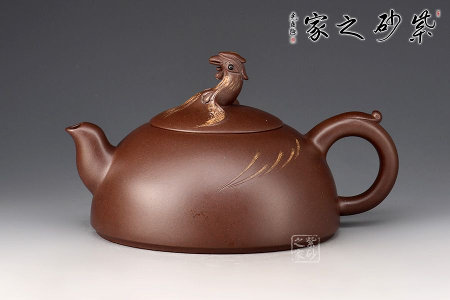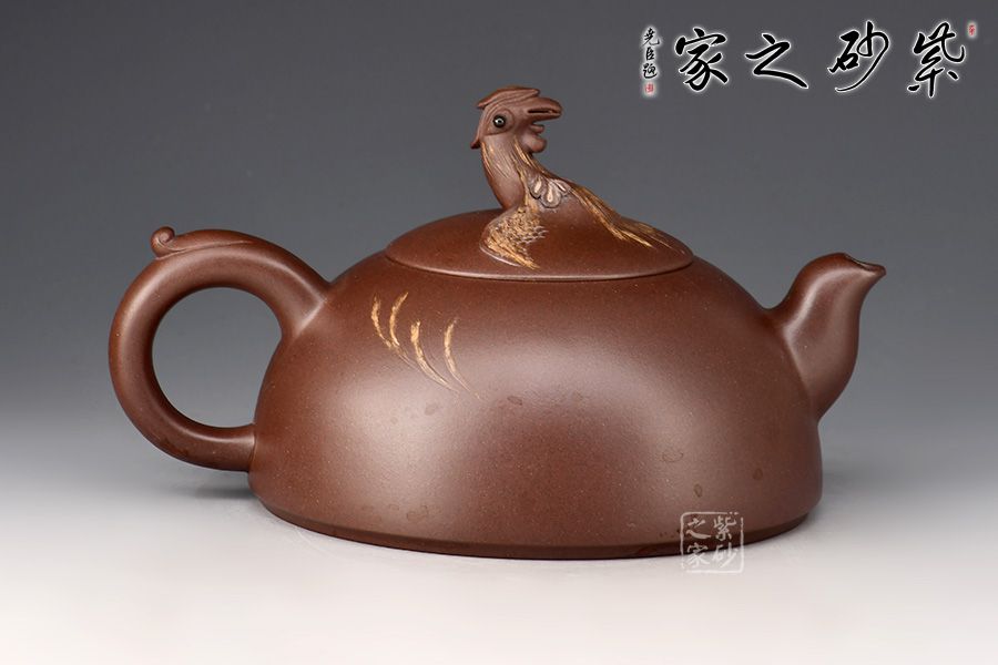 壺身好似半輪圓月,挺闊飽滿,線條流暢。壺蓋隆起,壺鈕用一只中國(guó)民間傳說(shuō)中的吉祥物鳳凰制作而成,栩栩如生。一彎嘴似鳳嘴,出水爽利,耳把粗細(xì)有致,拿捏舒適。