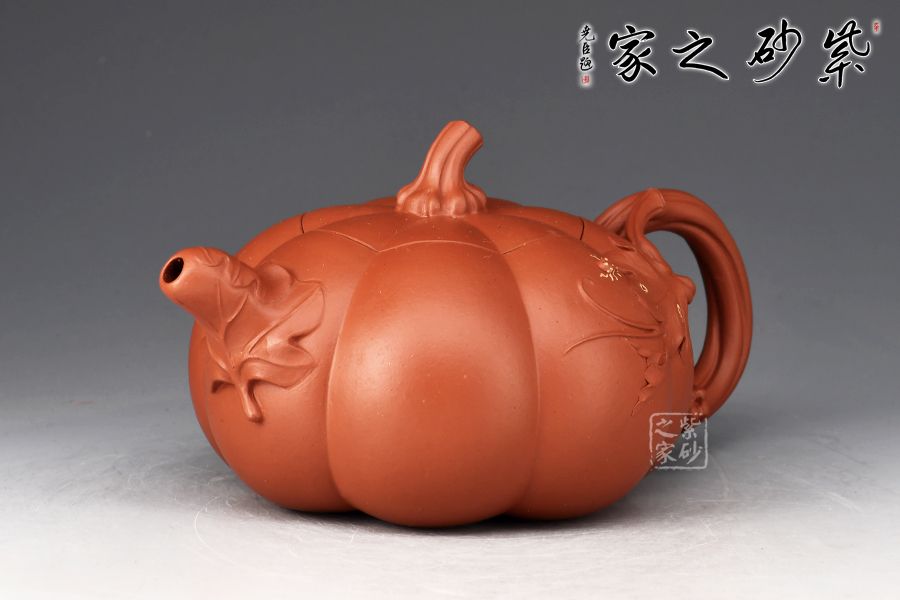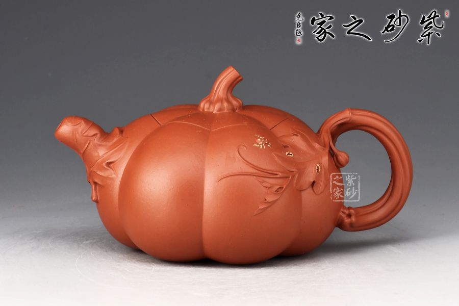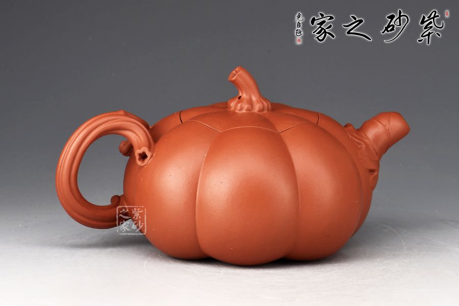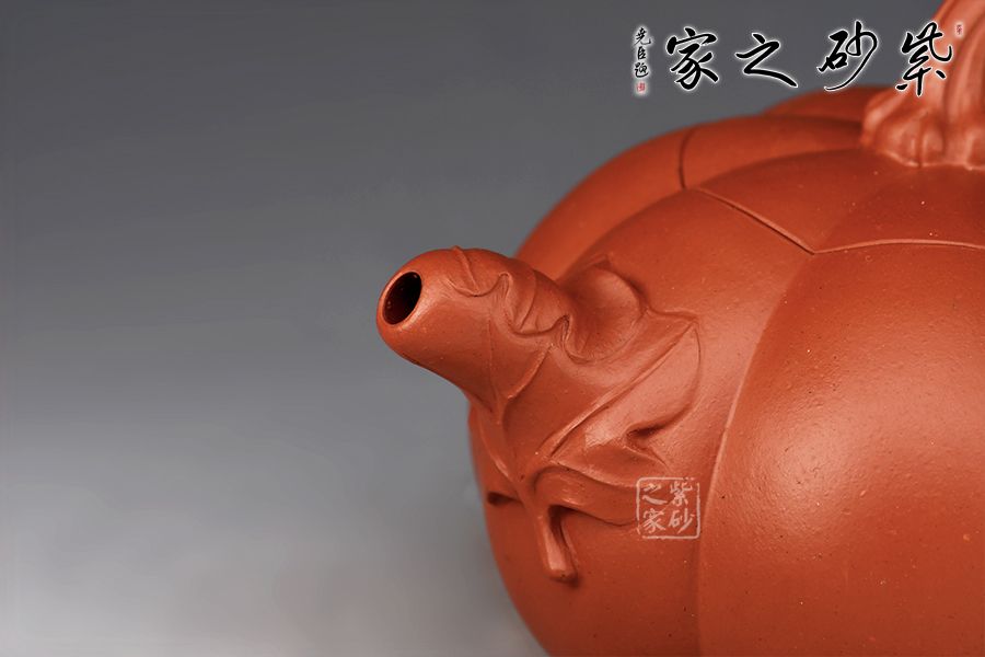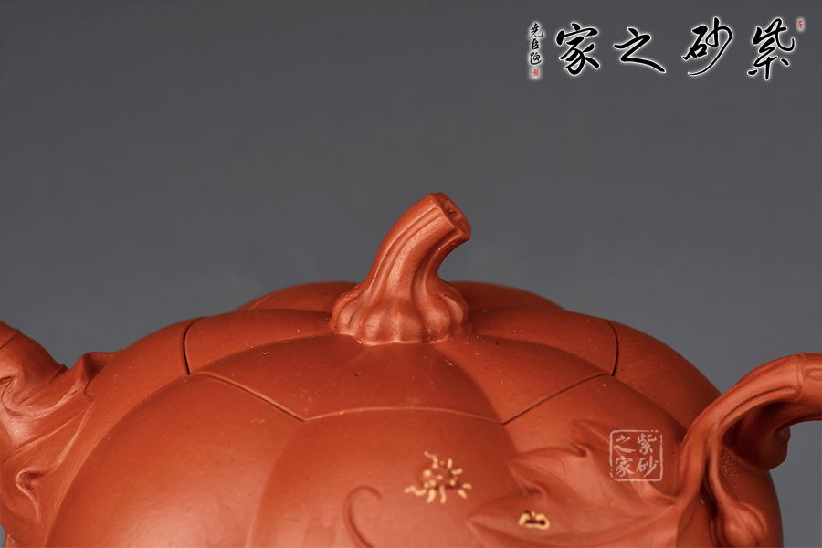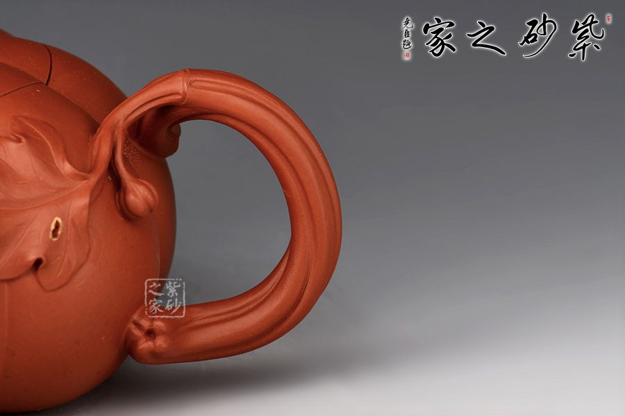 以瓜柄為壺蓋,瓜藤為壺把,葉脈藤紋貼繪逼真,構(gòu)思取材自然,達(dá)以和諧巧妙的境界,,雅而不俗。此壺壺身分為六瓣,肌理鼓出,飽滿瑩潤,形態(tài)逼真。壺鈕、壺把皆以南瓜藤為原型,壺嘴則若南瓜葉包裹而成,整壺仿若一只生動形象的南瓜!