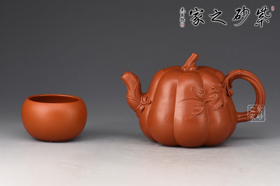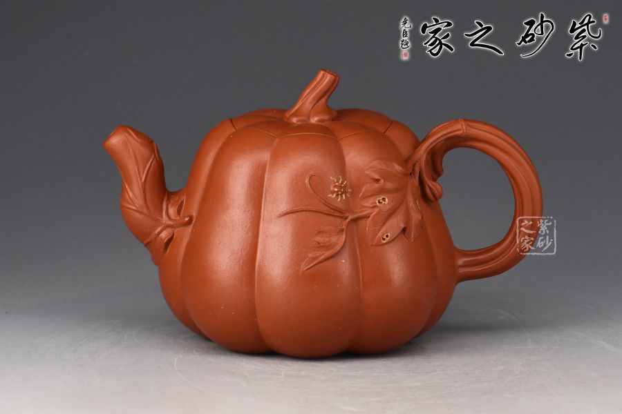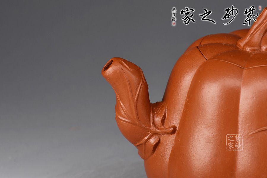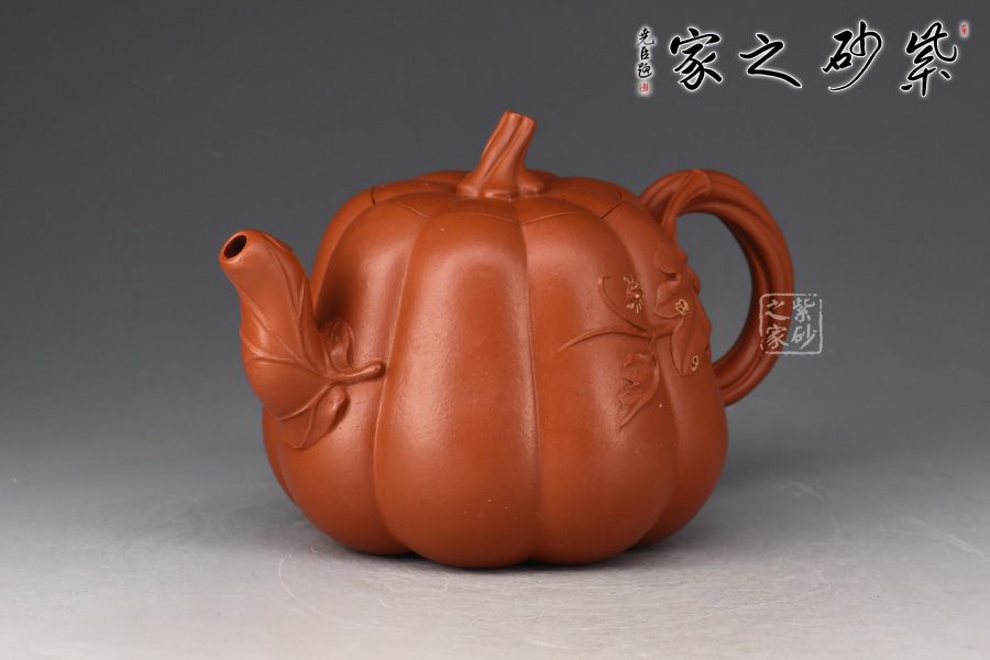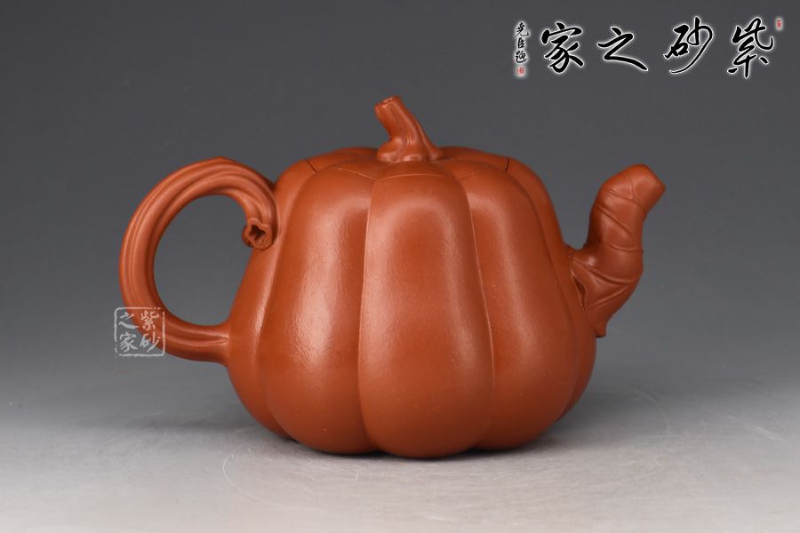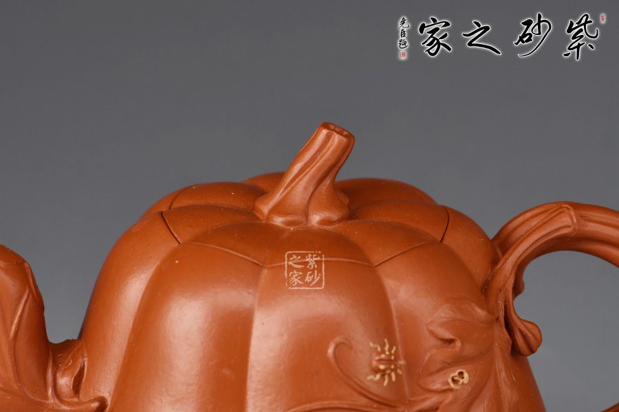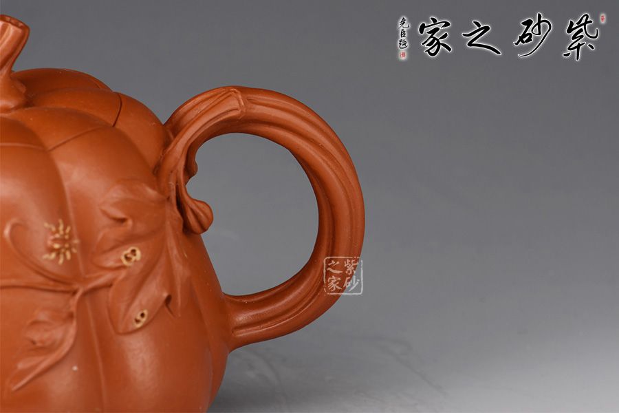 南瓜壺是紫砂壺中很常見的一種款型。此南瓜不僅外形酷似南瓜,更是集聚了南瓜的神韻,猶若瓜熟即將待落。壺鈕、壺把嫉皆以南瓜藤為原型,形象逼真。壺嘴則若南瓜葉包裹而成,精巧別致,創(chuàng)意極新。壺把處一南瓜葉子胥出,蒼老卻不失神氣。而南瓜壺身,紅色斑駁,極似熟透了的南瓜,讓人有快速采摘拿去熬湯的沖動。此南瓜壺,顯然活矣!