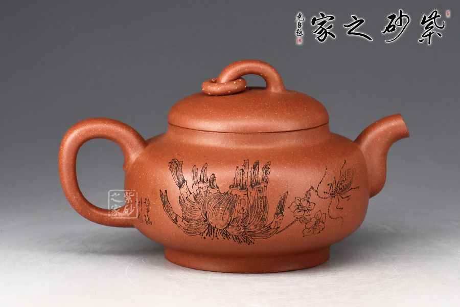 特點(diǎn):原礦因含緞泥、紅泥、紫泥等諸多共生礦,陶之后,于深沉之“橙紅色”底上,滿佈五彩斑斕的粗細(xì)、深淺之紅、黃星斑點(diǎn)。