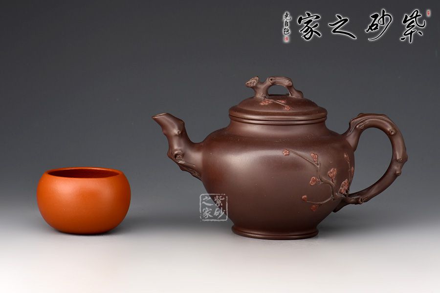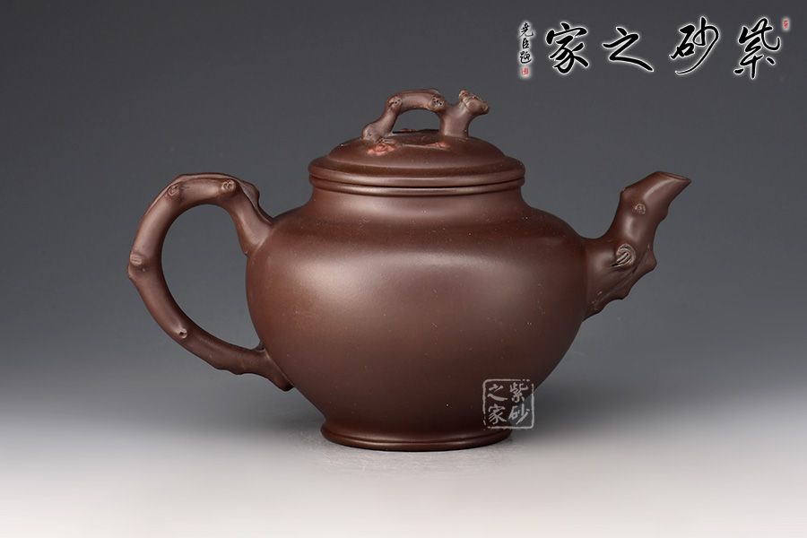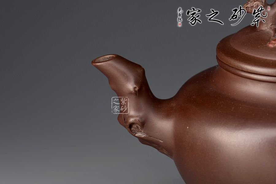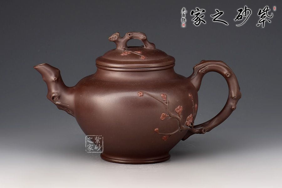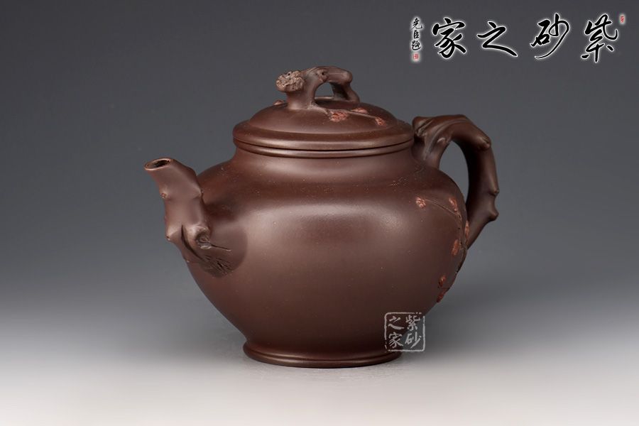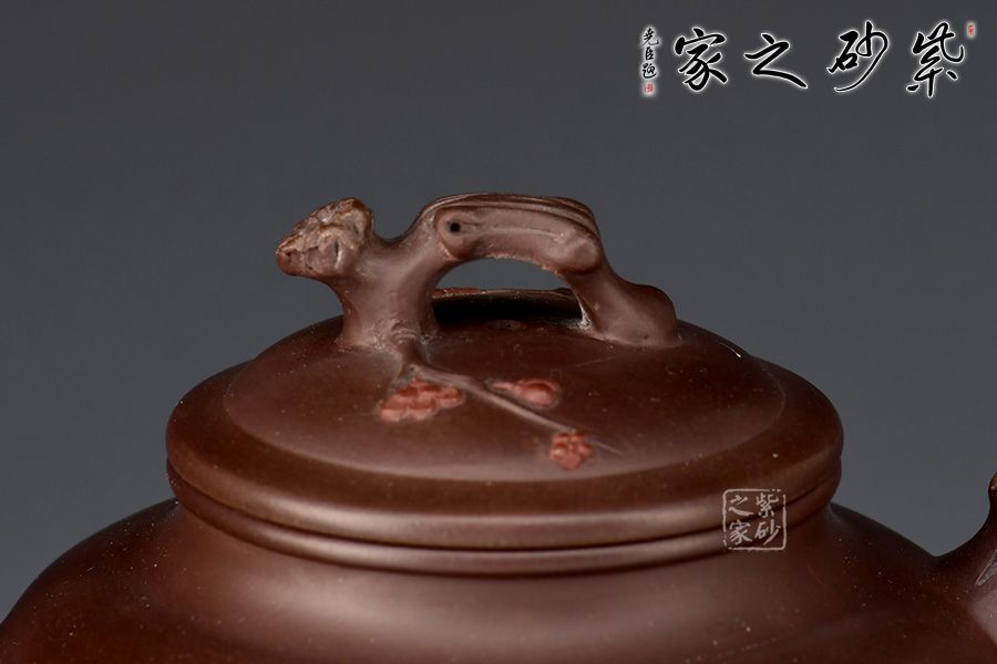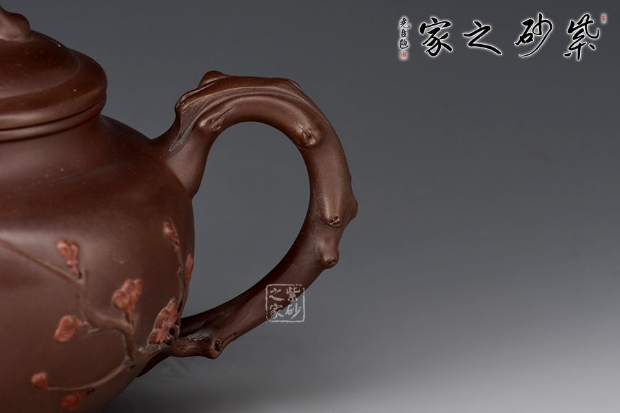 報春壺是紫砂經(jīng)典器型之一,此壺為作者精選紫泥,全手工制作而成,泥色古樸沉郁。造型以笑櫻壺為基礎(chǔ),以梅入題,壺腹圓潤飽滿,橋鈕、彎流、耳把如梅枝自然胥出,蜿蜒而行,塑就優(yōu)雅姿態(tài)。蓋面、壺面貼塑裝飾精巧,梅花朵朵綻放,生機(jī)盎然。整器比例敲到好處,線條流暢柔和,雅致之中見精湛工藝,氣韻充沛,欣賞、把玩、使用俱佳。
