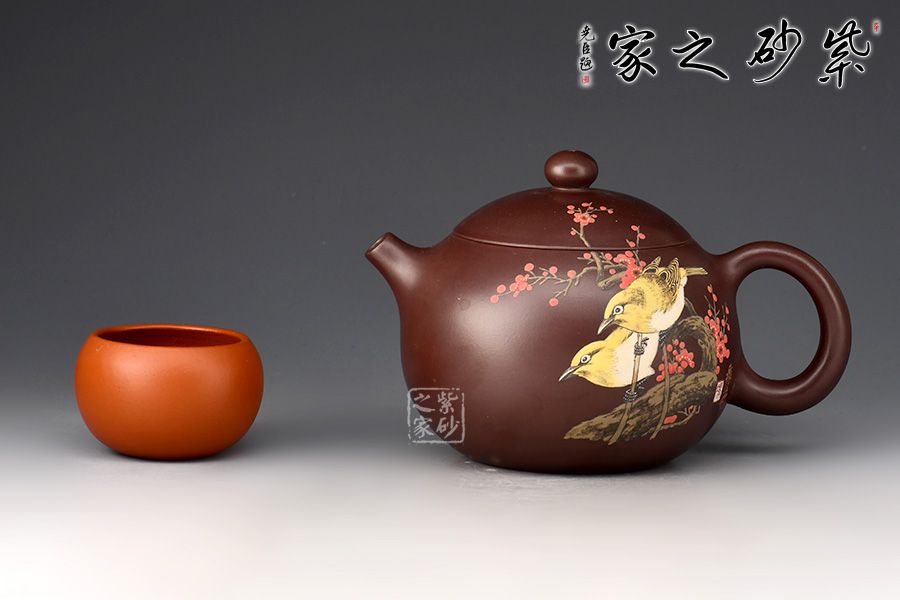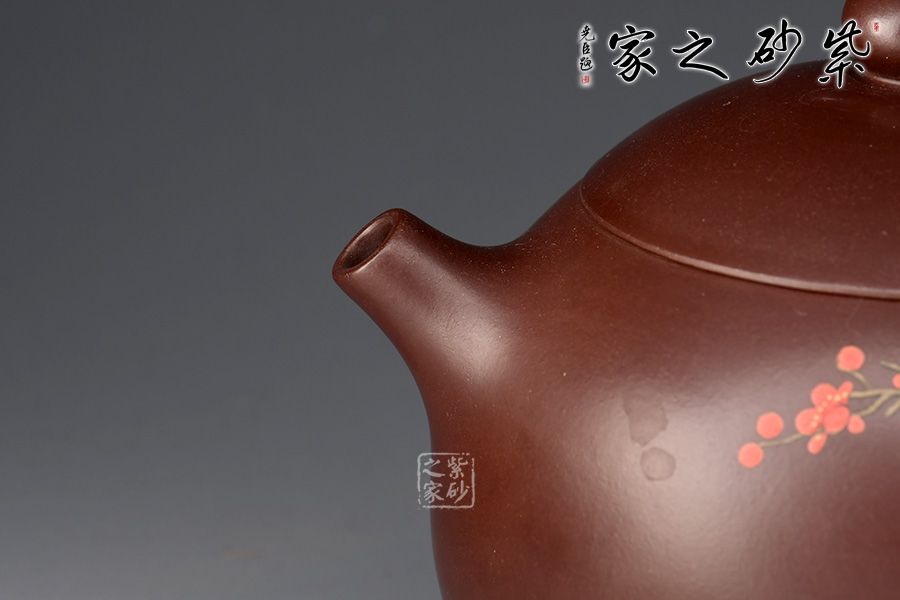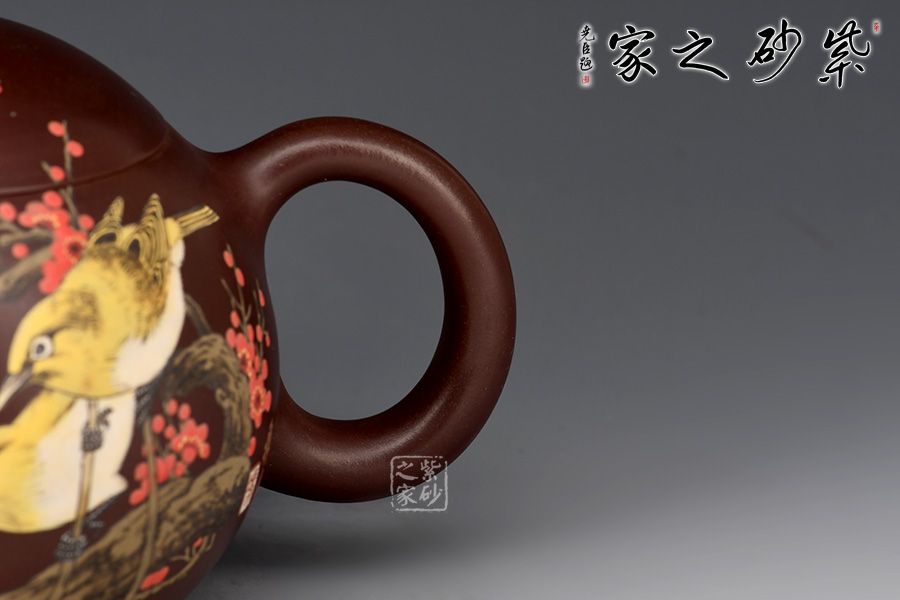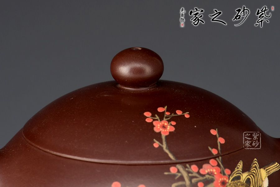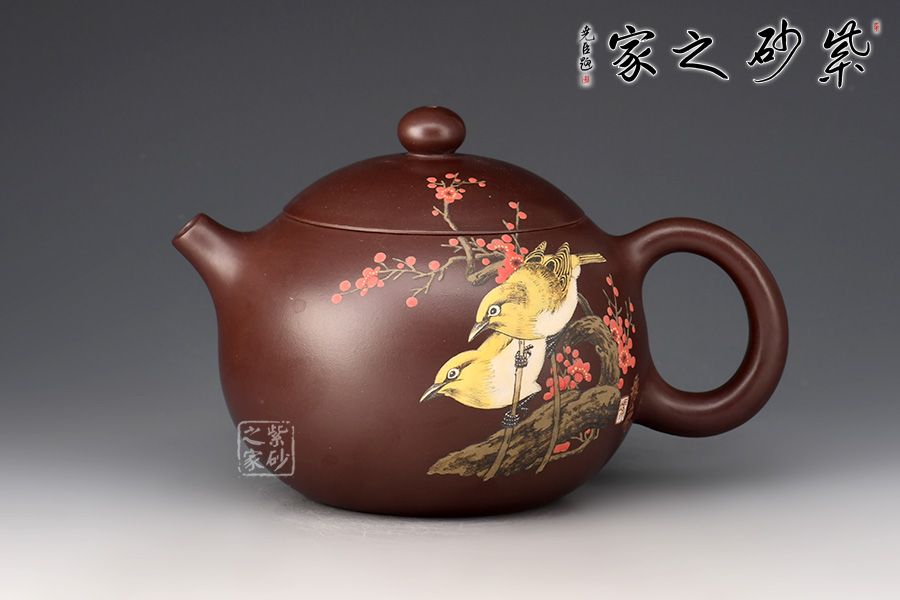 西施壺乃紫砂壺最經(jīng)典壺型之一,不僅圓潤(rùn)精巧,豐神綽約,還是一款非常實(shí)用的殺茶利器。此件《西施》以紫泥作胎,泥色古樸,好泡養(yǎng)。壺身豐腴,柔若無骨,線條流轉(zhuǎn)自如,彷如一氣呵成,鈕、流、把比例和諧。彩繪裝飾喜鵲、梅枝,色澤運(yùn)用得當(dāng),賞用藏皆可。