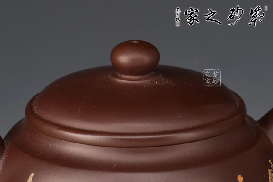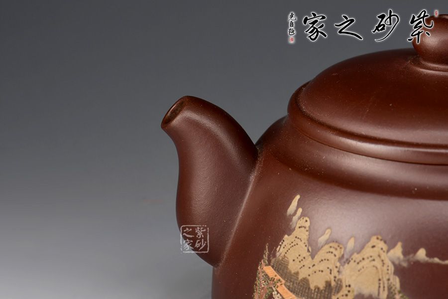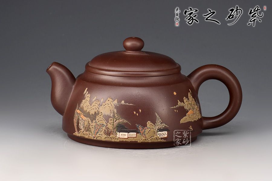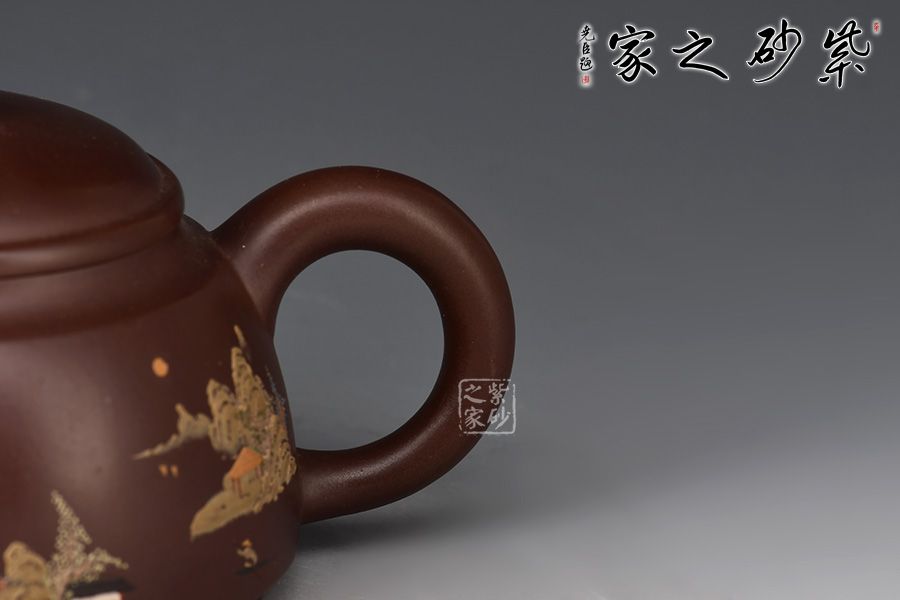 此壺精巧特別,韻味獨特。壺身為梯形,上小下大,底部加足,穩(wěn)重而不刻板。壺肩部位過渡自然平滑,壓蓋設(shè)計獨留一條環(huán)線,使壺身更有層次感。微鼓起的壺蓋和扁圓壺鈕氣勢協(xié)調(diào),更有工藝美感。短促壺嘴和環(huán)形壺把相互映照,一大一小,一實一虛,趣味橫生。彩繪江南山水,彩色運用得當,此壺精巧細膩,推薦收藏!