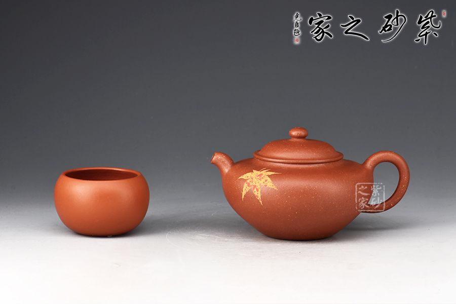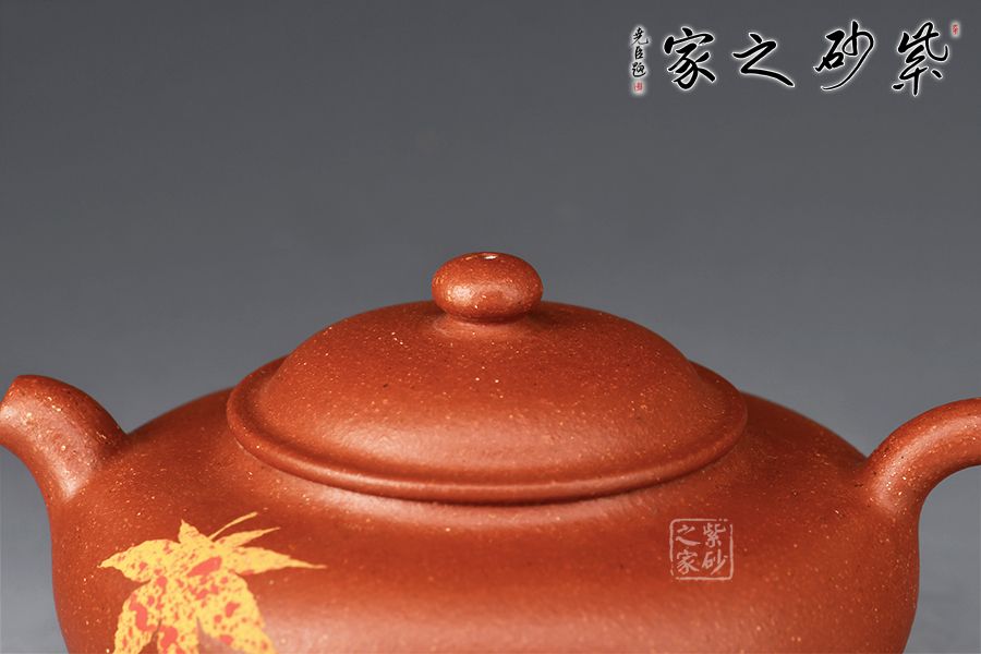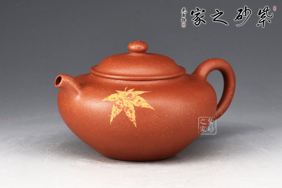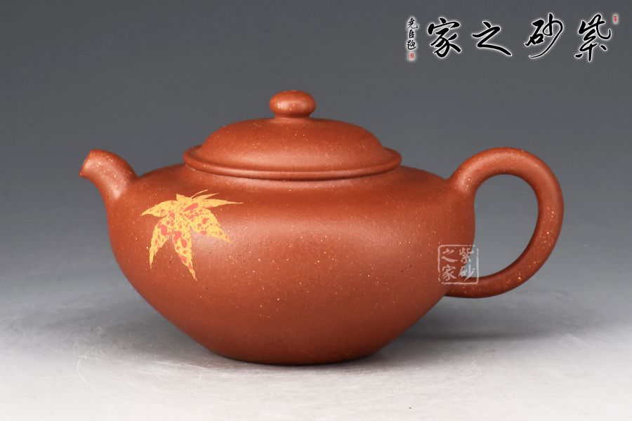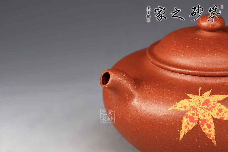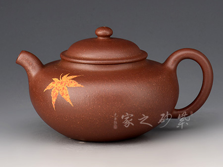 該壺型小巧之中透出靈性之美,老師將泥繪楓葉置于茗壺之上,壺身?xiàng)魅~裝飾楓葉,為秋時(shí)最美,頗有“一葉之秋”之韻味。