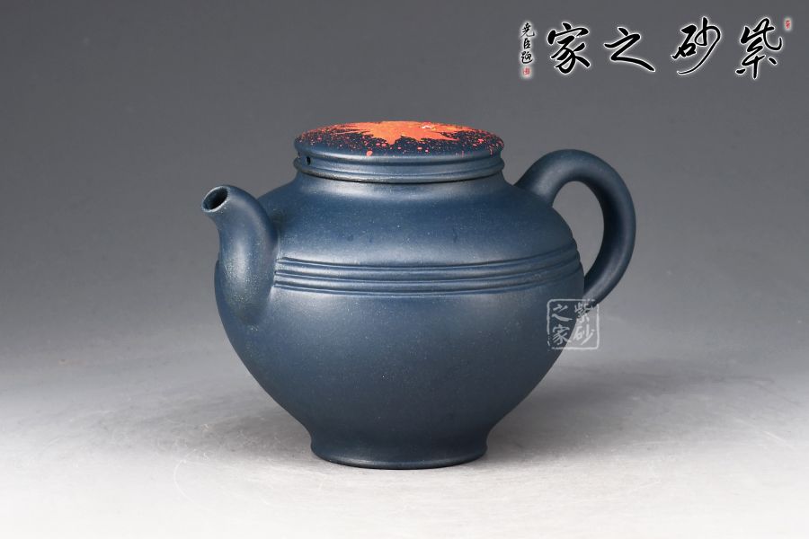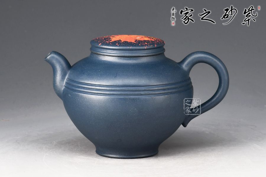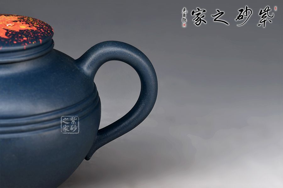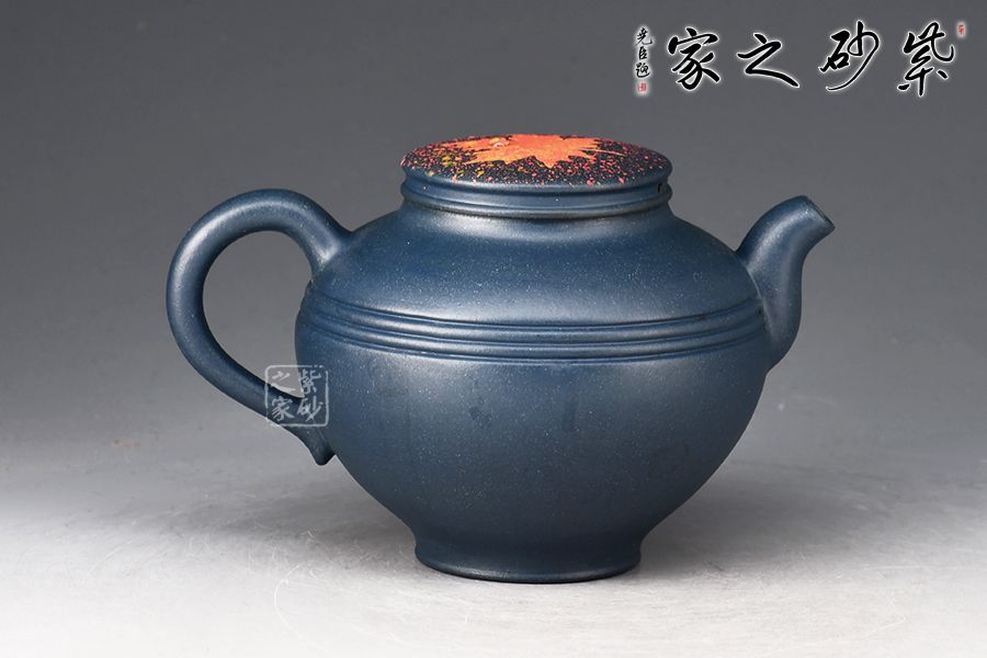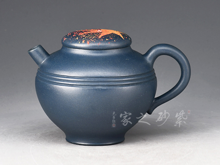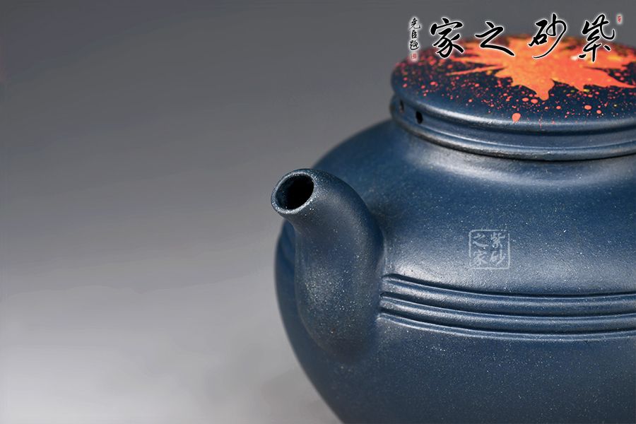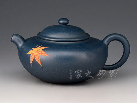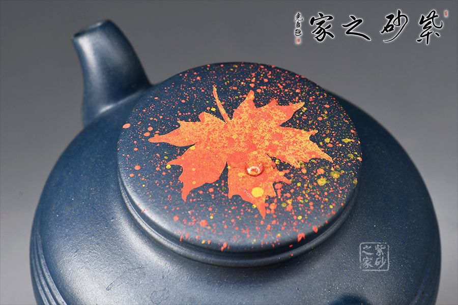 壺身?xiàng)魅~裝飾楓葉,為秋時(shí)最美,頗有“一葉之秋”之韻味。上窄中款下窄,腹部以圓線貫穿,短流、耳把,形成極好的反差,令人心曠神怡。壺蓋平緩,秋楓平躺在一片金色的清暉中,金色和黃色交融,露珠剔透,在天青泥的底色上似夢(mèng)似幻,華貴非常。