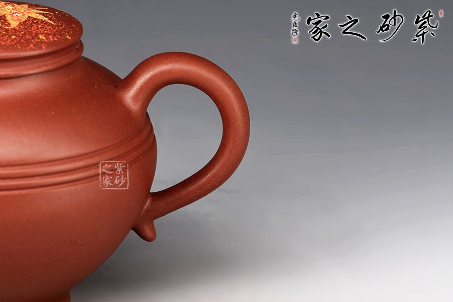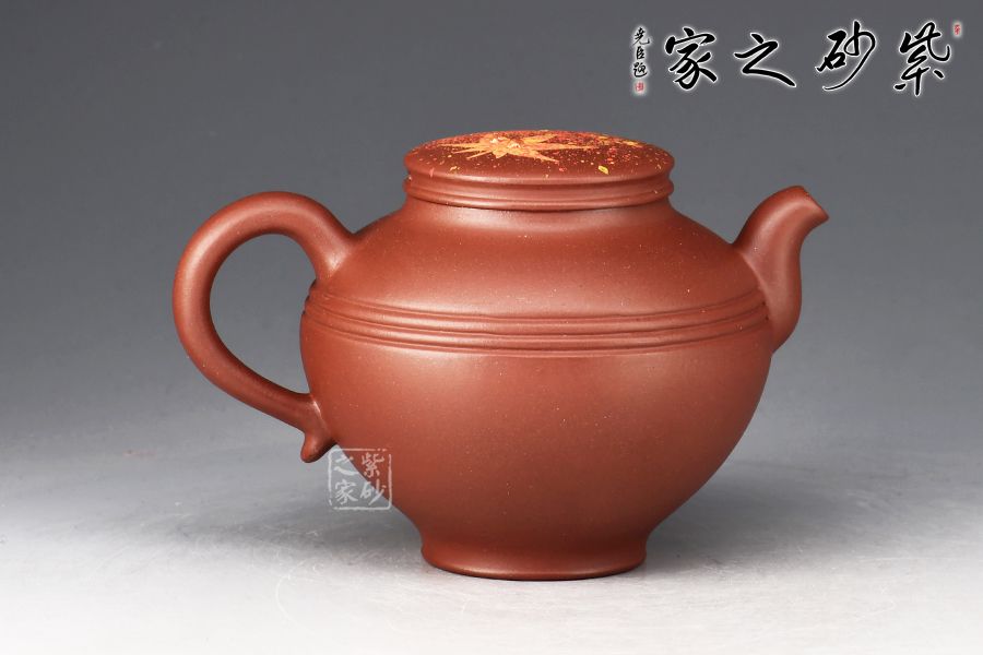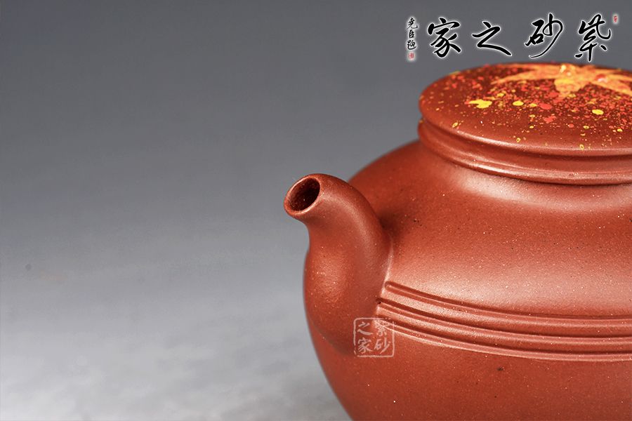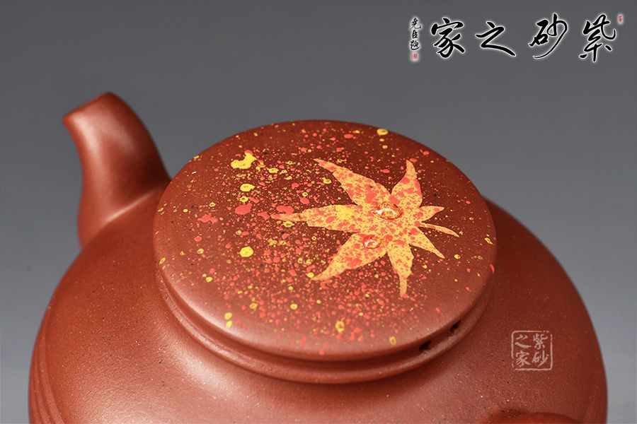 壺身?xiàng)魅~裝飾楓葉,為秋時(shí)最美,頗有“一葉之秋”之韻味。上窄中款下窄,腹部以圓線(xiàn)貫穿,短流、耳把,形成極好的反差,令人心曠神怡。壺蓋平緩,秋楓平躺在一片金色的清暉中,金色和黃色交融,露珠剔透。精選紫泥全手工制作而成,泥色亮麗,好泡養(yǎng)。