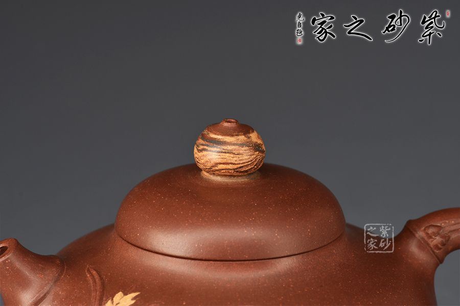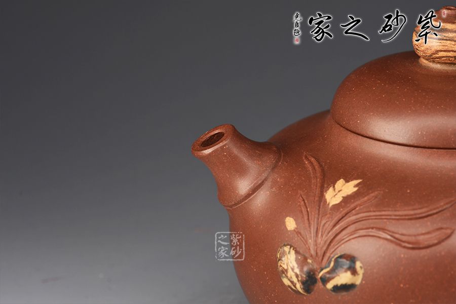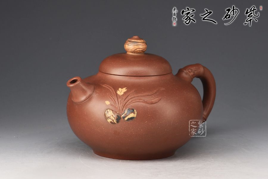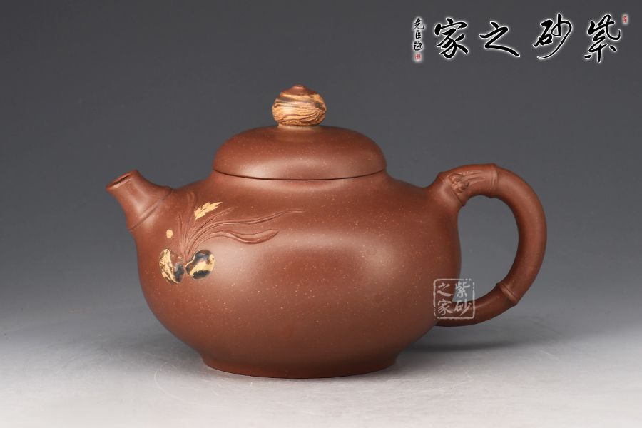 口蓋嚴(yán)密,壺鈕絞泥珠形,壺身絞泥成石,石中一枝蘭花,與主題相得益彰。