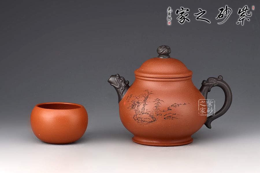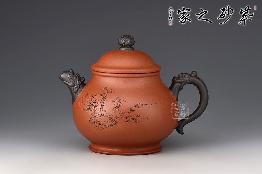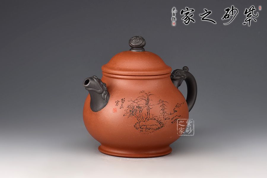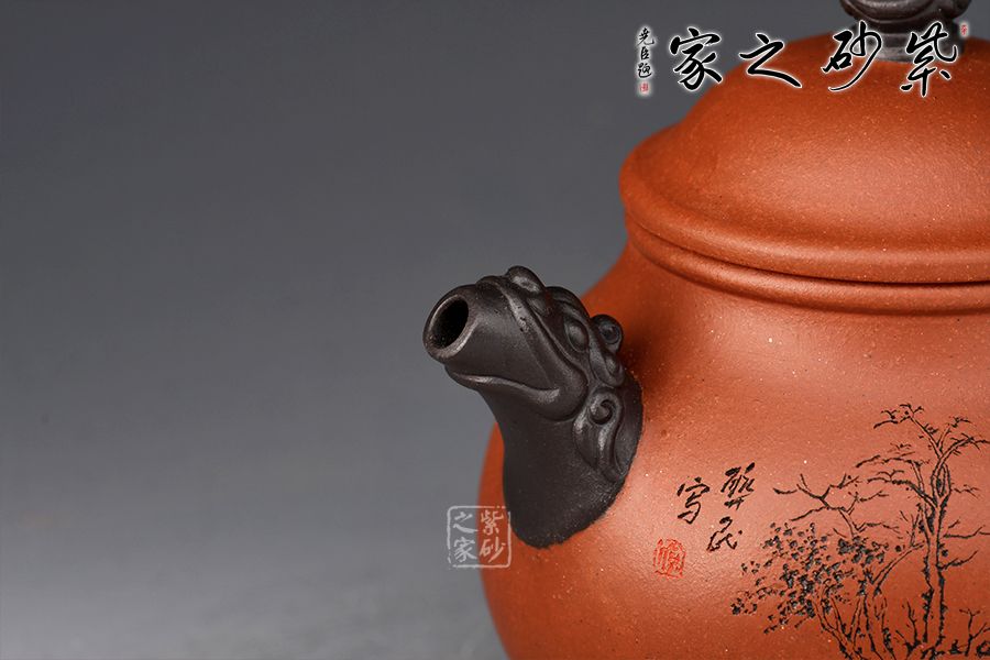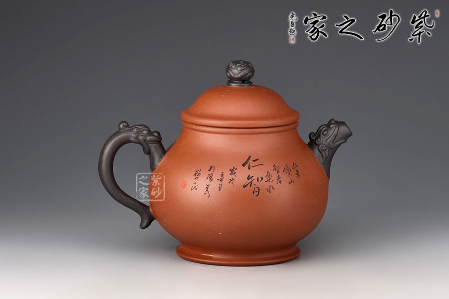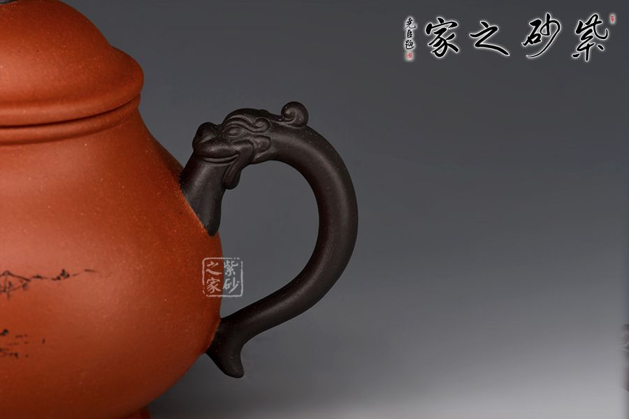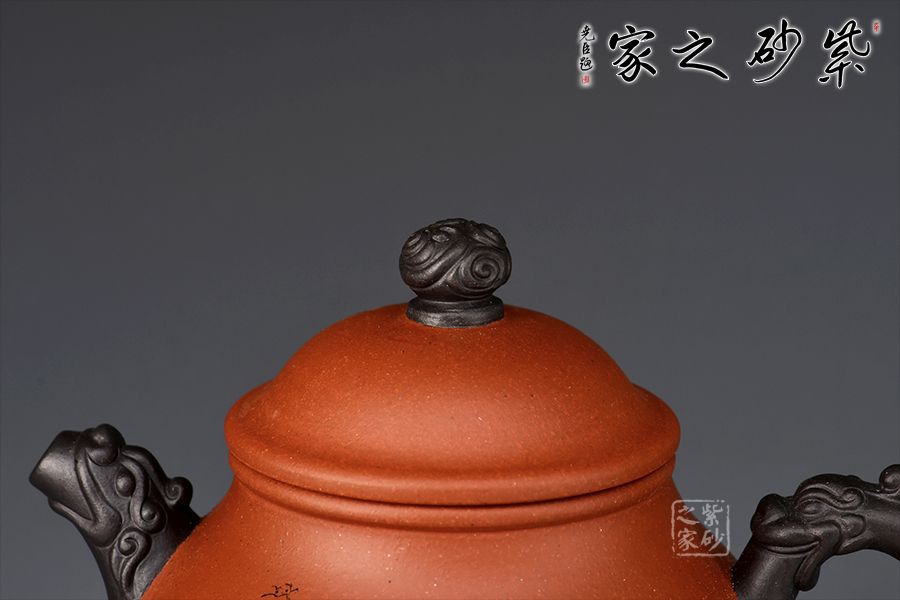 此壺雙色泥制作,摹古經(jīng)典而具創(chuàng)新之意,壺身略高呈高梨形,上斂下豐,壺腹圓潤,寬厚能容,而氣質(zhì)沉穩(wěn)。此壺耳把和壺嘴均以龍頭堆繪裝飾,圈足龍珠形鈕,整體配合自然,點、線、面結(jié)合融襯,壺身各部比例協(xié)調(diào)一致,勻稱流暢。