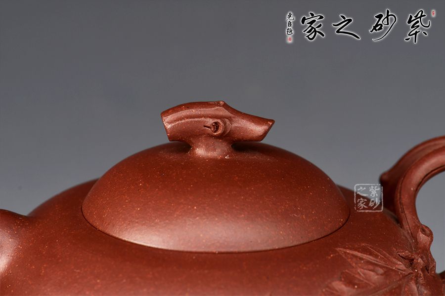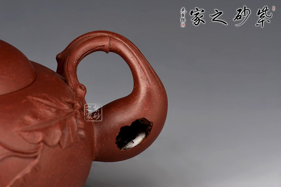 壺身飽滿圓潤,線條流暢。壺蓋微鼓,截蓋設計,嚴絲合縫,壺鈕設計巧妙,仿生設計,形象自然。直嘴出水爽利,葡萄藤為把,鏤空設計,螞蟻筑洞,別出心裁。壺腹貼花葡萄枝葉紋,十分精美。此件作品工藝復雜、制作難度極高,老師代表作,推薦收藏!