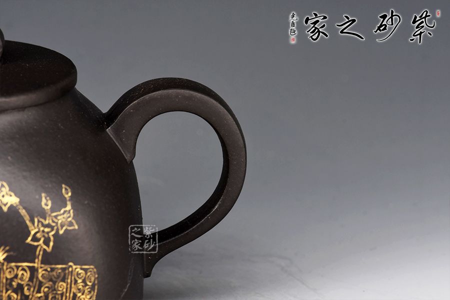 彎流特別有精神,壺基下垂大顯福相,耳形端把纖細輕盈,角度適宜,端握極為稱手。刻繪描金,