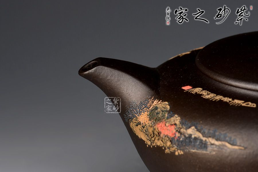 彎流壺嘴俊俏自然,出水爽利,和耳形端把相應(yīng)成趣。肩部折線自壺嘴至壺把,
