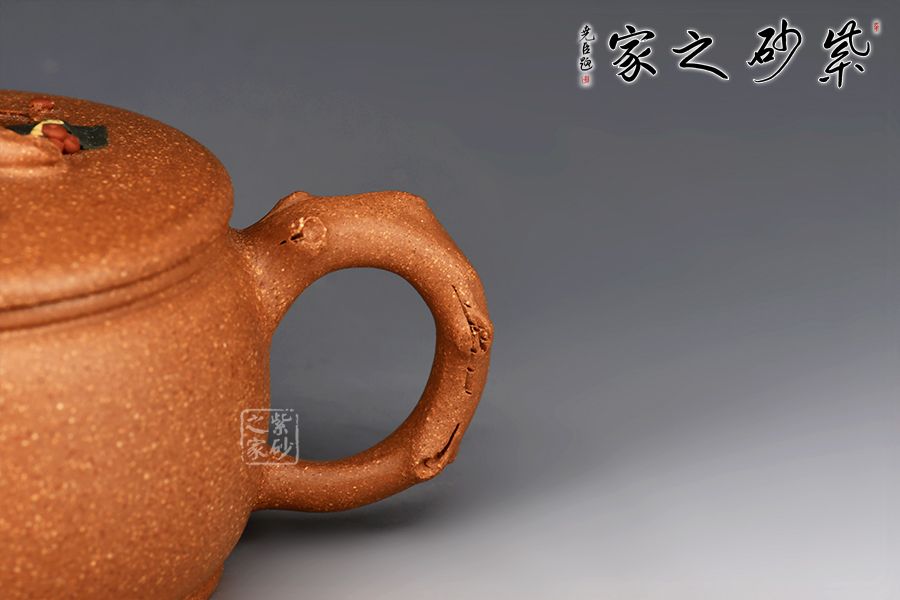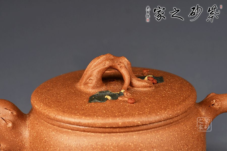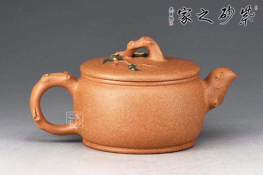壺身呈圓柱狀,線條流暢。壺流、壺把、壺鈕皆為樹樁之形,壺蓋裝飾翠綠的樹葉,果實(shí)點(diǎn)綴其間,更添生動(dòng)意蘊(yùn),更顯精妙絕倫之技!