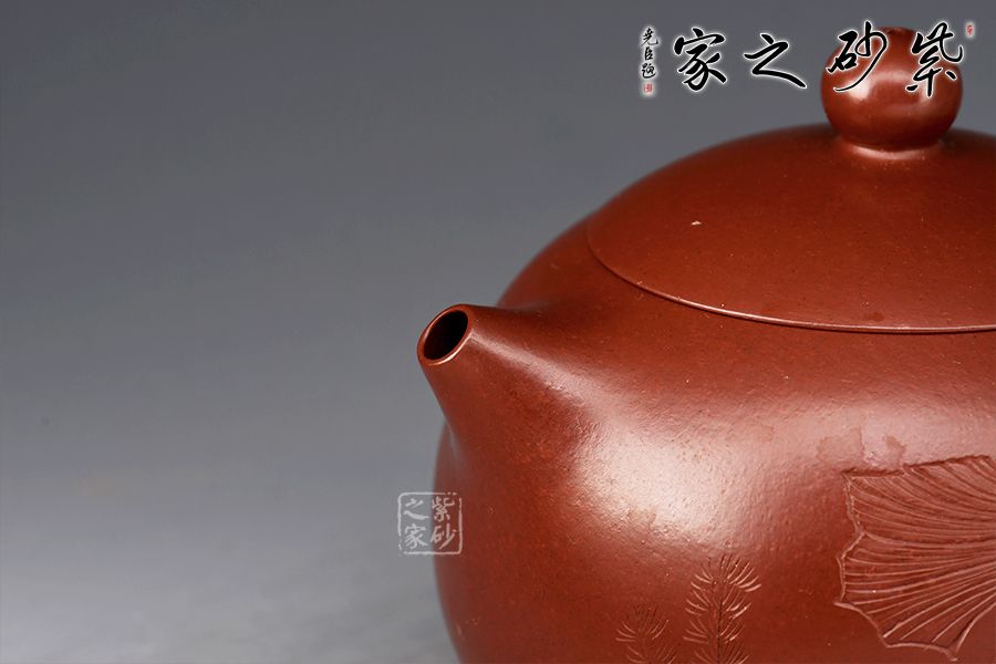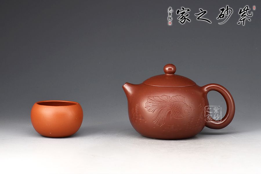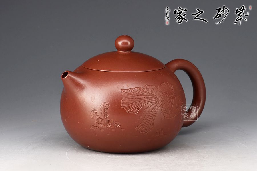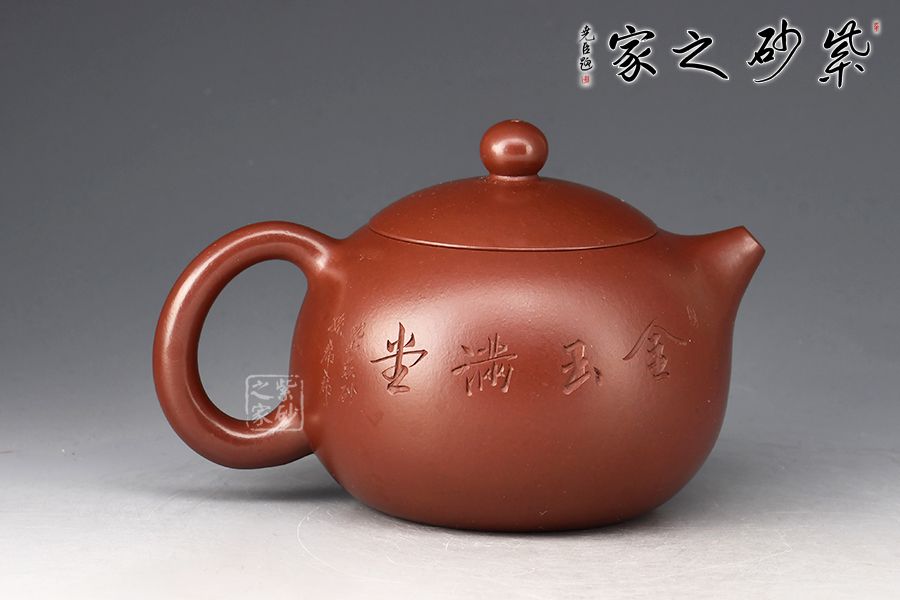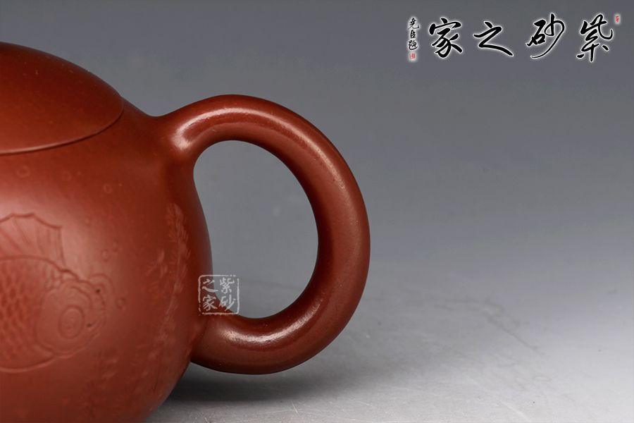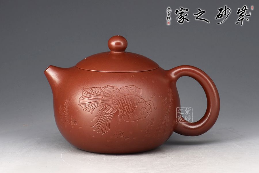 西施壺乃紫砂壺最經(jīng)典壺型之一,不僅圓潤精巧,豐神綽約,還是一款非常實用的殺茶利器。此件《西施》以紫朱泥作胎,成色明潤,嬌艷動人,觸之細(xì)膩,手感極佳。壺身豐腴,柔若無骨,線條流轉(zhuǎn)自如,彷如一氣呵成,鈕、流、把比例和諧。壺身雙面陶刻,正面刻繪金魚,反面刻繪四字“金玉滿堂”,前后呼應(yīng),推薦收藏。
