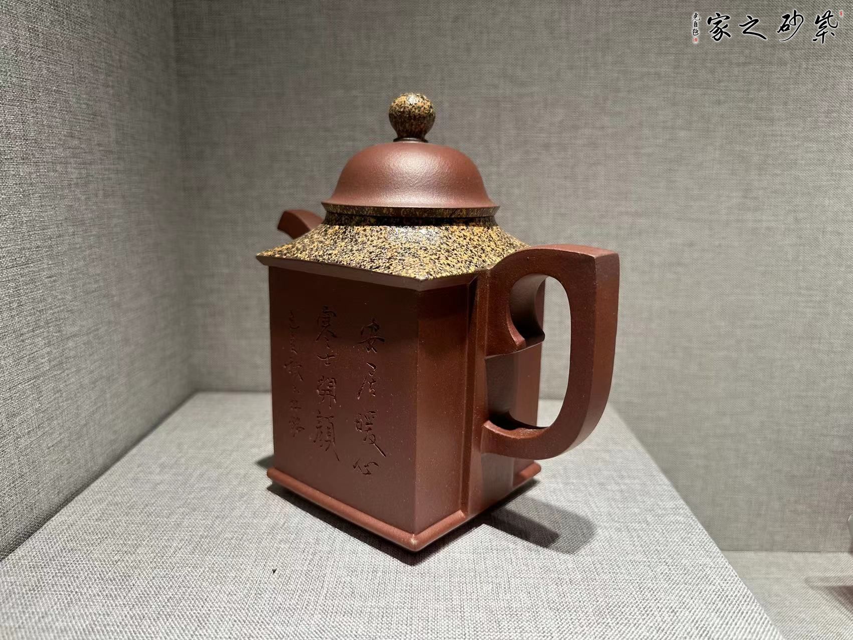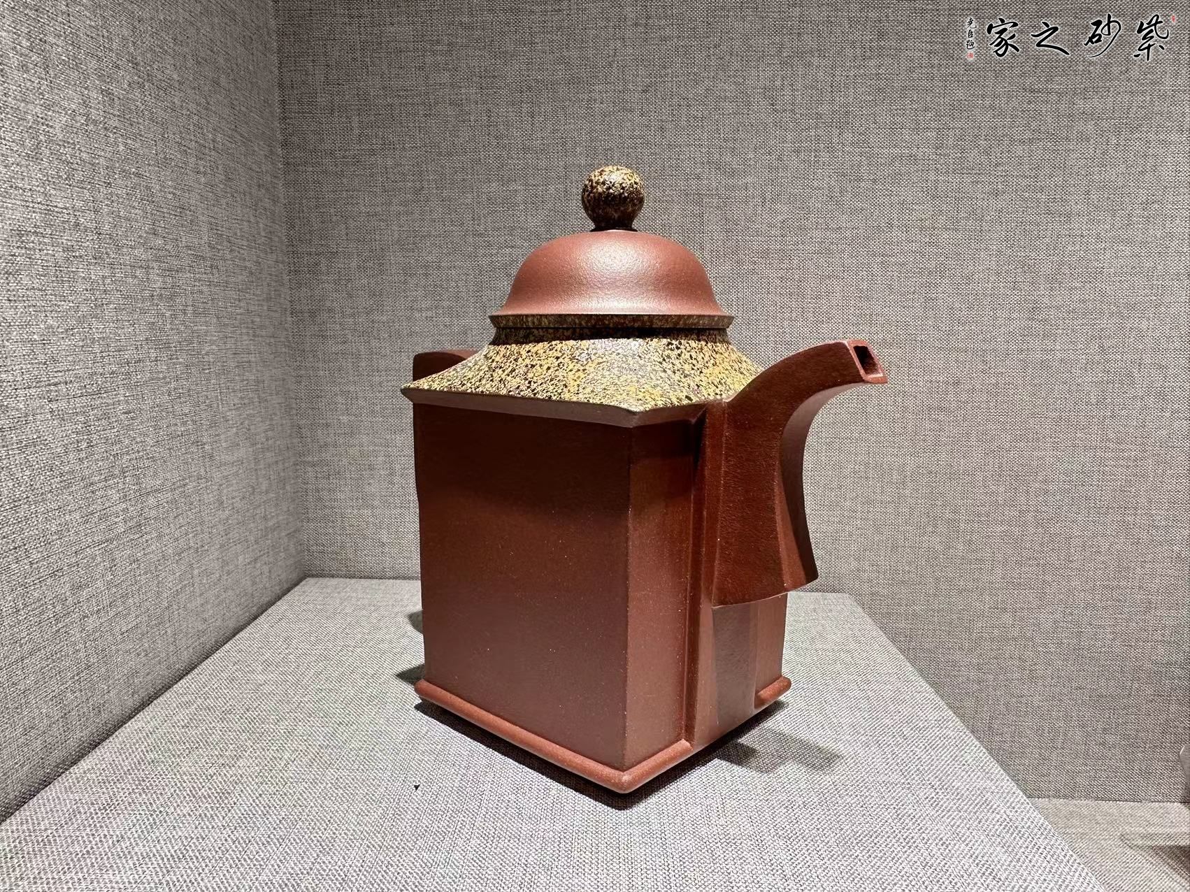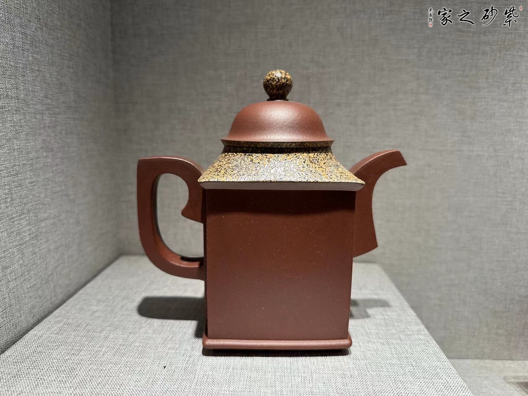 該壺創(chuàng)意以房屋建筑為理念,歐亞形式, 方基穹頂,意為天圓地方,物阜安祥,裝飾以 彩釉為特色,形體直線、弦線連接剛?cè)嵯酀?jì), 咀、把弧線呼應(yīng)互動(dòng),富于了壺的靈動(dòng),整體 效果氣勢(shì)礴大,挺拔莊重,氣韻協(xié)調(diào),個(gè)性獨(dú) 特,既穩(wěn)重又乖巧,較好地反映壺藝的創(chuàng)意特色。
