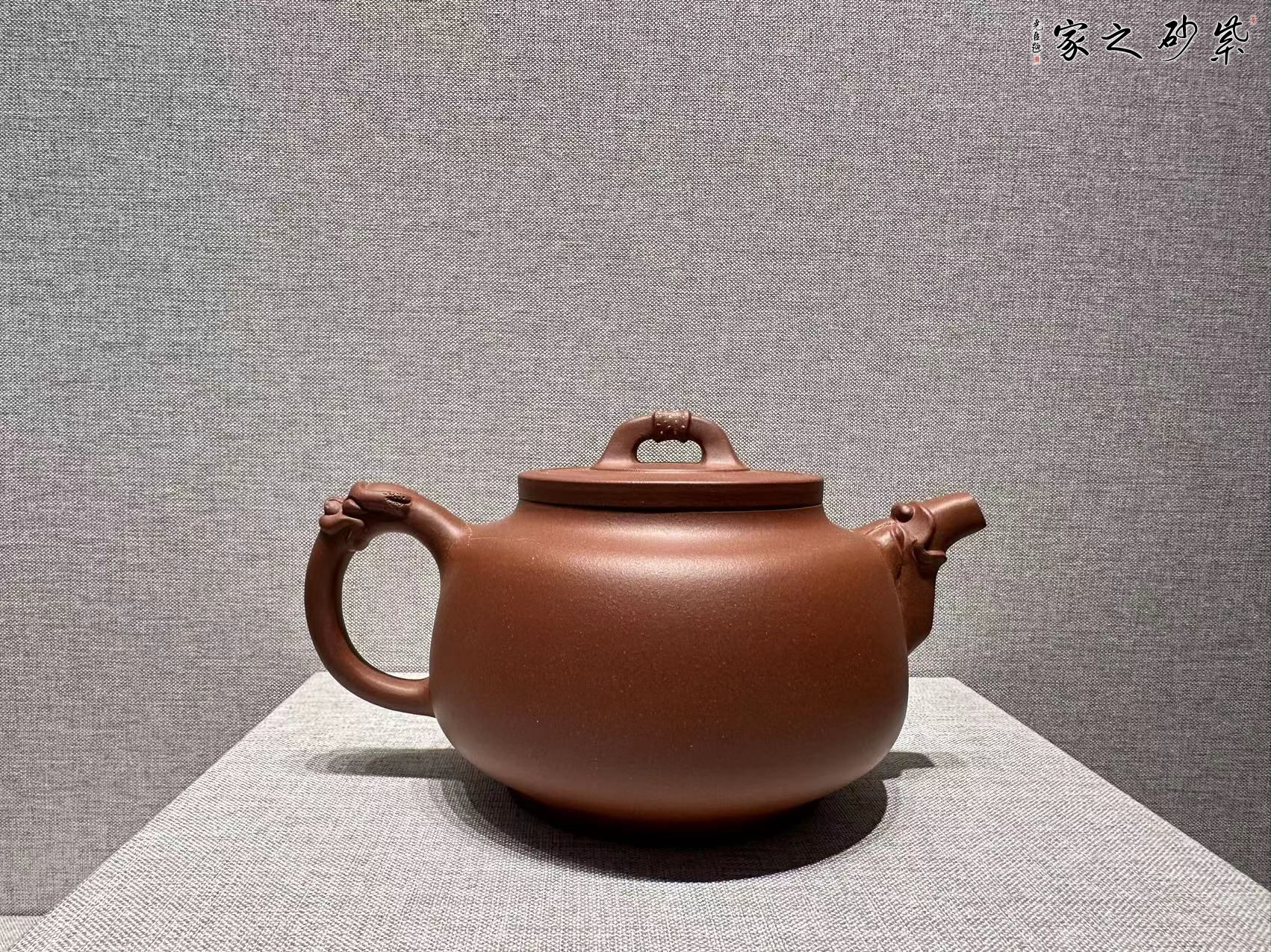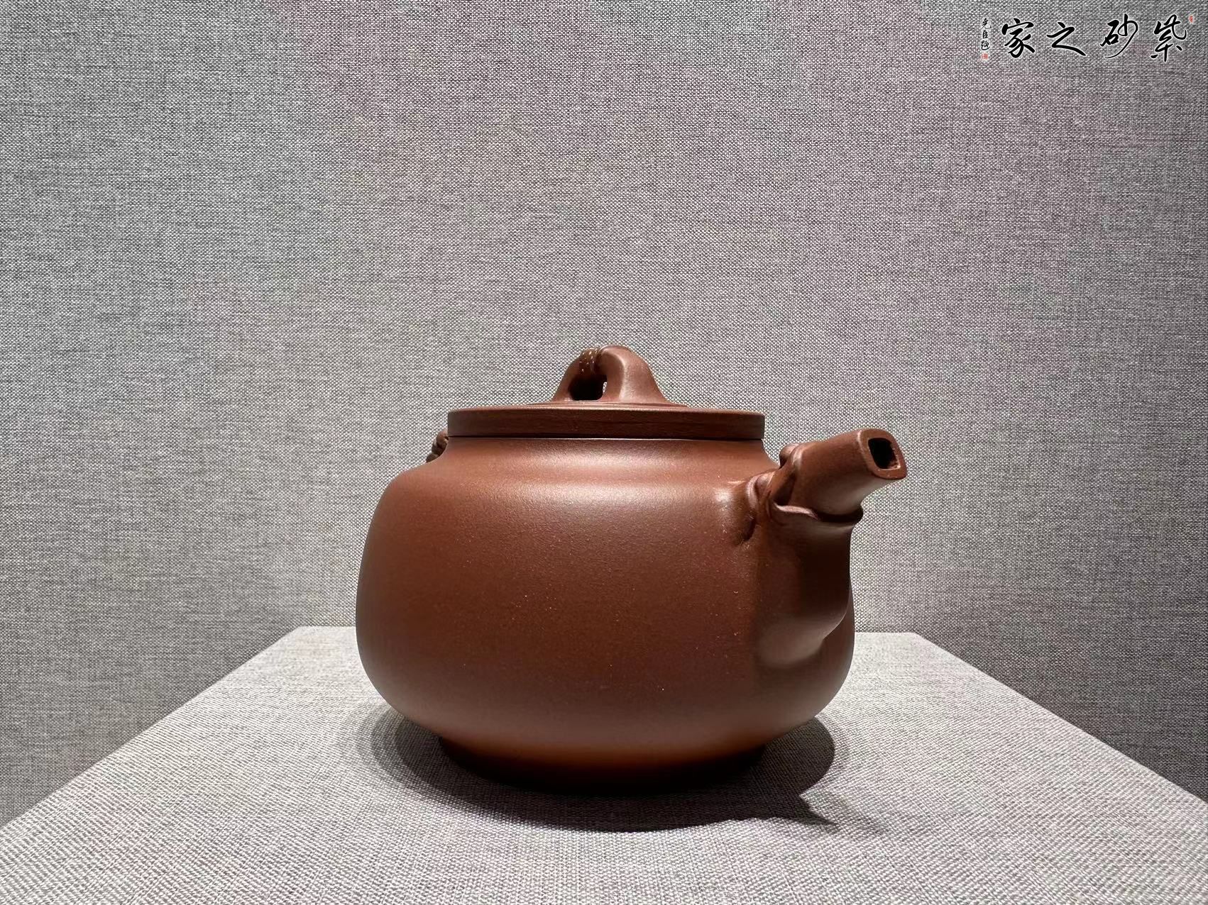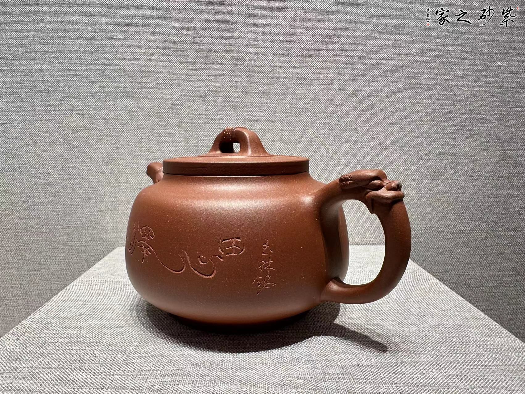 該作品設(shè)計(jì)基本符合黃金比例的美學(xué)規(guī) 律,形體縮腳起體、下大上收,給人感覺雄健 穩(wěn)重,瑞氣祥和。舒展的龍形咀\把既有富有 張力,又蓄勢(shì)內(nèi)蘊(yùn),作品整體既有大氣磅礴, 又有細(xì)琢如玉,既顯示著中年人的平穩(wěn)不躁的稟性又不失年青人陽剛朝氣的神韻,更具粗中 有細(xì)的紫砂文化語言,以及捧養(yǎng)把玩的手感。