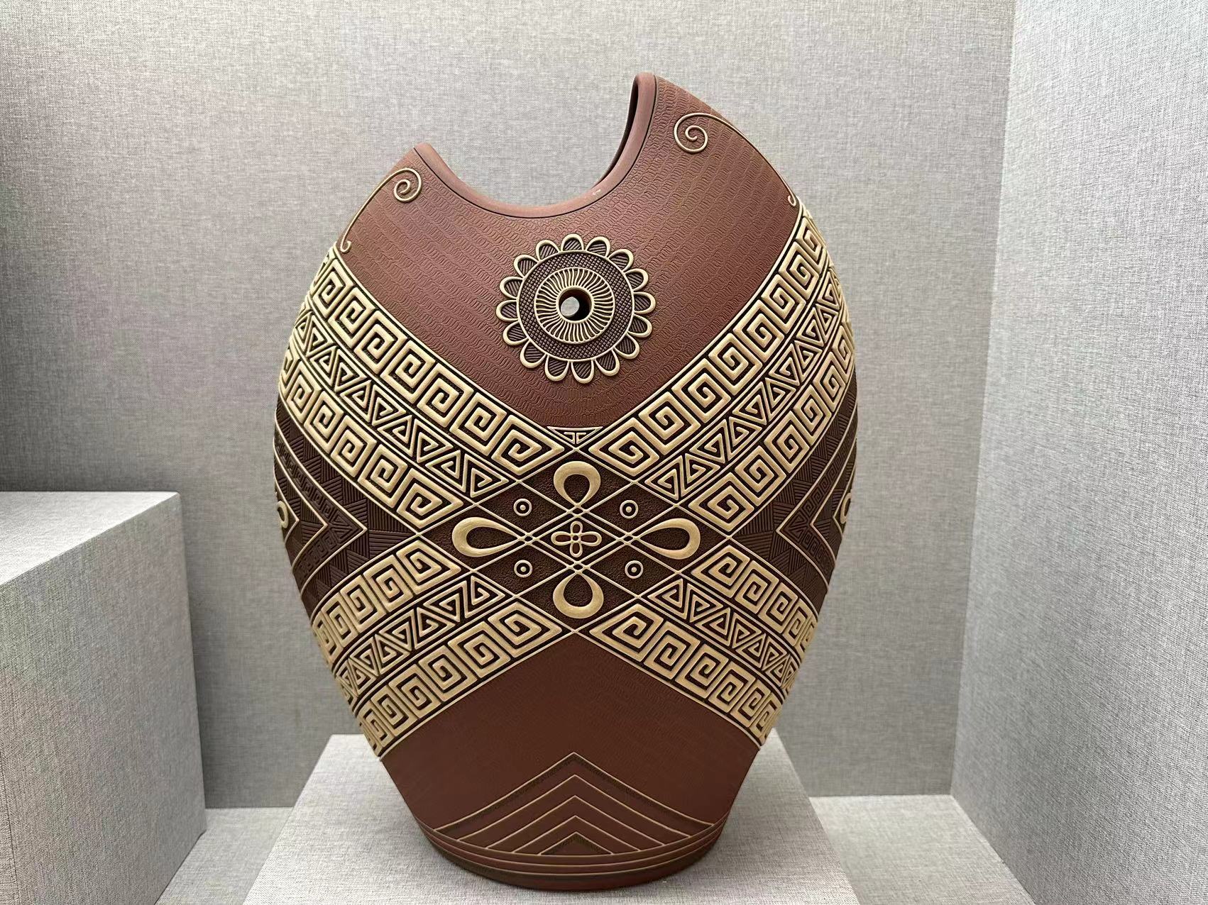 藝術(shù)就是求同存異、個(gè)性特色,在彩陶造型方面,開創(chuàng)了扁、尖、異形態(tài),在裝飾方面開創(chuàng)了挑、劃、填、噴、繪、形飾一體等十多種質(zhì)感的外觀效果,作品雅俗共賞,并在四年一屆的全國陶瓷創(chuàng)新評(píng)比中十多件次獲獎(jiǎng),其中 “紫玉瓶”、 等作品三屆獲金獎(jiǎng),作品先后被“國博”“國務(wù)院”、“首博”等博物館收藏,在彩陶之余,研修紫砂壺藝,以獨(dú)特的視角創(chuàng)作作品,豐富了紫砂壺的文化藝術(shù)。