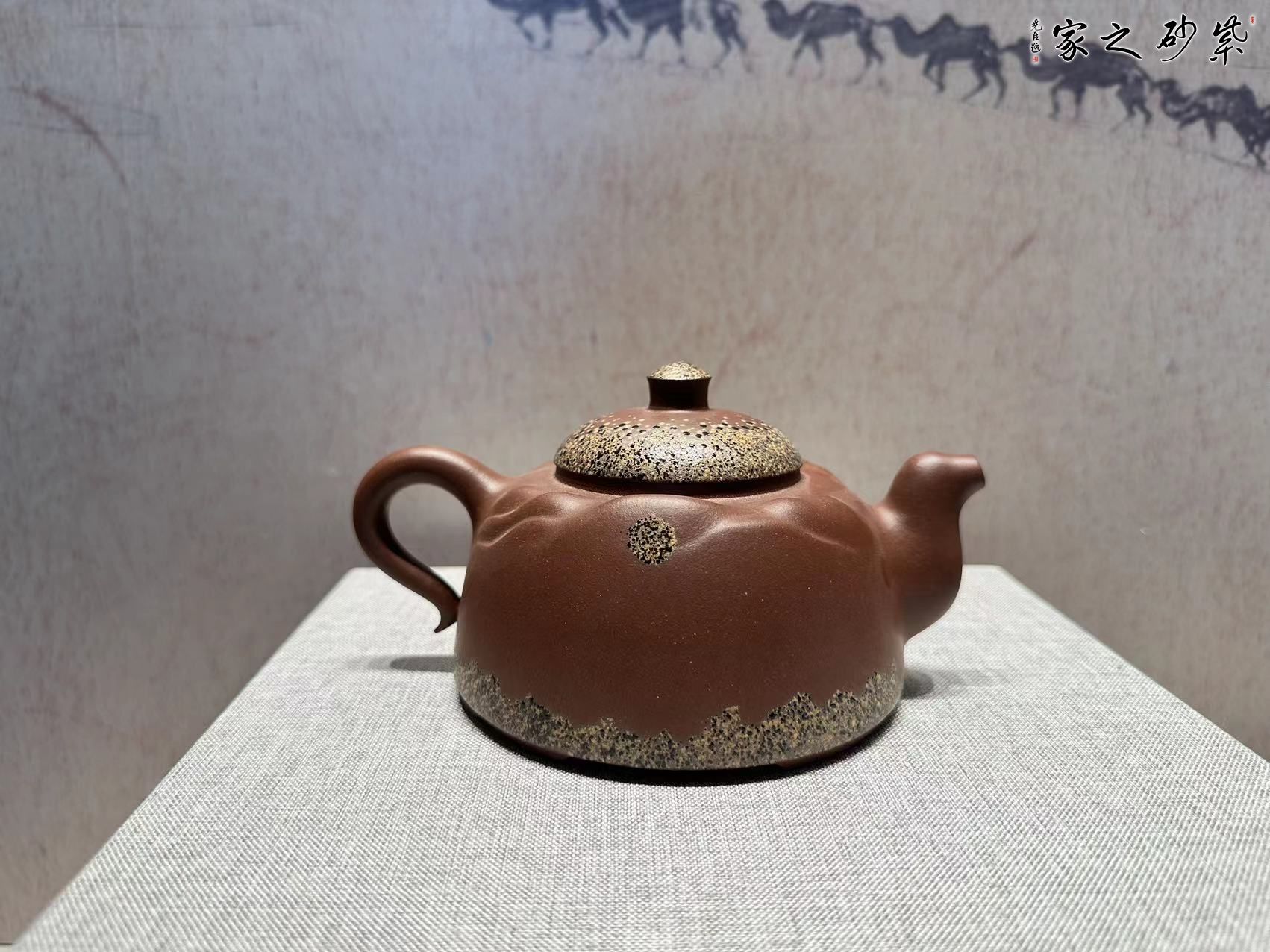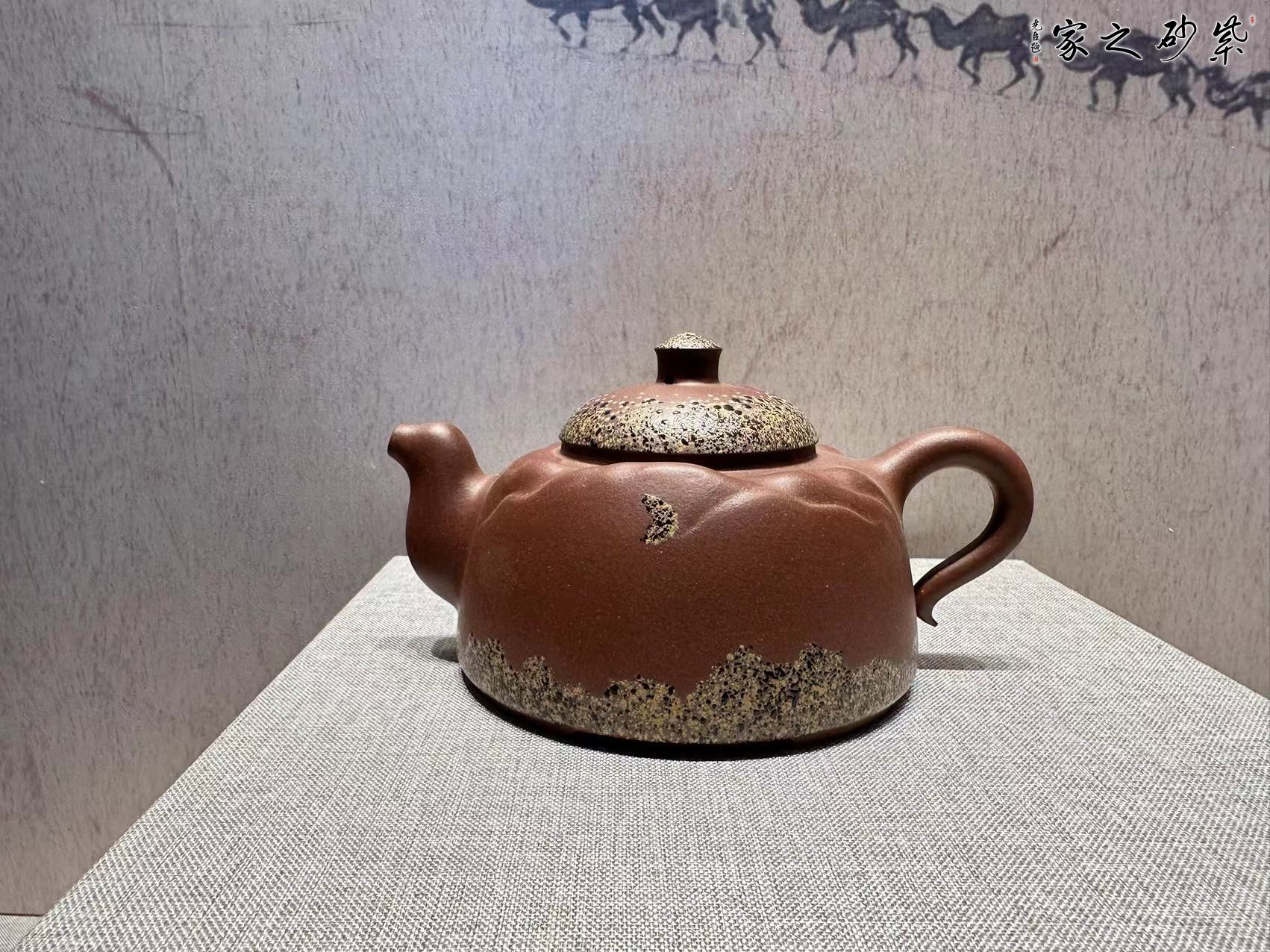 該壺造型設(shè)計(jì)以一帶一路為理念,將沙漠之舟的駱駝作為形態(tài)對(duì)象,壺形體既符合駱駝形象又將抽象沙山及山戀與駱駝形象溶合形成一體,成為壺的主體形態(tài),壺鈕圓形喻為帳房驛站,裝飾采用特色彩釉喻為山林草路,還草原草場(chǎng),整體效果讓人產(chǎn)生大漠形態(tài)聯(lián)想,形似神似,賞用結(jié)合,有韻味。