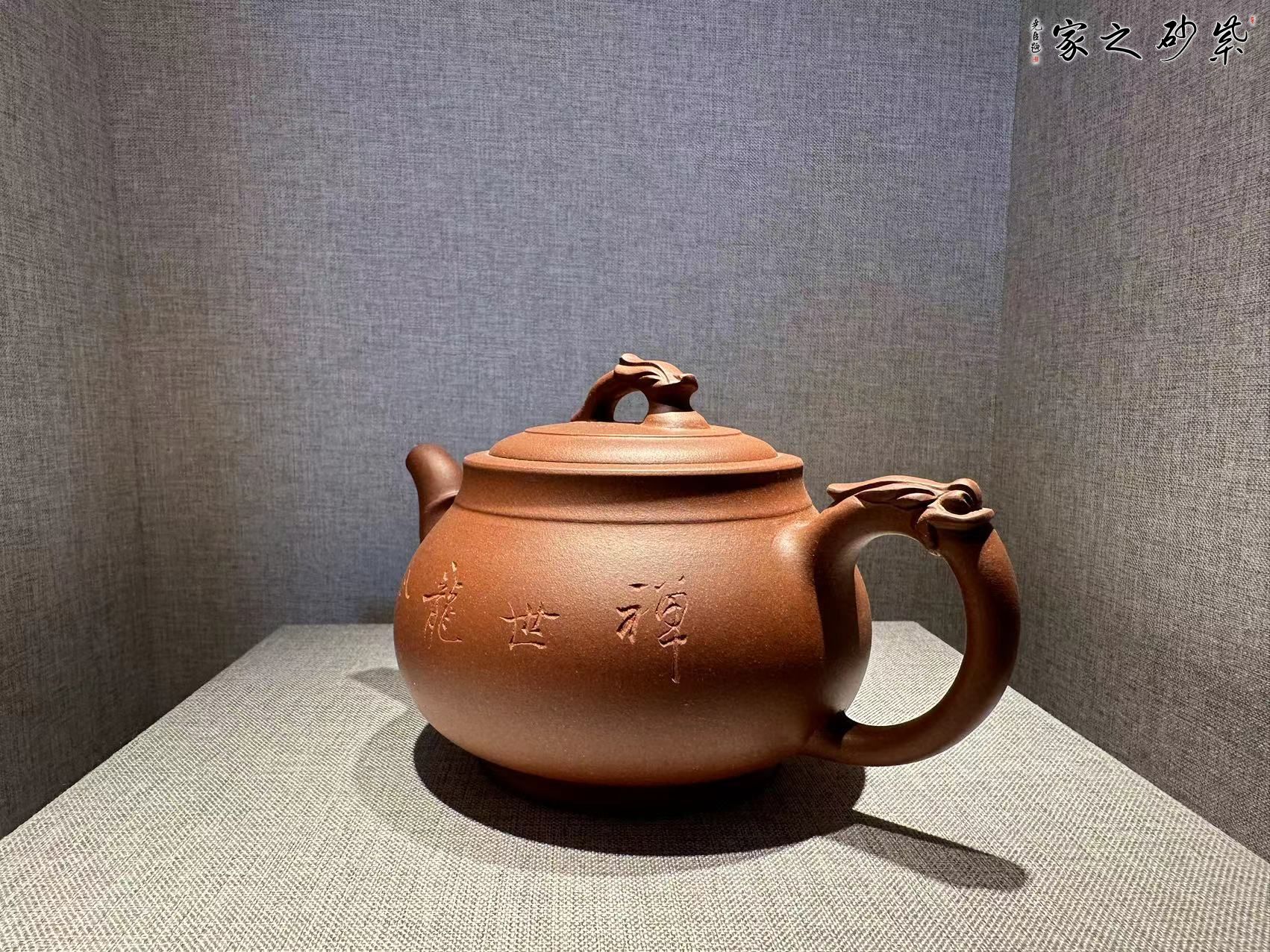該壺造型設(shè)計(jì)以傳統(tǒng)為理念,并將龍文化與壺藝相結(jié)合,形體墩實(shí)遒勁,龍咀,龍把搭配諧調(diào)生動(dòng),鈕為吉祥物貔貅,整體效果大氣莊重,協(xié)調(diào)祥和。