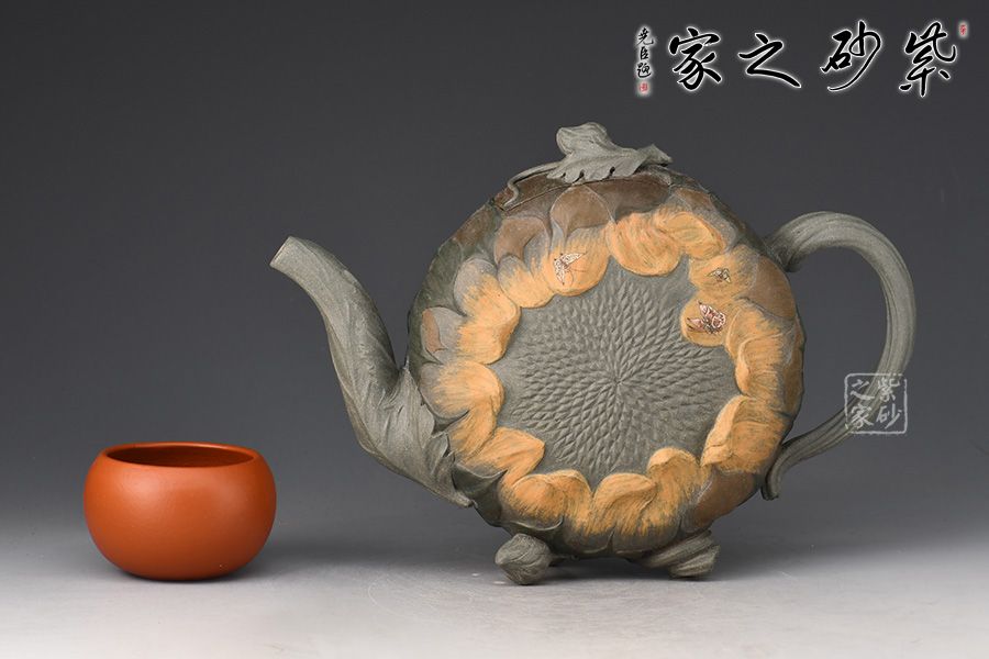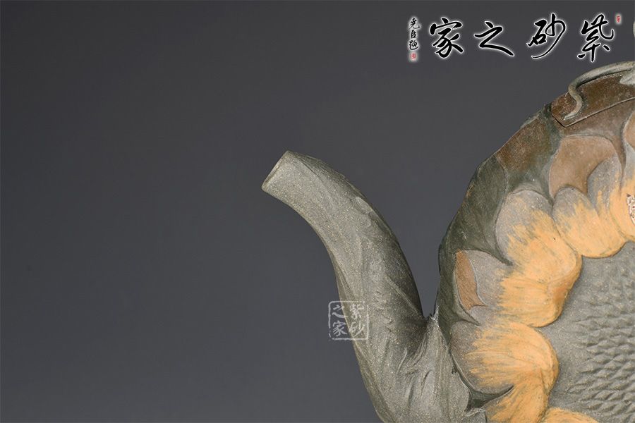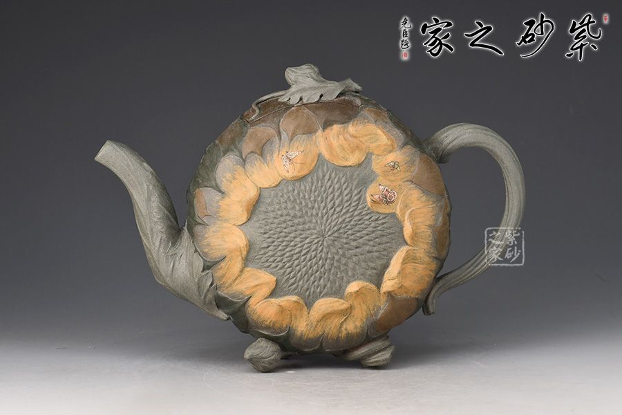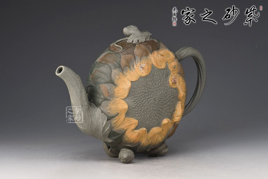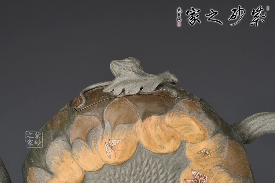 該壺仿佛是大自然的一個(gè)小小縮影,細(xì)節(jié)生動(dòng),意趣盎然。整壺為向日葵造型,壺身上花瓣,葵花籽栩栩如生,壺嘴和壺把分別是葉片和瓜蒂,未 長(zhǎng)成的枝干、瓜蒂、葉片點(diǎn)綴于瓜底,恰好構(gòu)成了四個(gè)腳,不但使壺身挺立,更添壺之神趣。