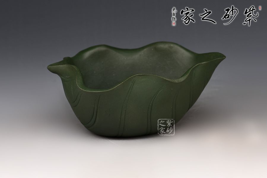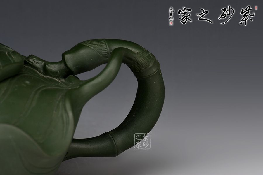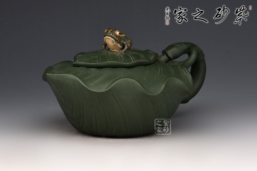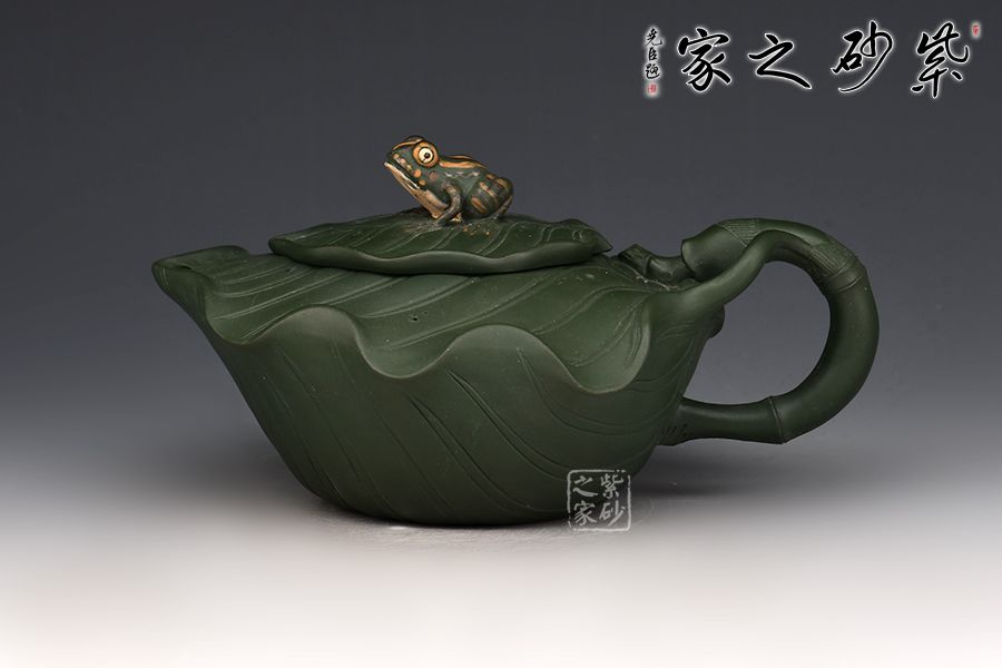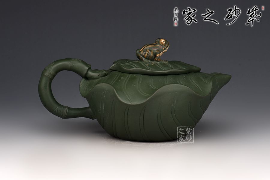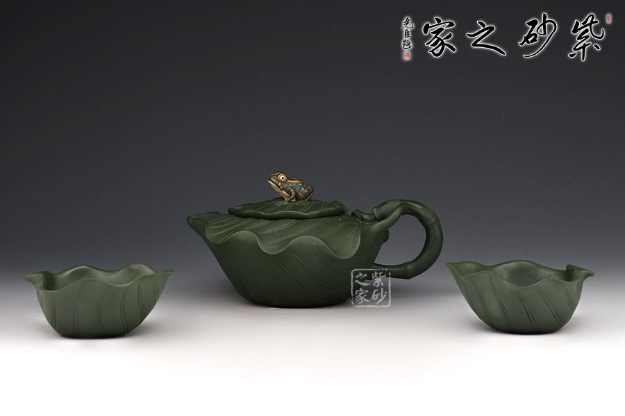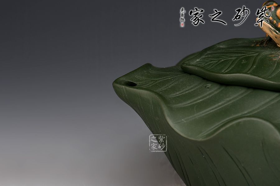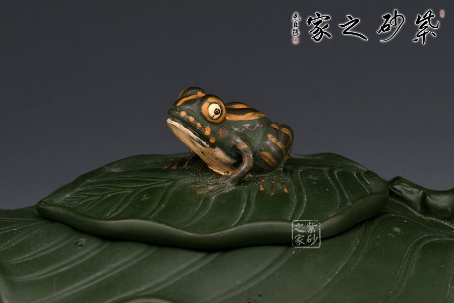 此樹蛙套組,一壺兩杯,精選民國綠泥,老師全手工制作而成,同工同料。 整壺以荷葉為靈感設(shè)計而成。壺身似兩片荷葉相扣而成,輪廓豐滿誘人,身筒陽刻出仿若荷葉脈絡(luò)般的紋理線條,栩栩如生;壓蓋自然對接,亦雕塑成荷葉狀,蓋上置以一只青蛙安坐,造型逼真;葉尖翹起作流,壺把乃是荷葉莖,彎曲有度,收放自如。