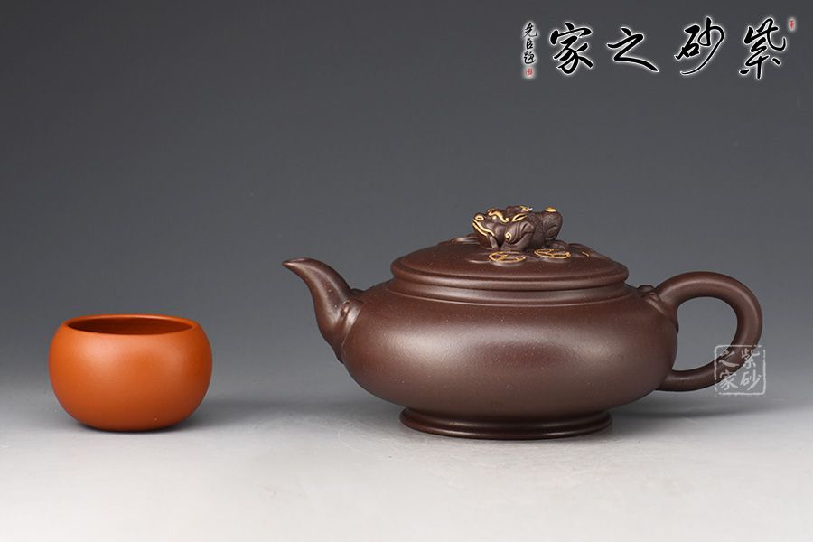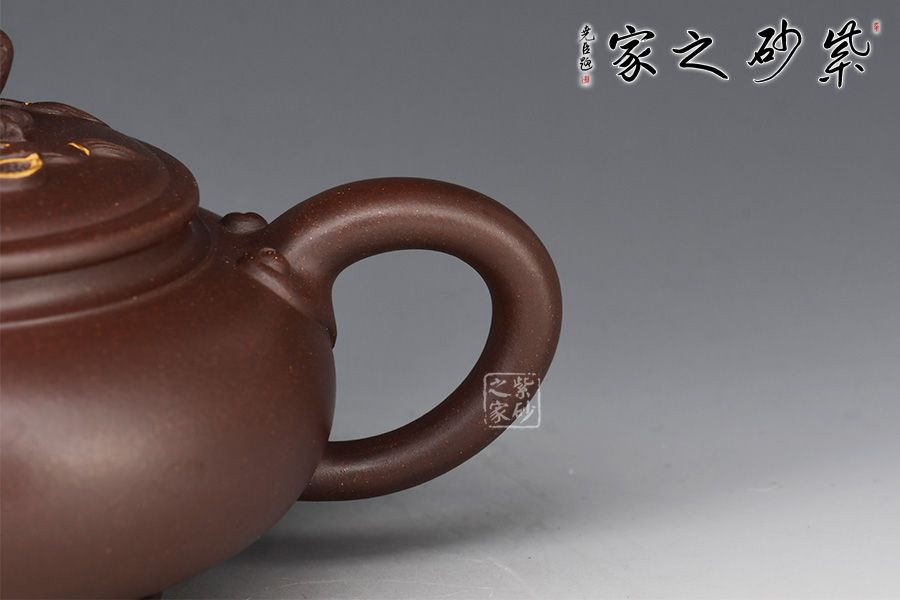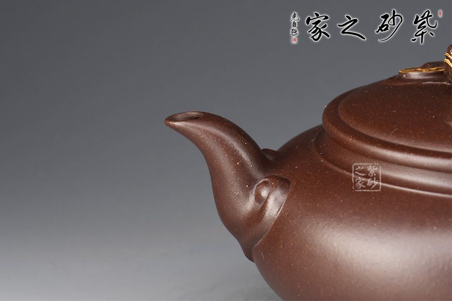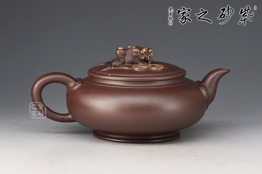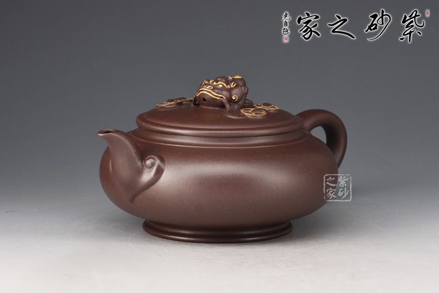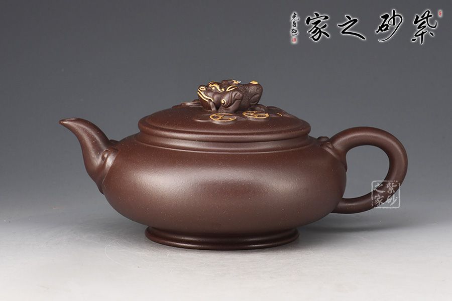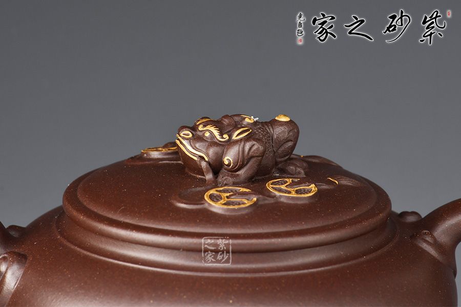 整壺精選老紫泥,老師全手工精制而成,泥色古樸,泡茶利器。壺腹飽滿,線條流暢,嘴把明接壺身,一彎嘴出水爽利,耳把拿捏舒適。嵌蓋設(shè)計(jì),嚴(yán)絲合縫,壺鈕為開(kāi)運(yùn)金蟾,招財(cái)進(jìn)寶。