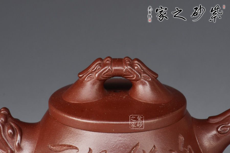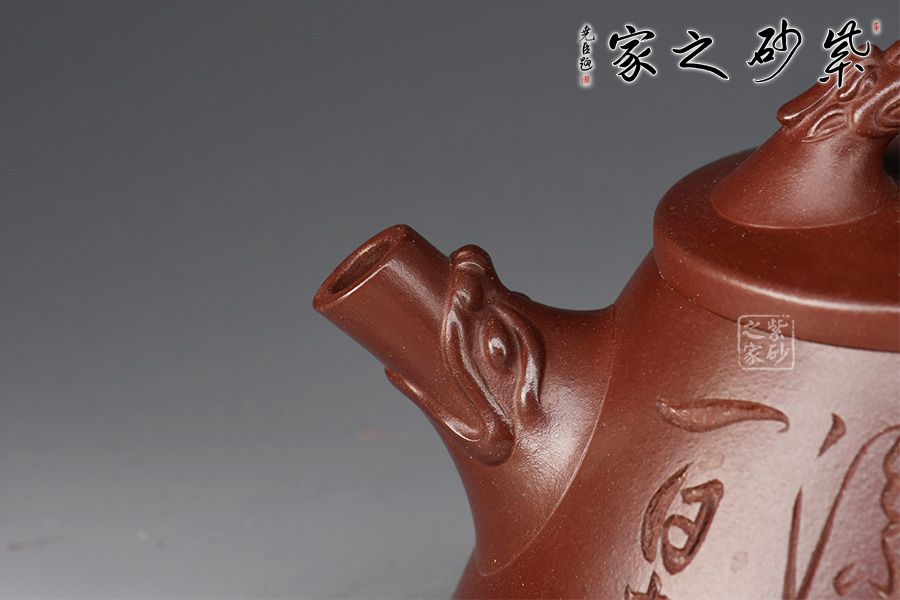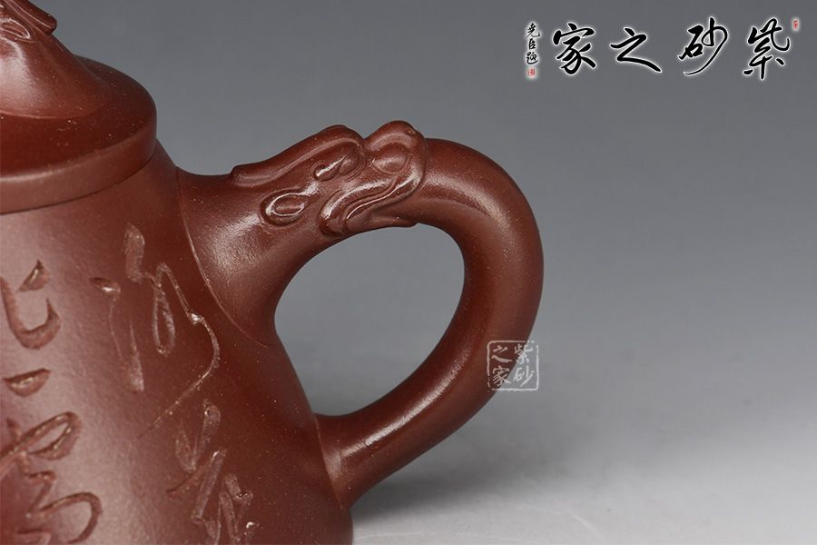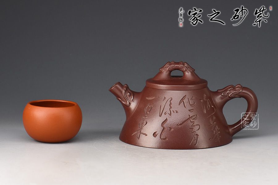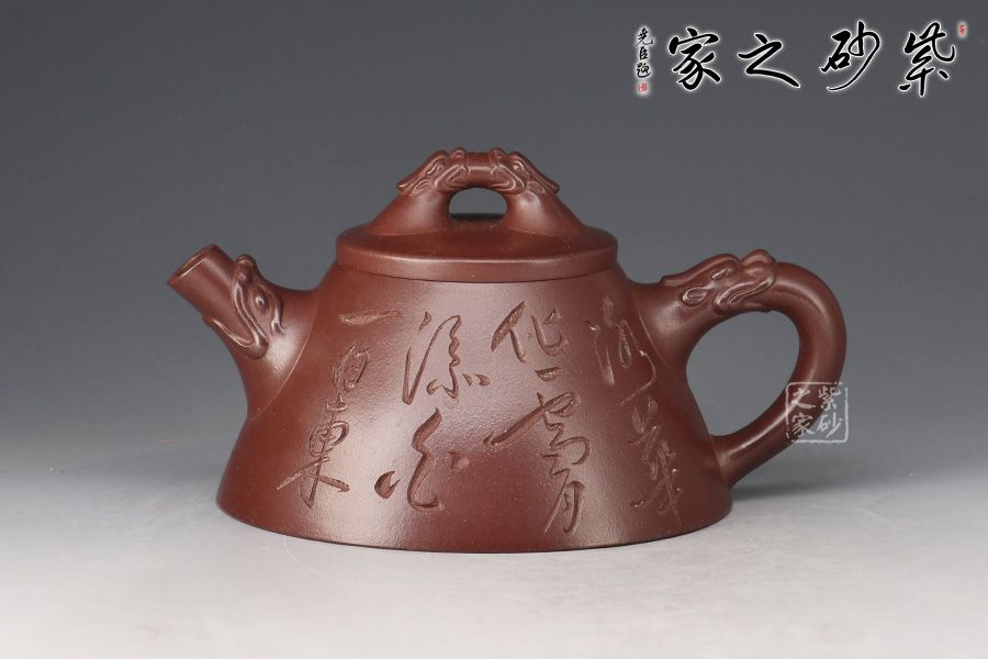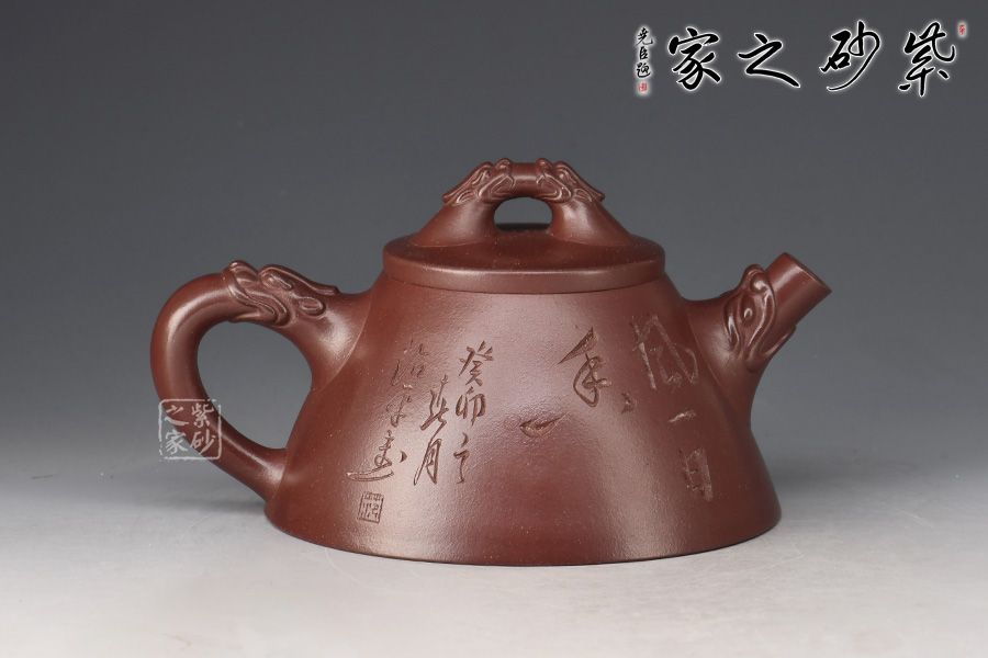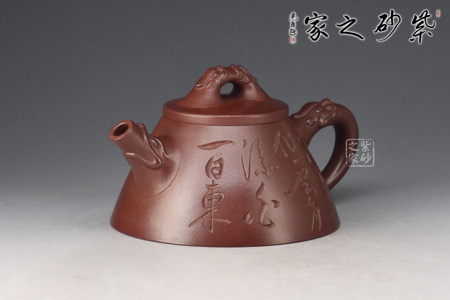 壺體硬朗霸氣,形似錐形寶塔,架子穩(wěn)重,氣勢渾厚,線條干凈利落,腹部略鼓,壺底穩(wěn)健,如西楚霸王,端坐榻上,有橫掃天下之勢。壺身挺括,壺帽平蓋于上,蓋沿略厚,橋型壺鈕粗獷有力,壺流直挺,壺口似喇叭狀,三角壺把,胎體厚重堅挺,如泰山屹立,五岳獨尊,撼天地,鎮(zhèn)乾坤。