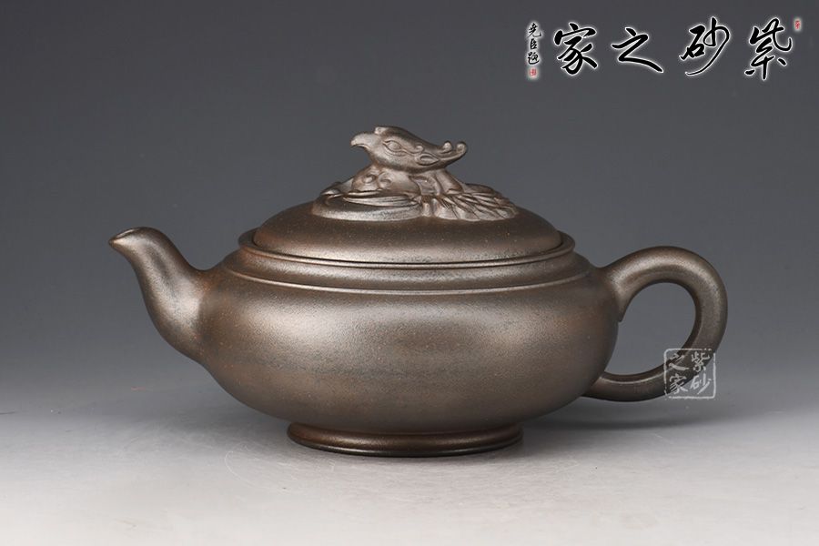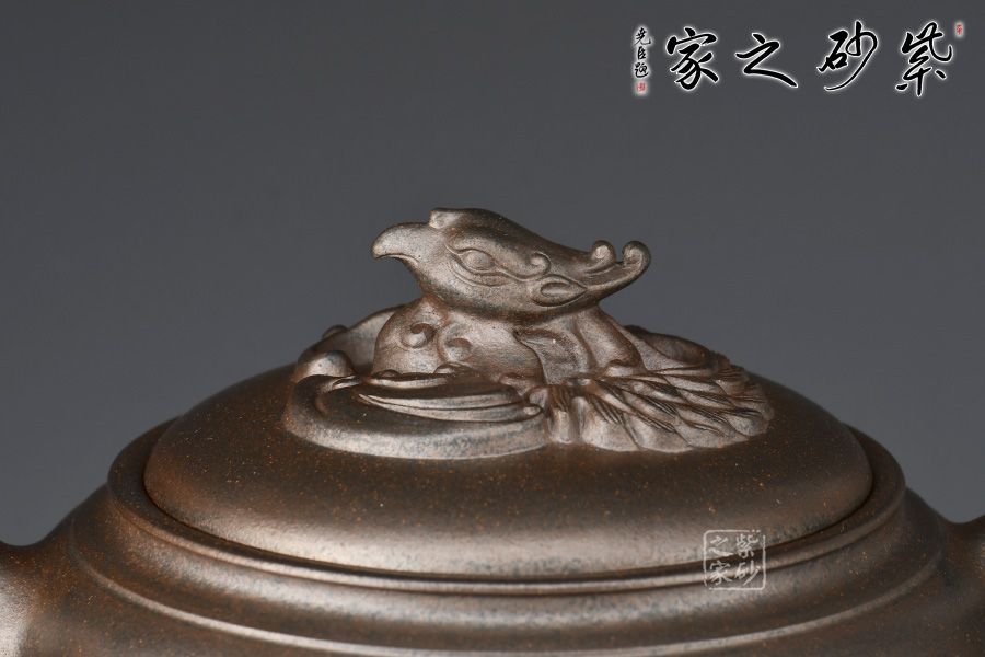 此壺扁圓內(nèi)斂,線條飽滿,壺壓蓋與壺身子母線契合。壺把造型優(yōu)雅,與壺嘴似鳳首對應(yīng),呈現(xiàn)出圓潤典雅姿態(tài)。嵌蓋設(shè)計,嚴絲合縫,壺鈕為鳳首,栩栩如生,寓意吉祥。