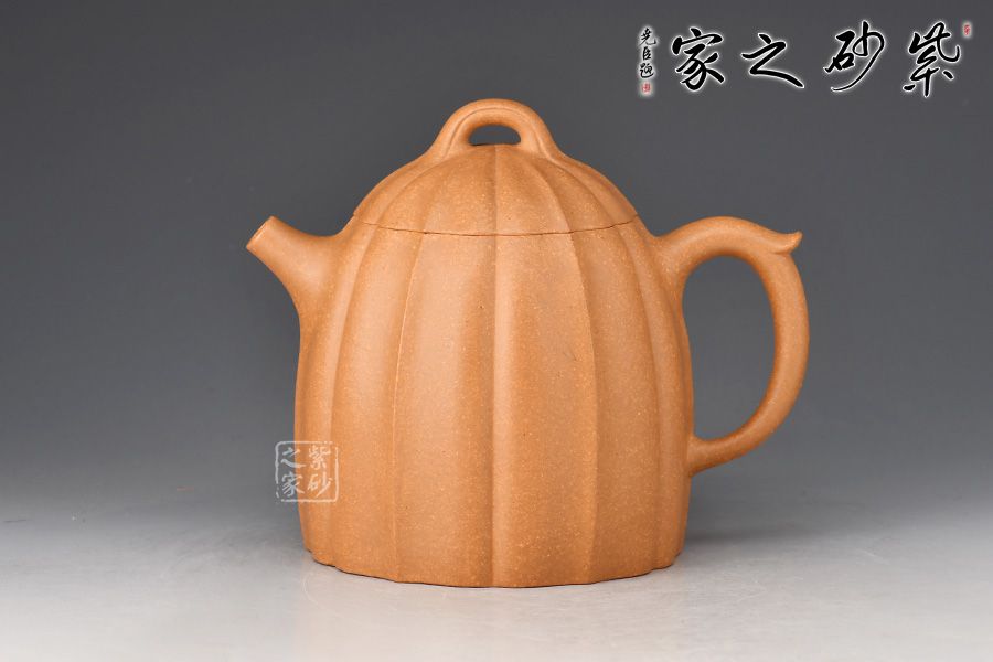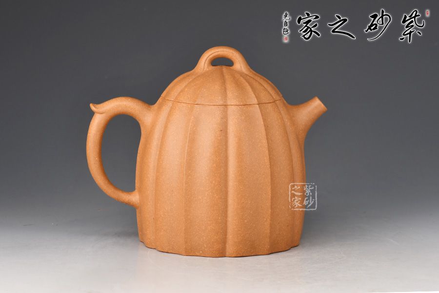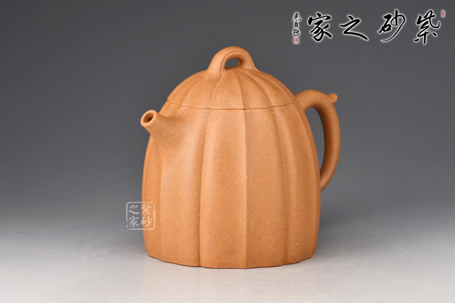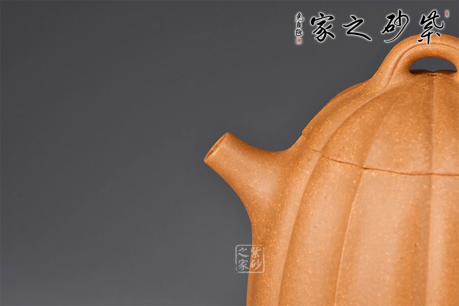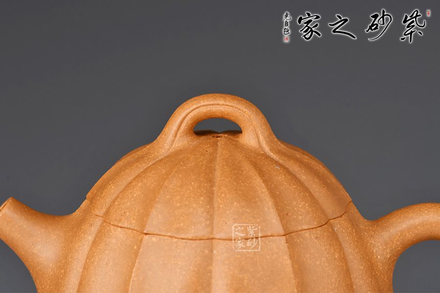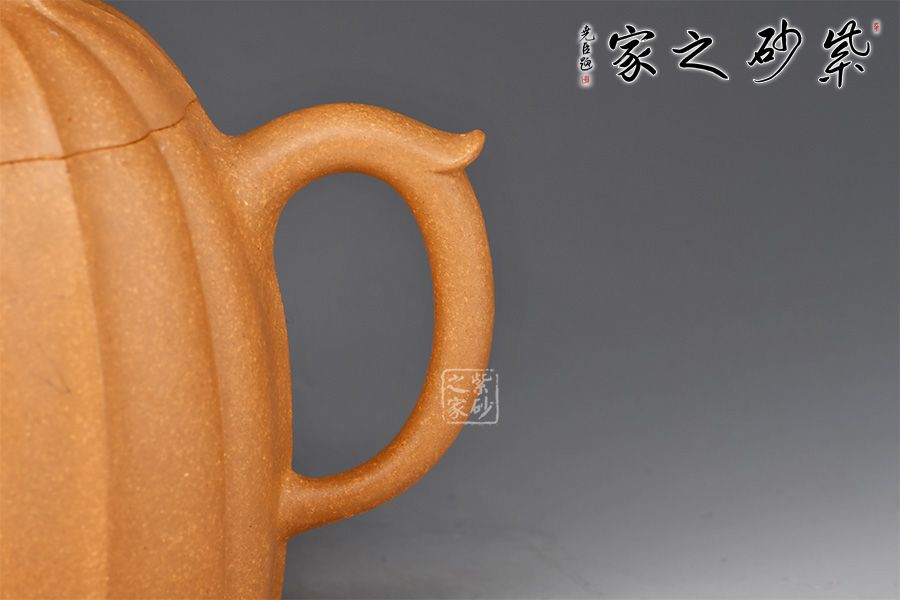 整壺仿秤砣形制,壺形整體古樸大方,壺身高聳,自然流暢,短流有勁,環(huán)耳形把手飾一段如意,壺蓋微鼓,口沿與蓋口渾然一體。壺鈕為橋鈕。整壺將傳統(tǒng)“秦權(quán)壺”的特征表現(xiàn)得淋漓盡致,顯得不怒自威,猶如六合在握,穩(wěn)守金湯。通體做菱花式,蓋身渾然一體,壺蓋與壺口通轉(zhuǎn)自如,十分嚴(yán)密,技藝精湛,壺身與壺蓋飾筋紋,前后對(duì)稱,棱線凹凸分明、有棱有廓。同時(shí),橋鈕與菱花瓣相融,飽滿瑩潤(rùn)。