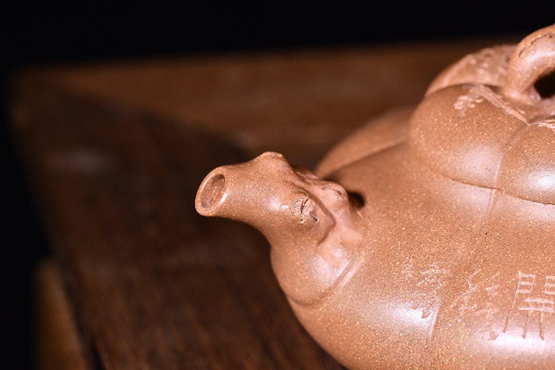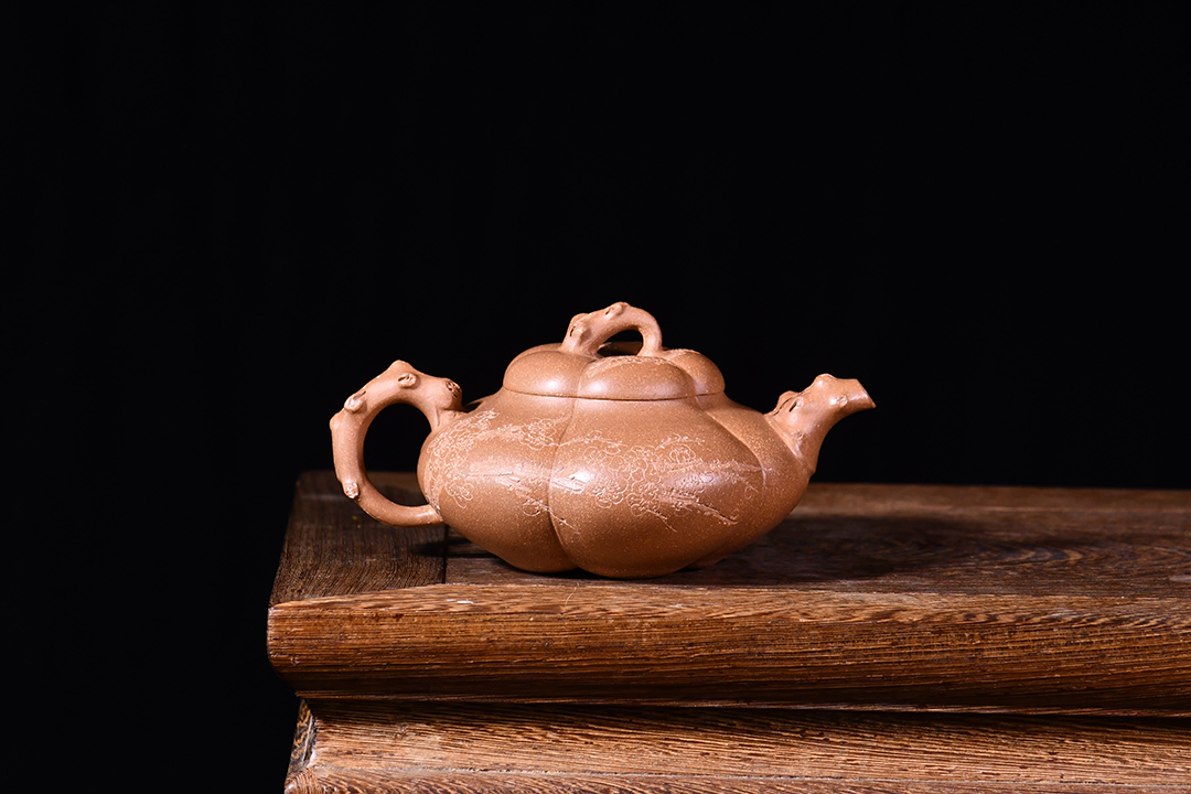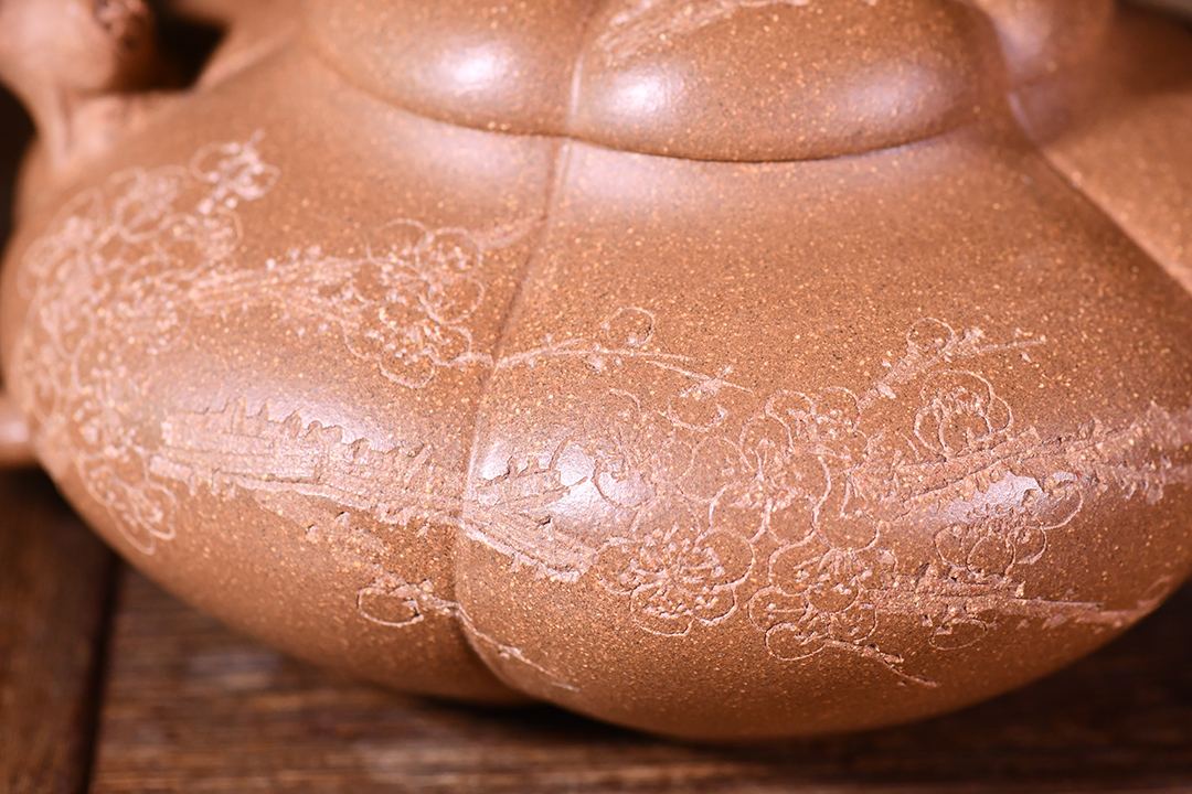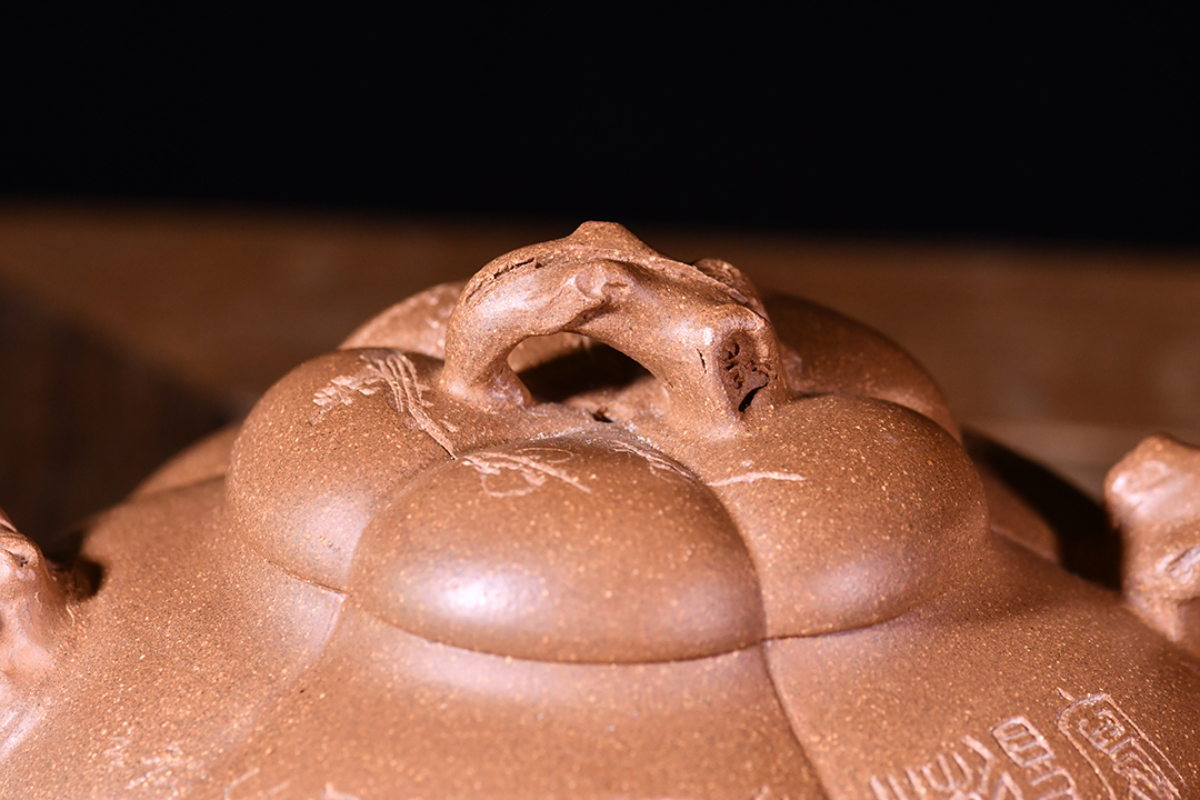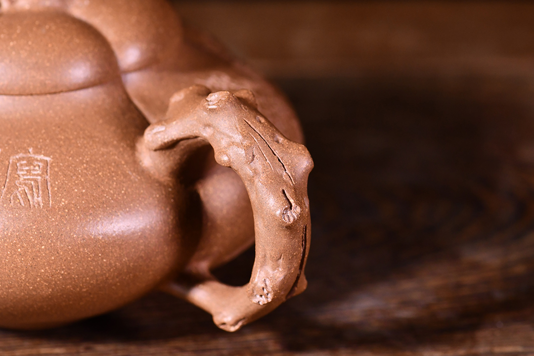 壺身采用上下相合,在扁圓型的壺體上分為筋紋形,似瓜若果,新穎別致,等分均勻規(guī)整,壺蓋亦做花形,與花口契合,全器線條飽滿豐腴,中腹向外鼓出,極富張力。流嘴、執(zhí)把、壺鈕皆以蒼勁的梅桿塑成,整器氣韻和合,與合梅之形制相融,形神氣韻兼?zhèn)渲鳎?/p>