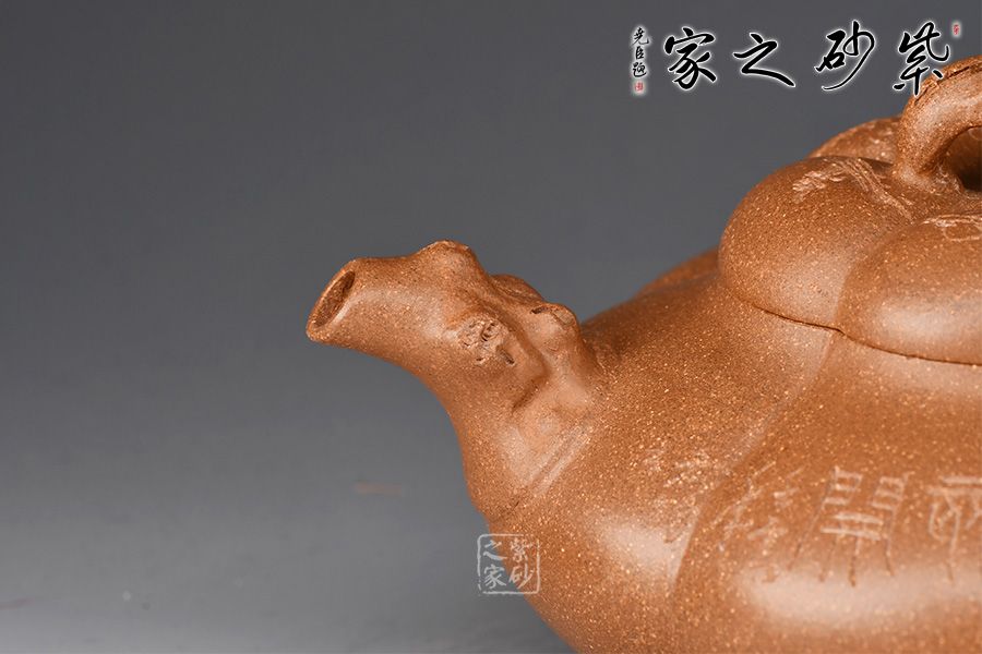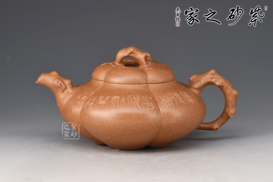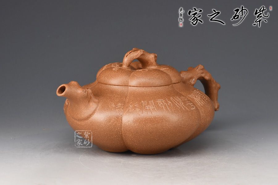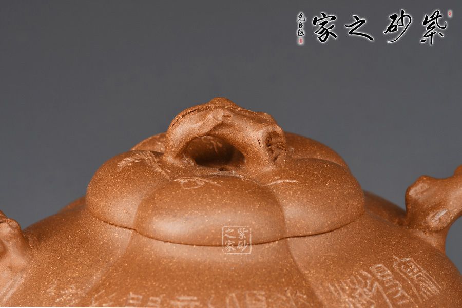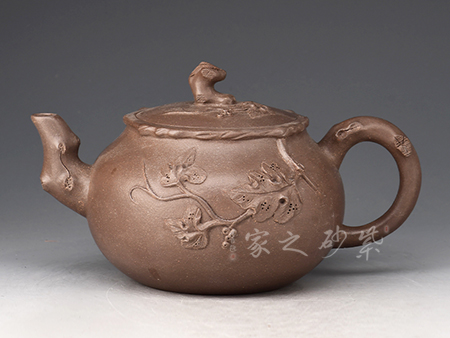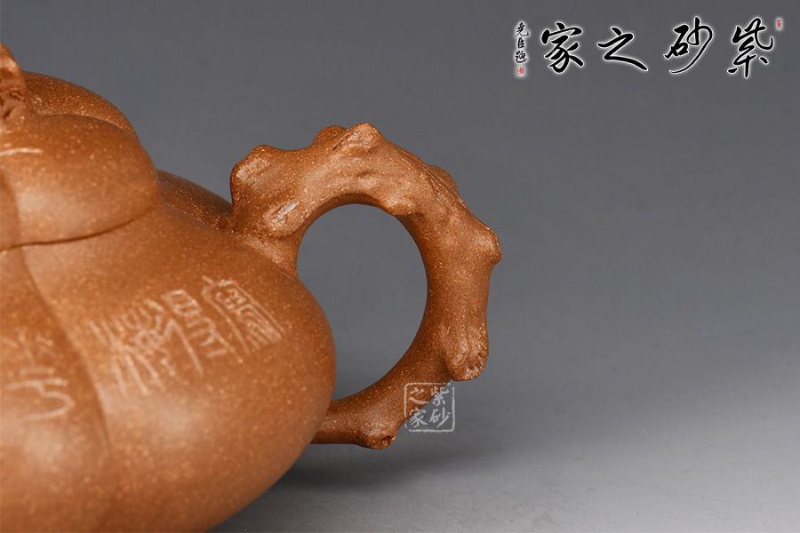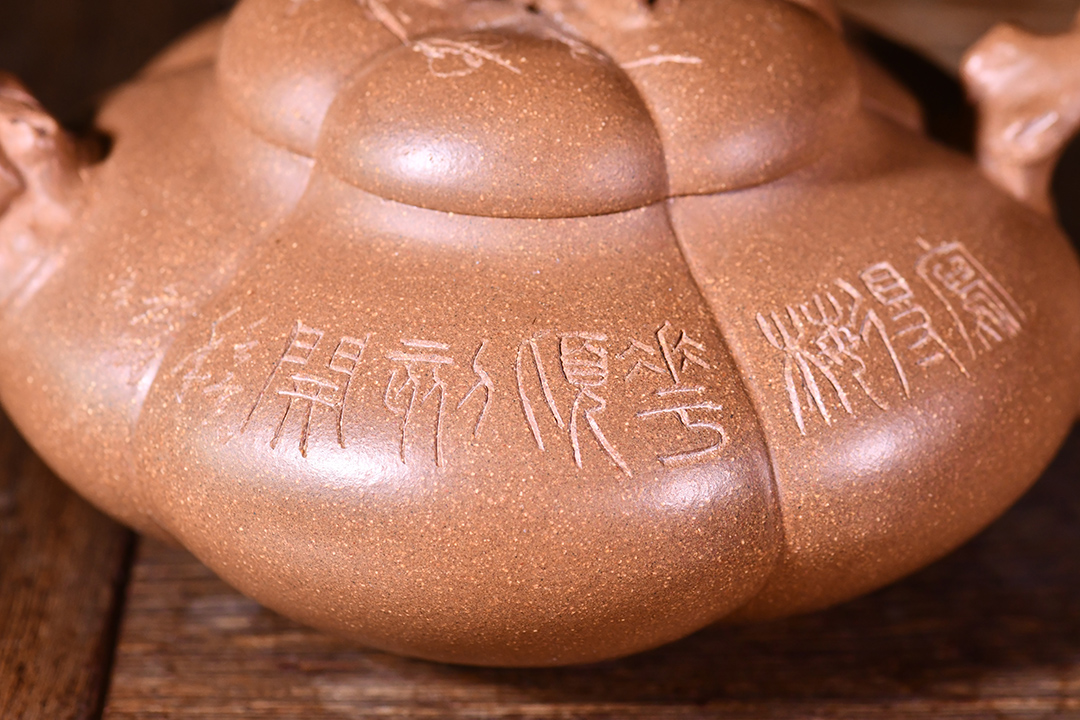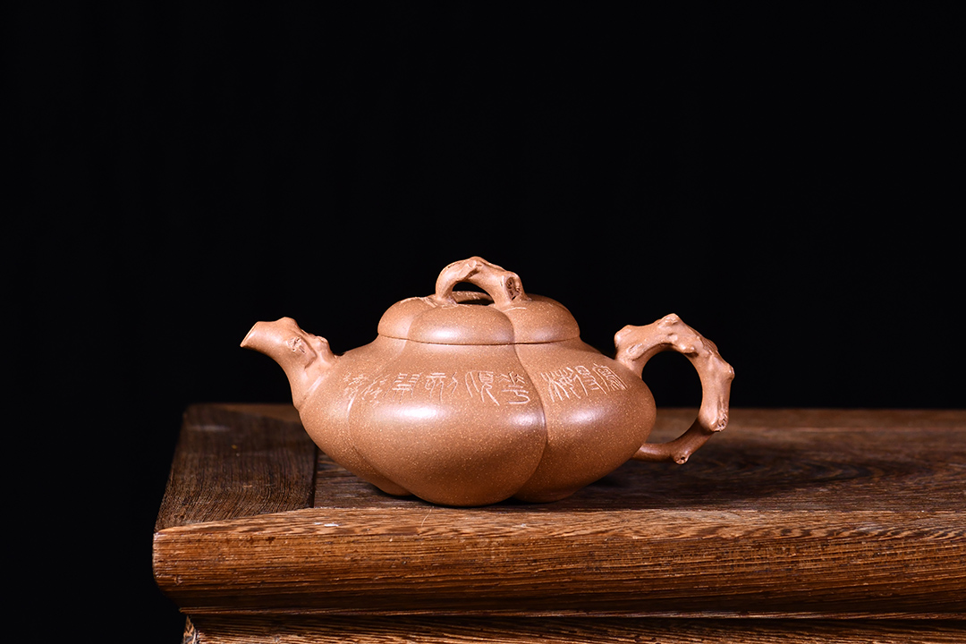 壺身采用上下相合,在扁圓型的壺體上分為筋紋形,似瓜若果,新穎別致,等分均勻規(guī)整,壺蓋亦做花形,與花口契合,全器線條飽滿豐腴,中腹向外鼓出,極富張力。流嘴、執(zhí)把、壺鈕皆以蒼勁的梅桿塑成,整器氣韻和合,與合梅之形制相融,形神氣韻兼?zhèn)渲鳎?/p>