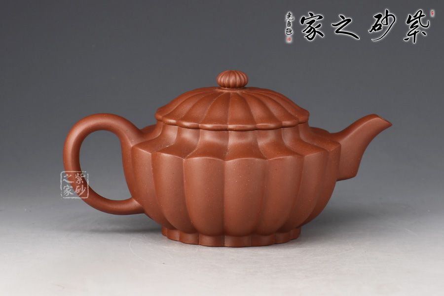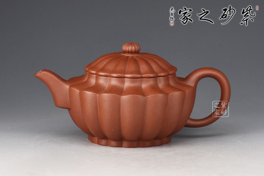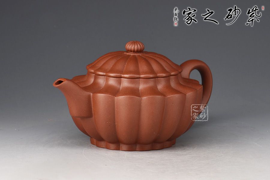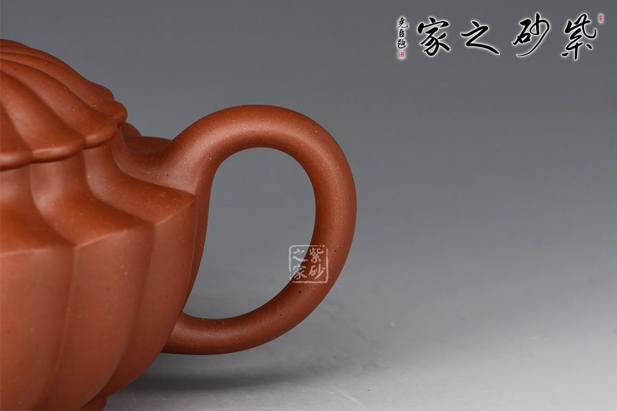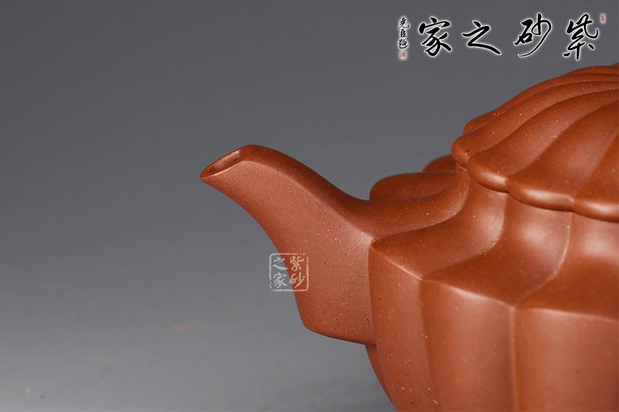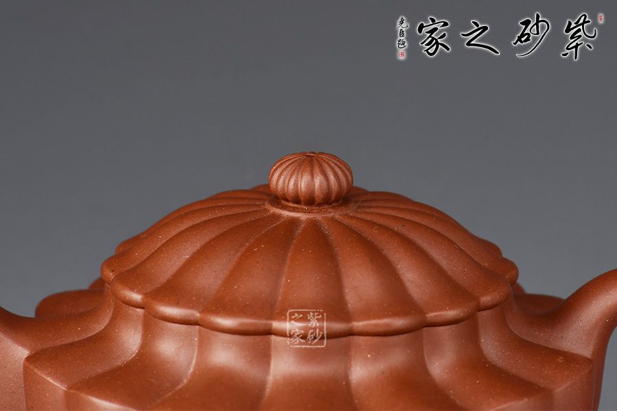 壺身高挺,氣韻飽滿端莊,菊瓣自鈕而下至壺底貫通。低頸,沿筋紋走勢作出仿佛花瓣的姿態(tài)。壺蓋嚴(yán)絲合縫,可任由一個方向置換,瓣瓣通轉(zhuǎn)吻合,制作難度極大。壺流從菊瓣中伸展,流嘴上挺,壺把亦做昂揚(yáng),自然天成,秀姿優(yōu)雅。