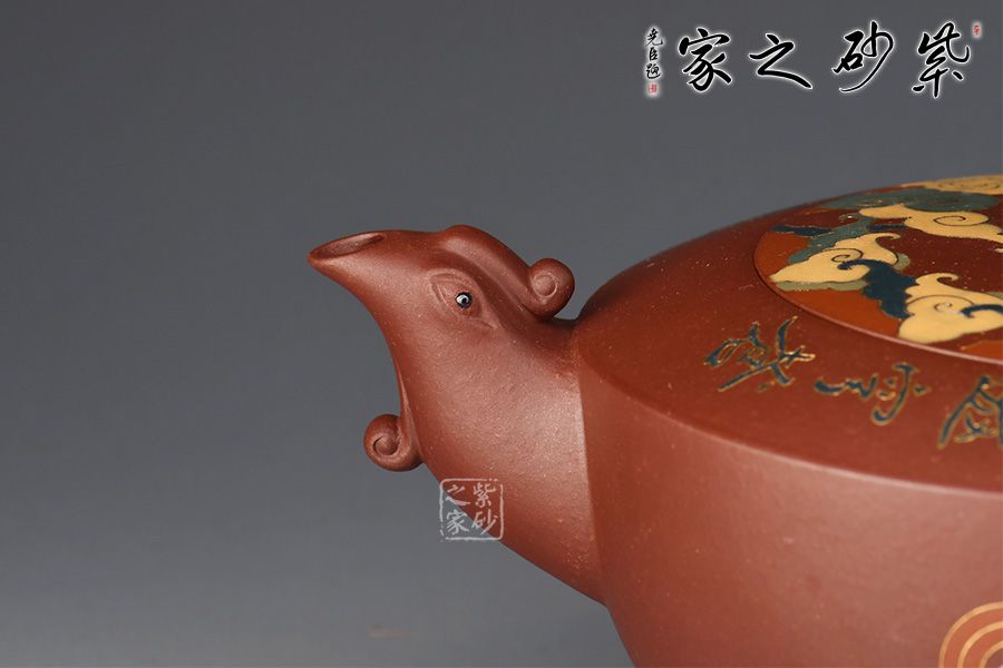 在中國傳統(tǒng)觀念中,龍和鳳代表著吉祥如意,龍鳳一起使用多表示喜慶之事,出自《孔叢子·記問》。此款龍鳳呈祥壺,壺身為碗狀,上豐下斂,弧線過渡,底部圈足,肩部平滑,外形工整細(xì)膩,光澤迷人。壺嘴為鳳,壺把為龍,古意十足,線條流暢雅致,經(jīng)久耐看。胡氏金銀錯(cuò)裝飾,富貴華麗,賞用藏皆可。
