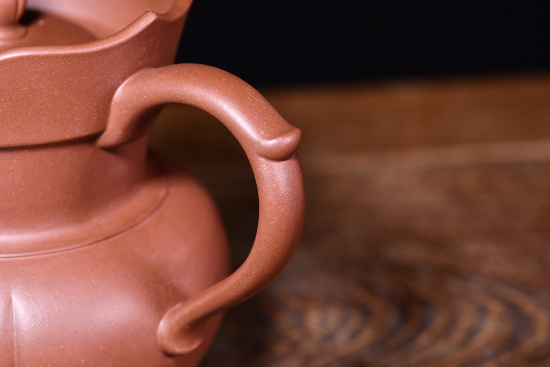 僧帽壺壺體采用六方造型,壺身上下收斂,壺腹圓鼓卻可見弧度,壺口由六片相同形狀帽沿圍繞而成,如同一保護墻,壺蓋同樣以六方形出現(xiàn)與壺口相對應,兩者結合緊密,如同一體,壺把方中見圓,柄貼便于抓握。