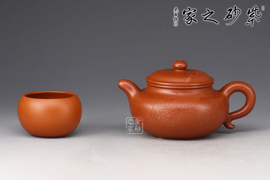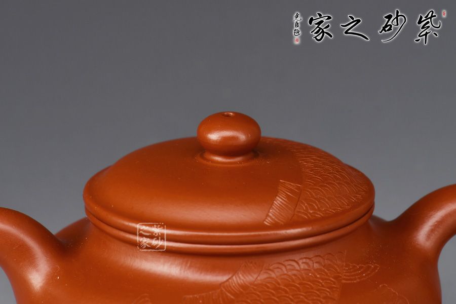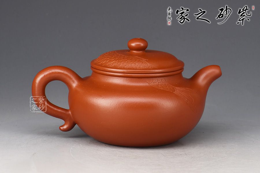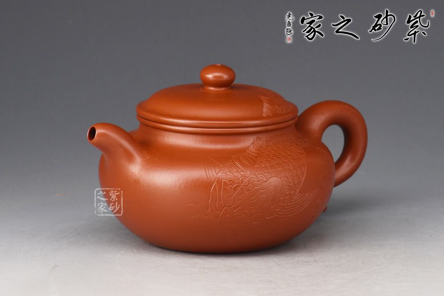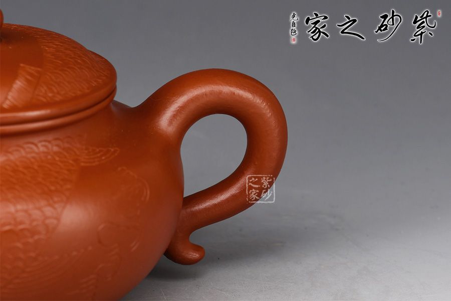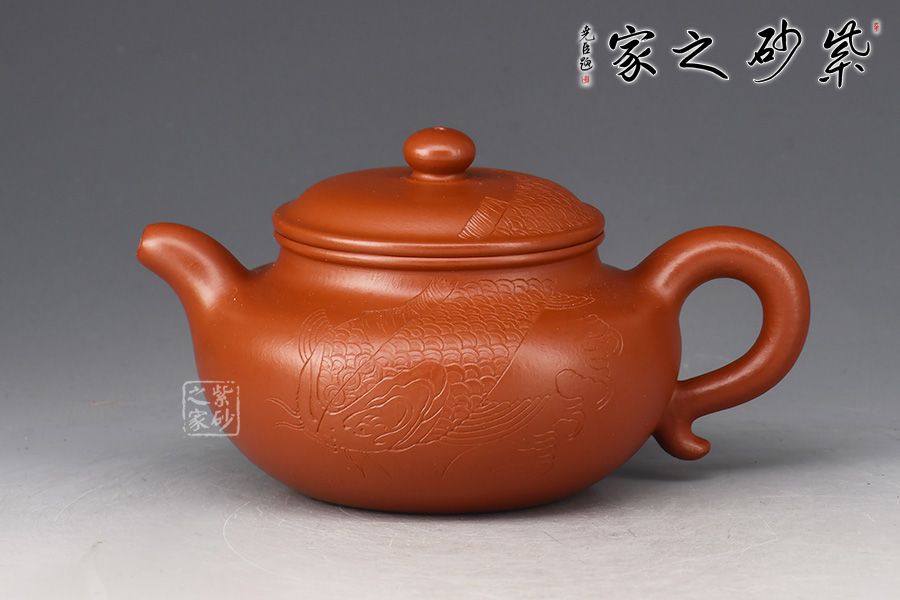 一彎嘴,耳形壺把隨身勢(shì),線條流暢,比例得當(dāng)。壺身過(guò)墻刻繪錦鯉,寓意吉祥,值得收藏。