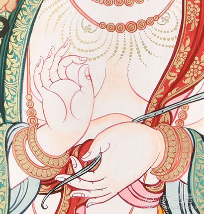 在繪制佛像服飾等位置時,用刻金技法,使圖案更具豐富的層次和立體感,用金勾勒的線條和圖案不但明亮度進一步提高,讓畫面更加燦爛,而且也使金在畫面上保持得更加長久。