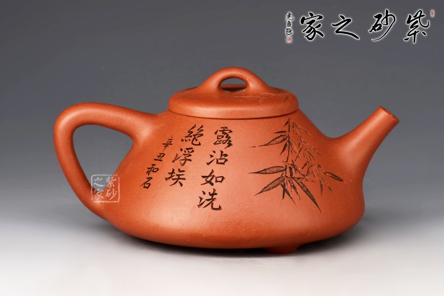 朱泥含鐵量多寡不等,燒成之后變朱砂、朱砂紫或海棠紅等色,熱水沖淋立展嬌嫩鮮紅特色,壺身游移紫光顯現(xiàn),神秘迷人風(fēng)韻令愛(ài)壺之人神醉;有些朱泥含鐵很高,燒成溫度稍高,就會(huì)有鐵質(zhì)析出,出現(xiàn)鐵熔點(diǎn),這樣的泥料顯得格外富有質(zhì)感。