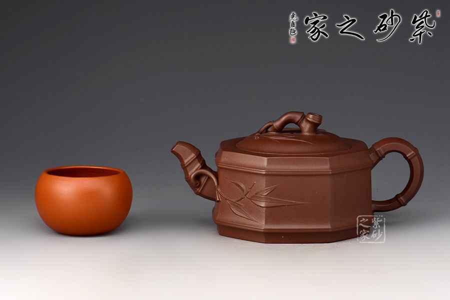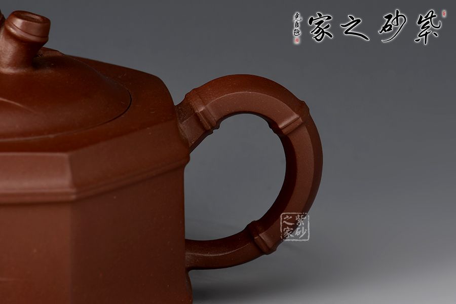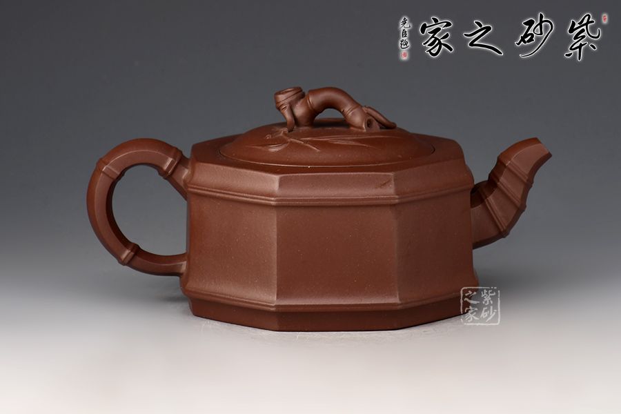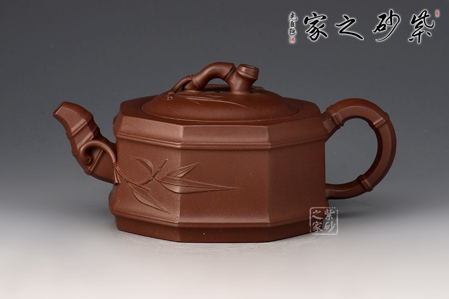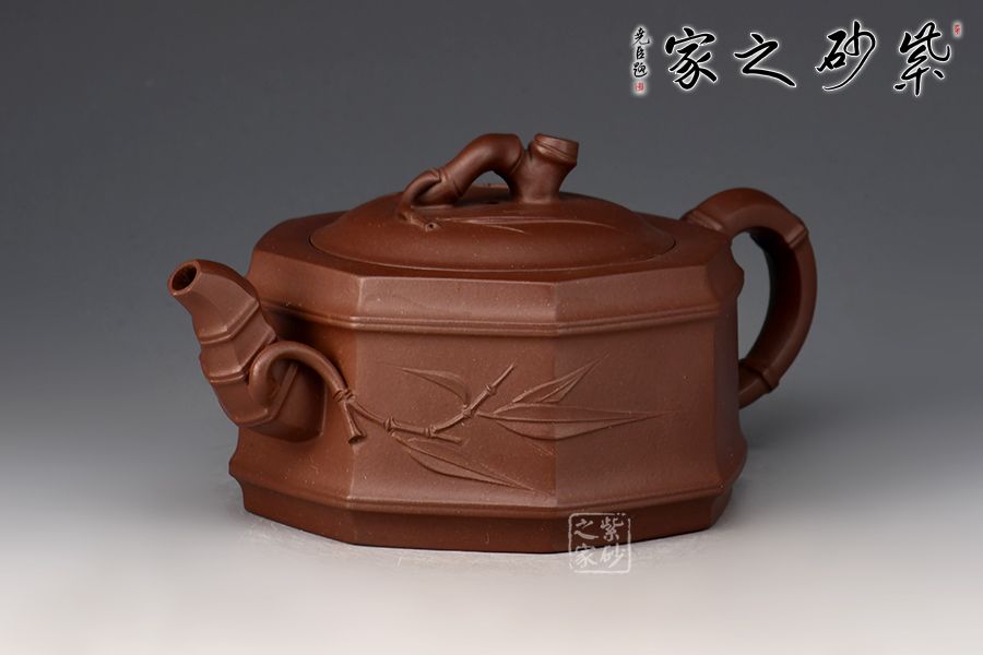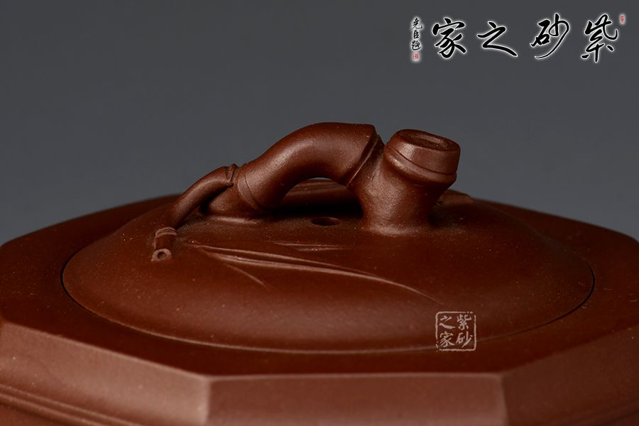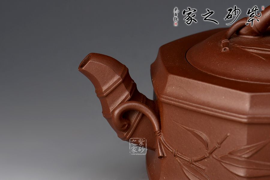 此壺為竹段壺和八方器型的結(jié)合,壺體八方,全手工鑲接成型,點、線、面清晰明確,銜接自如,線條流暢,壺身挺俊,大方簡潔,勁爽古樸之中,更有八面玲瓏,八方來福之意。竹節(jié)勾勒成的流把鈕與“方”的元素結(jié)合自如,暗蘊力度,貼塑竹葉雅致清幽,令人玩味無窮。