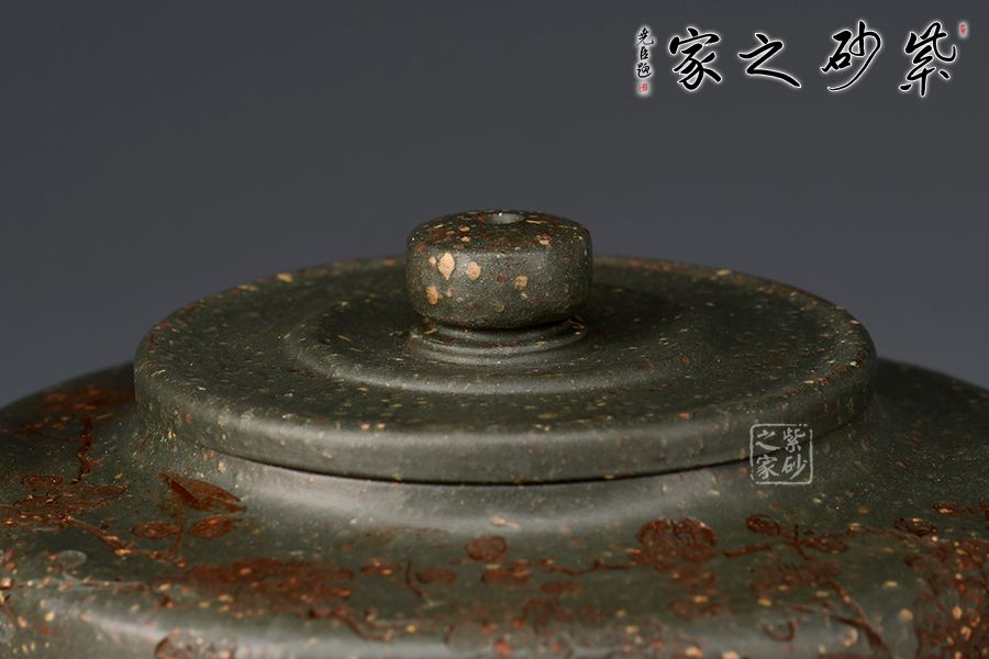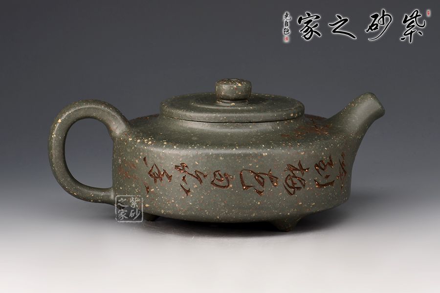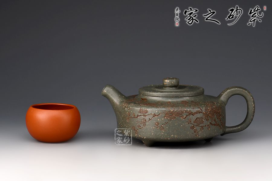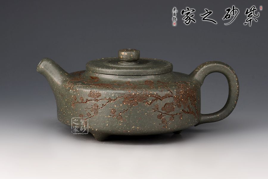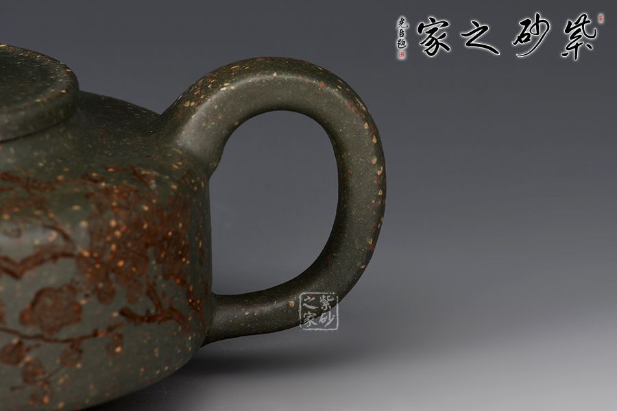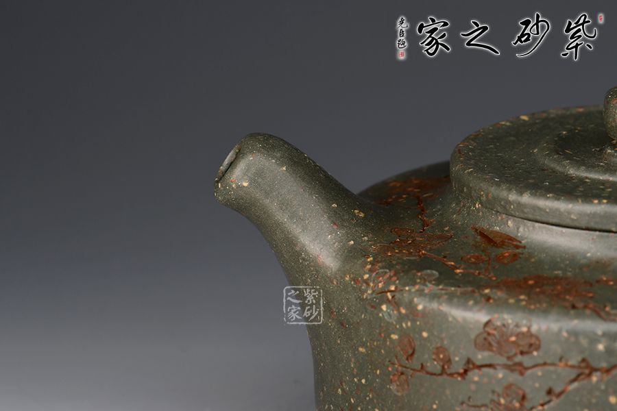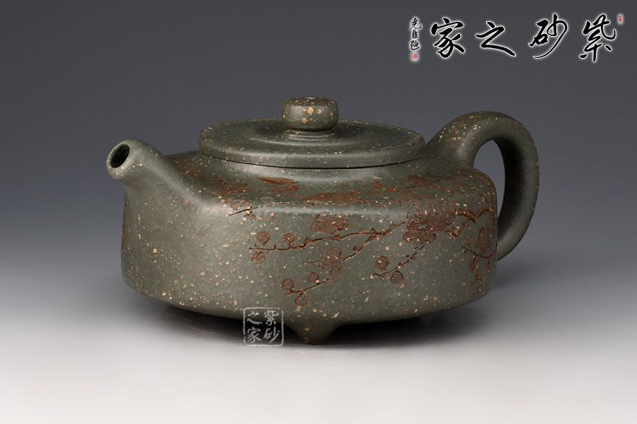 周盤為曼生經(jīng)典壺型之一,此壺壺嘴挺直而出,耳把端正,與壺嘴兩相呼應(yīng),三足鼎立古拙大氣,整款壺把握精準(zhǔn)到位,線面分明,做工精良。大口蓋,投茶十分方便。采用雪華綠泥,泥中有段砂,整壺效果如同雪花似的!壺身刻繪梅花,有寒梅傲霜斗雪之意,古拙大氣的氣質(zhì)冉冉地散發(fā)出來。