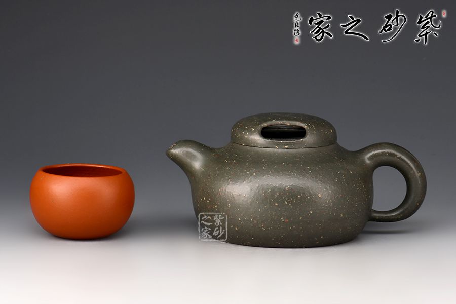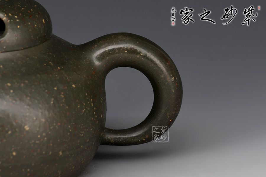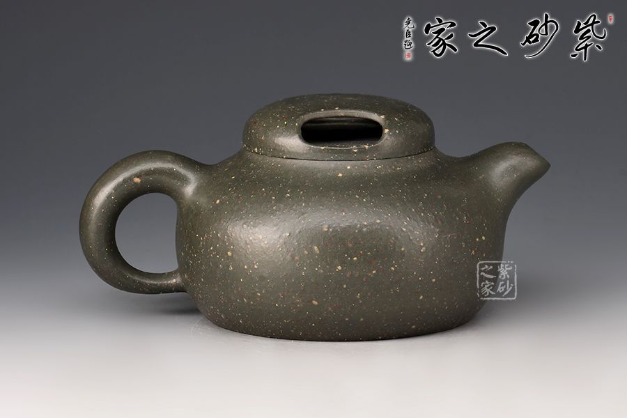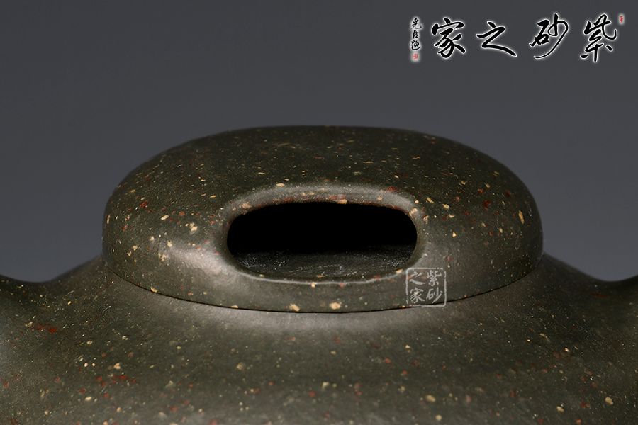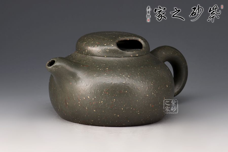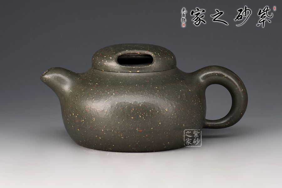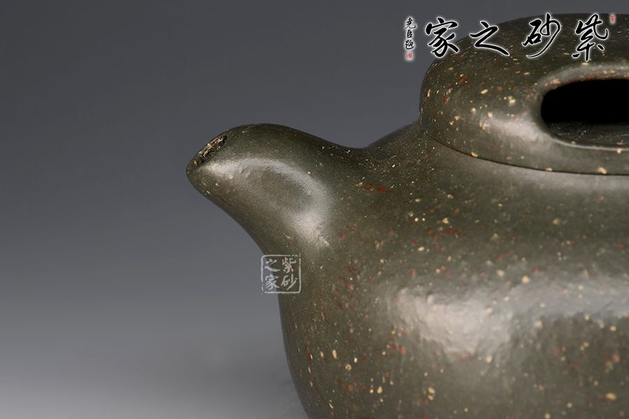 此壺采用雪華綠泥,與顧景舟的雪華壺屬同一配方配制而成,泥中有段砂,似雪花點點!
