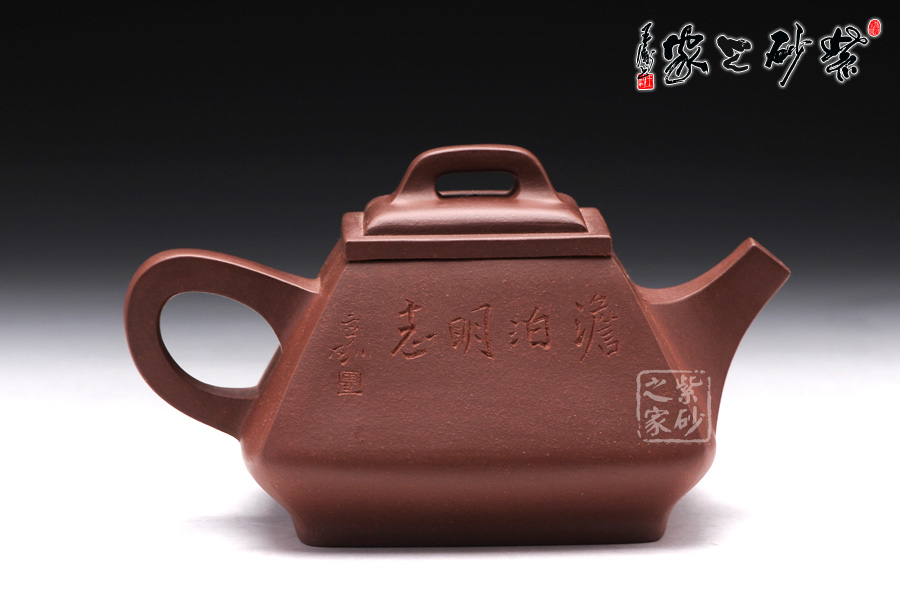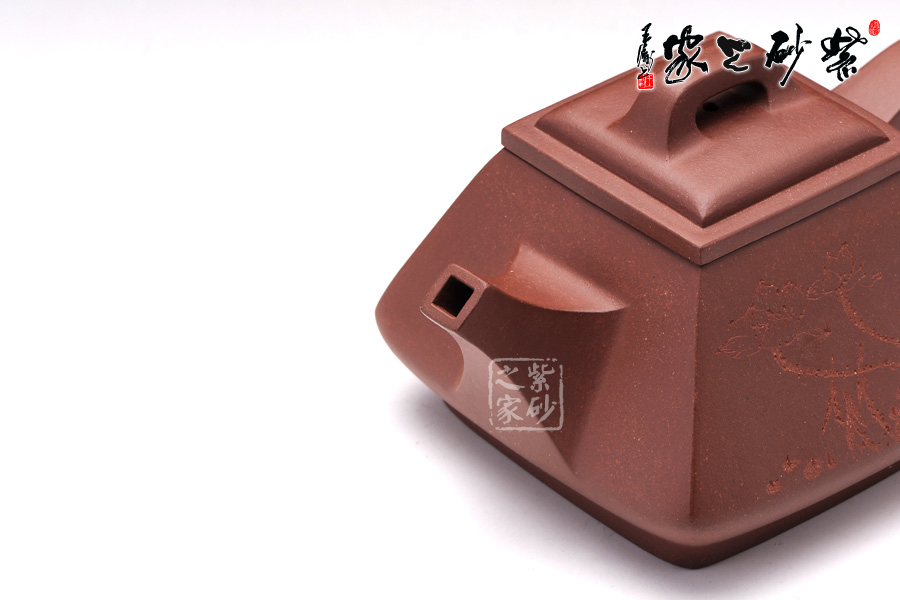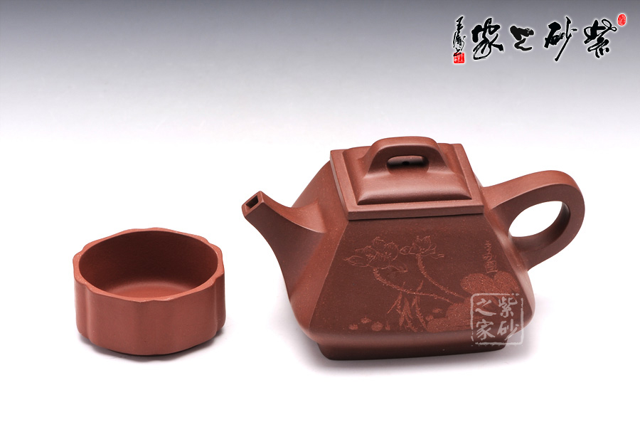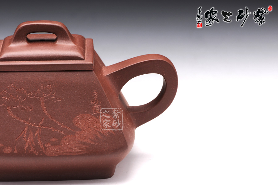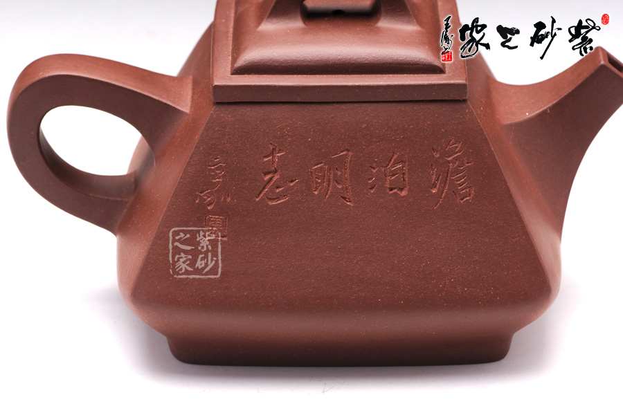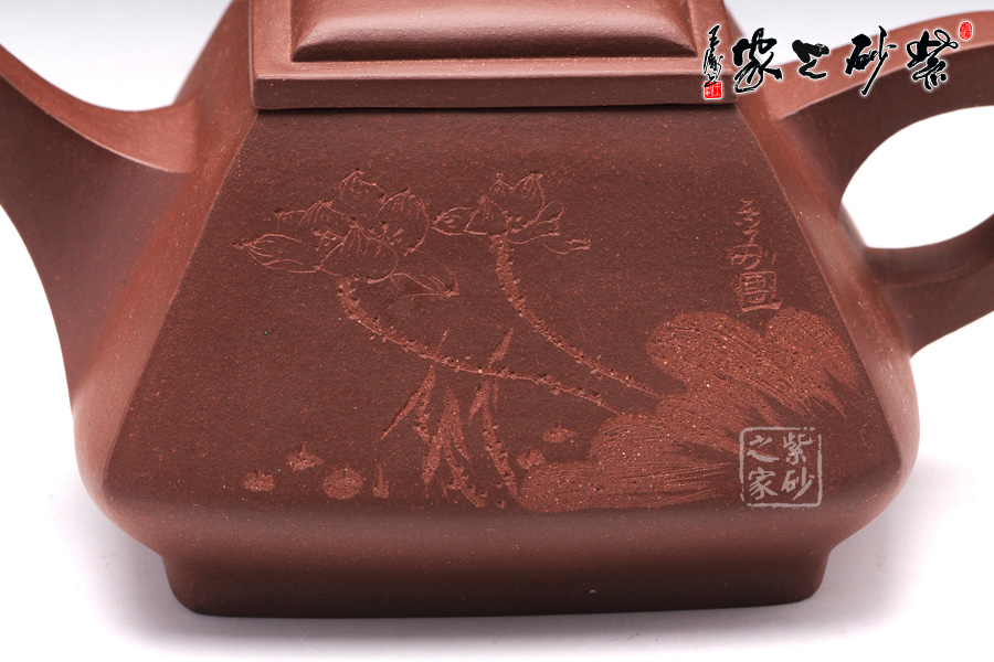 此壺的造型與盧寧剛老師的抽角石瓢的壺型十分相似,不同的地方就在于此壺并沒有抽角的設(shè)計,而是正統(tǒng)的四方設(shè)計,壺身的棱角自上而下,棱角分明,壺身呈金字塔狀,凝重大方,壺底向內(nèi)收斂,以圓角過渡,協(xié)調(diào)中顯現(xiàn)質(zhì)樸,寬厚的壺身預(yù)示人的胸懷;四方壺蓋邊緣平整,蓋面飽滿上凸,橋形鈕暗接精湛;壺嘴與壺把皆延續(xù)了石瓢壺的風(fēng)格,直流嘴四方形迅猛有力,三角形端把剛中帶柔,端握舒適;壺?zé)o論在做工、口蓋處理以及泥料選擇都頗為用心, 是品茗收藏的上等壺品;壺身正面鐫刻的是一株荷花,反面鐫刻的是“淡泊明志”四字。