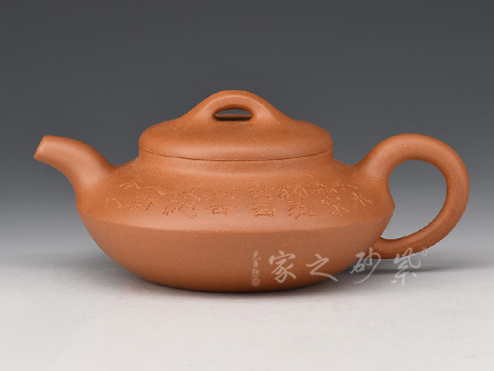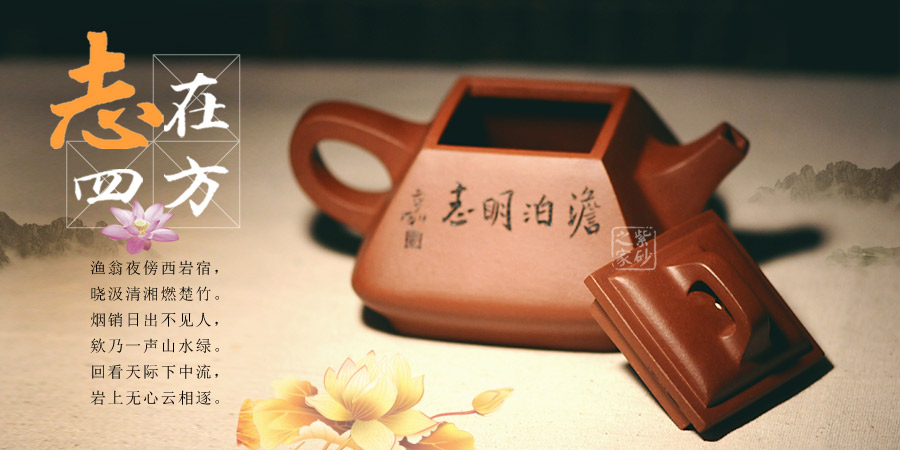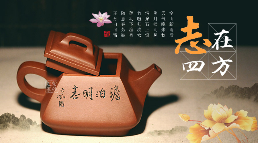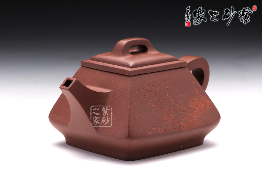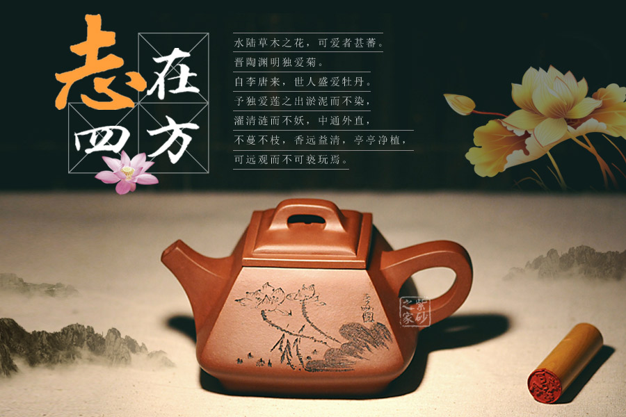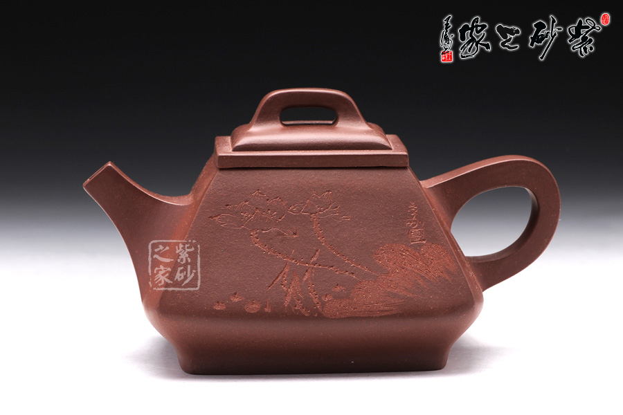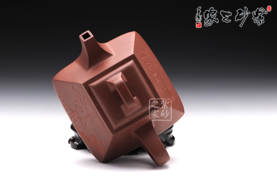 此壺的造型與盧寧剛老師的抽角石瓢的壺型十分相似,不同的地方就在于此壺并沒有抽角的設(shè)計,而是正統(tǒng)的四方設(shè)計,壺身的棱角自上而下,棱角分明,壺身呈金字塔狀,凝重大方,壺底向內(nèi)收斂,以圓角過渡,協(xié)調(diào)中顯現(xiàn)質(zhì)樸,寬厚的壺身預(yù)示人的胸懷;四方壺蓋邊緣平整,蓋面飽滿上凸,橋形鈕暗接精湛;壺嘴與壺把皆延續(xù)了石瓢壺的風(fēng)格,直流嘴四方形迅猛有力,三角形端把剛中帶柔,端握舒適;壺?zé)o論在做工、口蓋處理以及泥料選擇都頗為用心, 是品茗收藏的上等壺品;壺身正面鐫刻的是一株荷花,反面鐫刻的是“淡泊明志”四字。