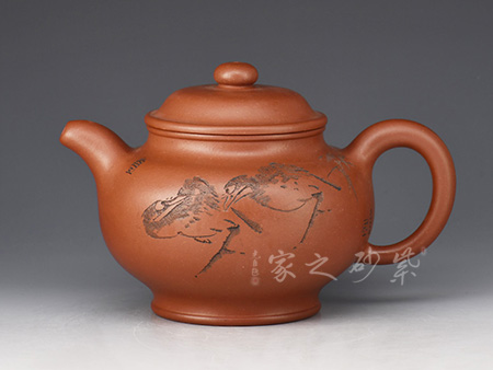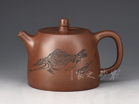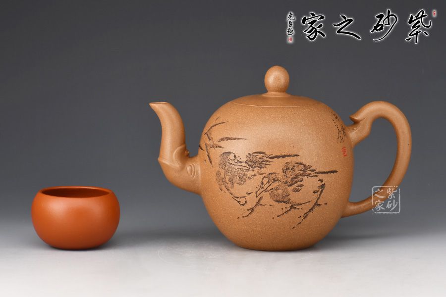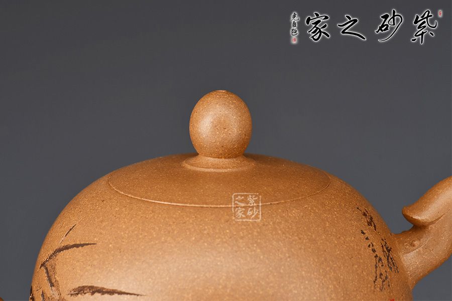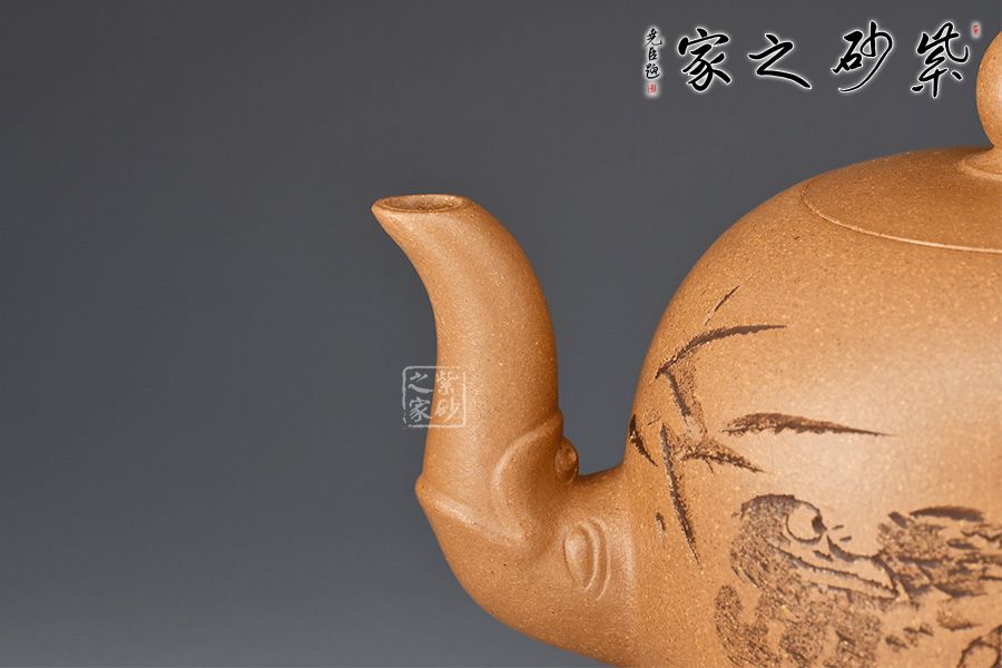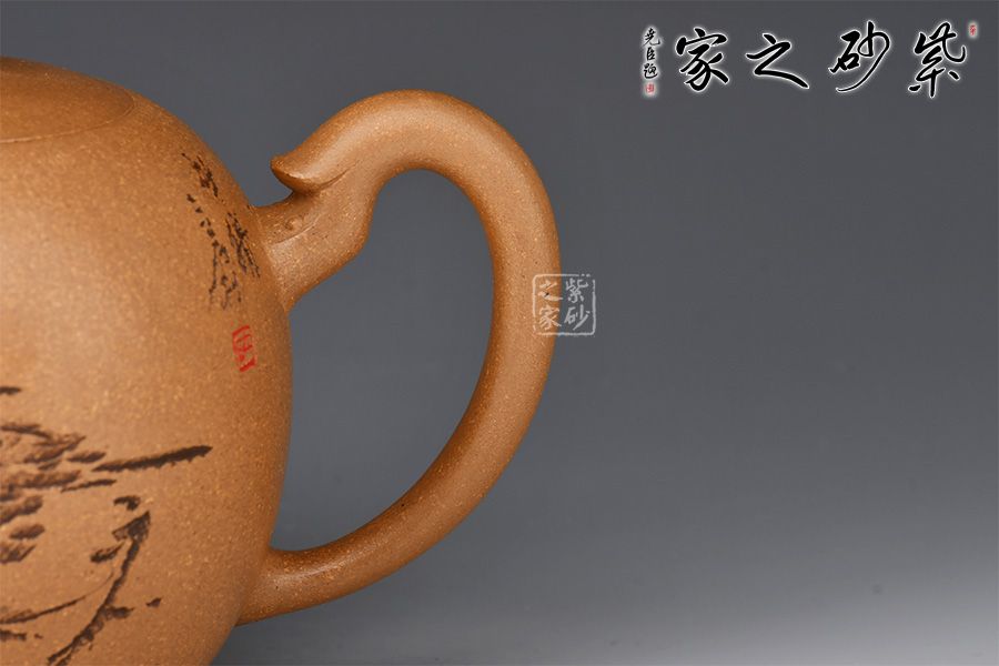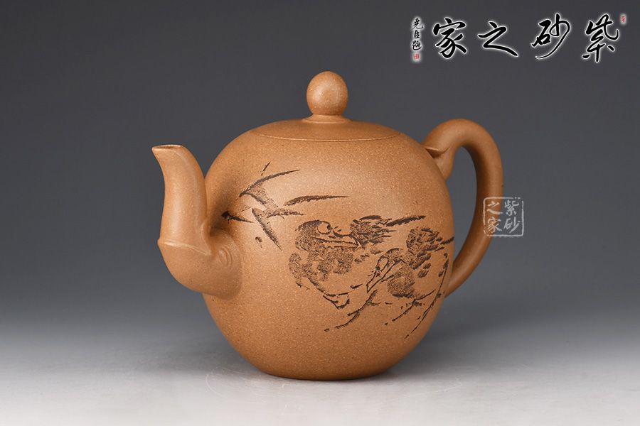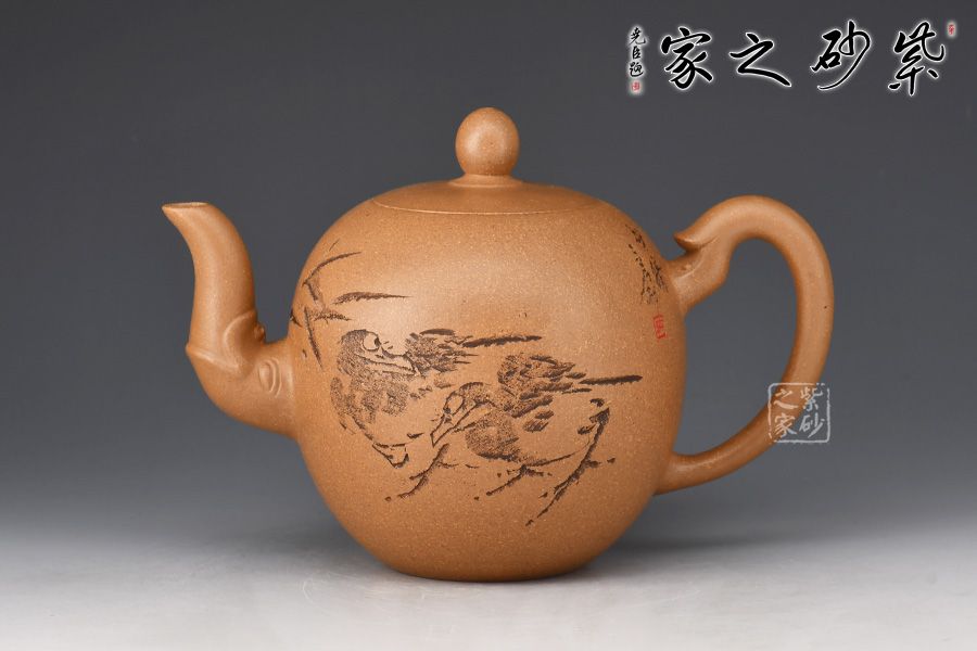 此壺壺身飽滿圓潤,線條靈動。彎流優(yōu)美別致,涓香出口迅捷痛快豐斂明晰,曼妙絕倫,珠鈕與壺身呼應,造型生動,令人愛不釋手。此壺氣韻高雅自然,好似能載萬物,包容萬象,龍嘴把,加上陶刻裝飾,非常值得賞玩。