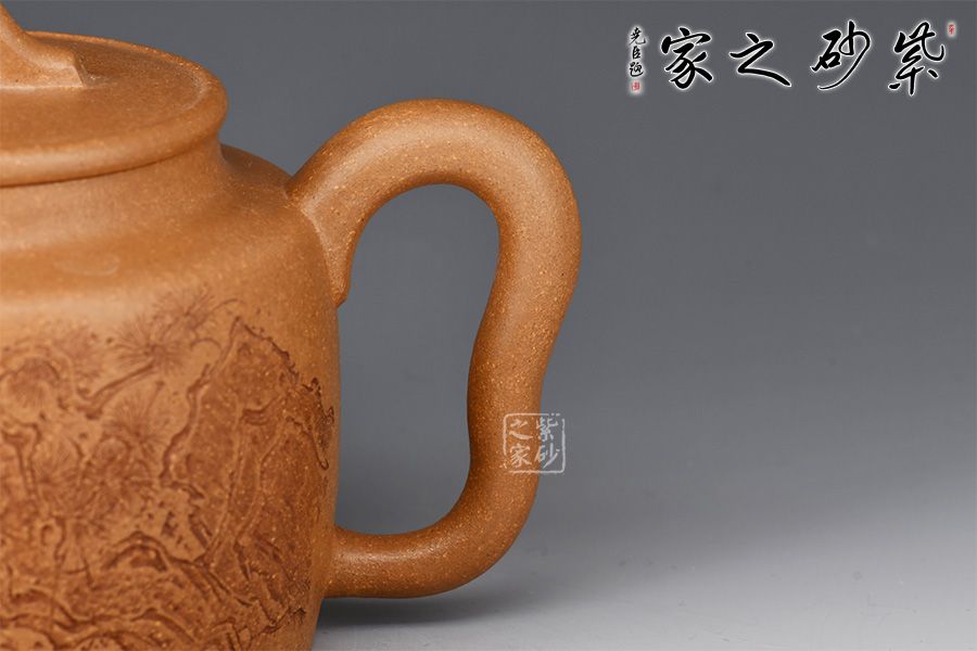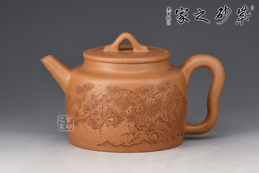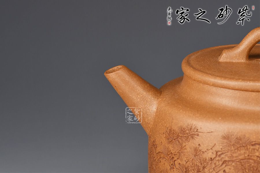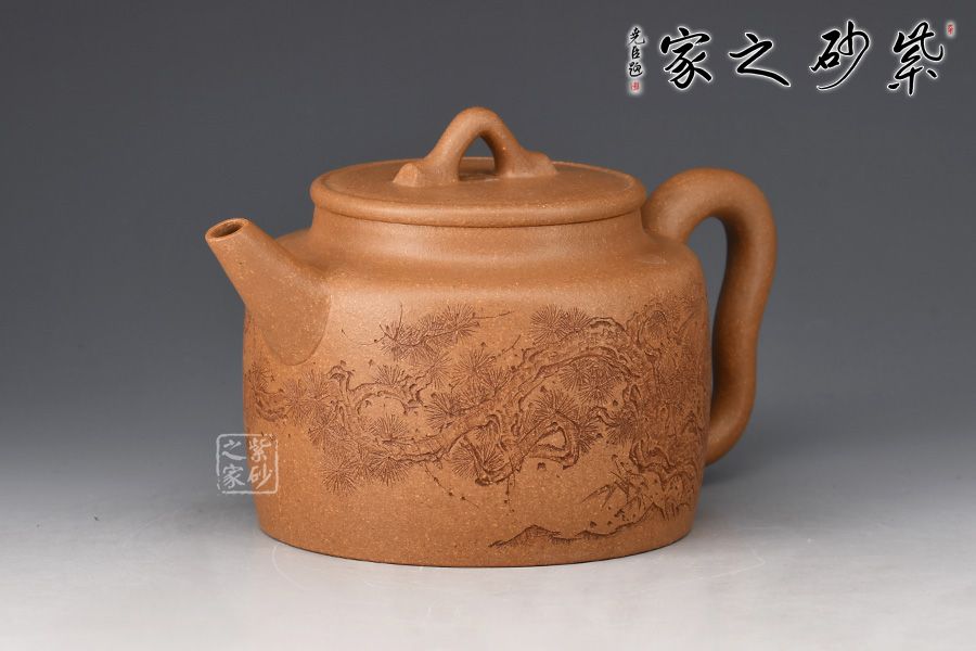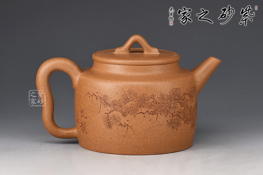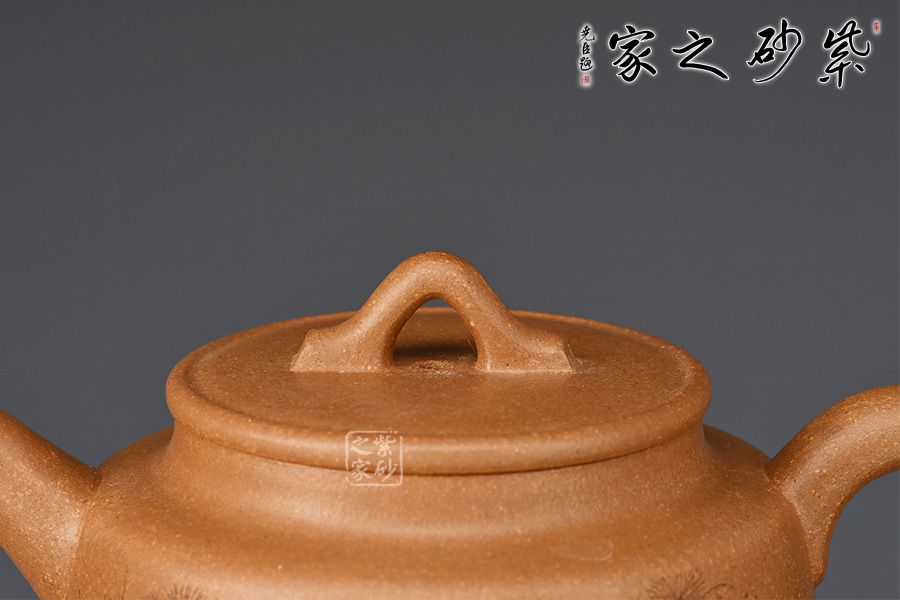 德鐘壺為紫砂圓器中的經(jīng)典壺型,此壺摹古而作,為傳統(tǒng)經(jīng)典之德鐘壺式。以老段泥摶制而成,圓柱壺身,氣勢(shì)宏大。劍流出水利落,環(huán)形把側(cè)出,莊重儒雅。口蓋嚴(yán)密,平口出唇,蓋上以一細(xì)線作為裝飾。壺鈕拱起,方便拿捏。壺身周立波老師刻繪松枝,寥寥數(shù)筆,將松枝描繪蜿蜒遒勁,頗見(jiàn)蒼古之氣,并題“虬松”二字。