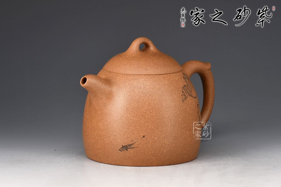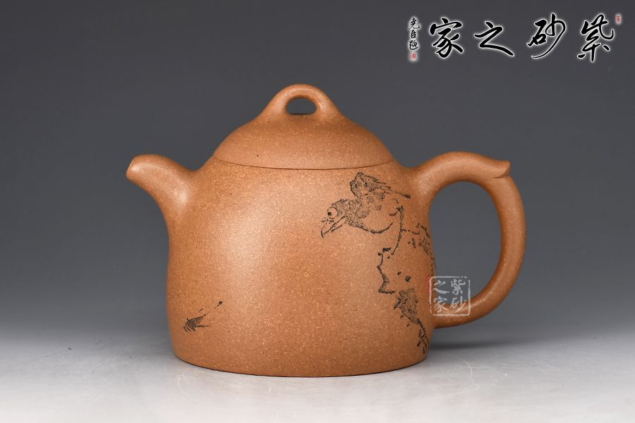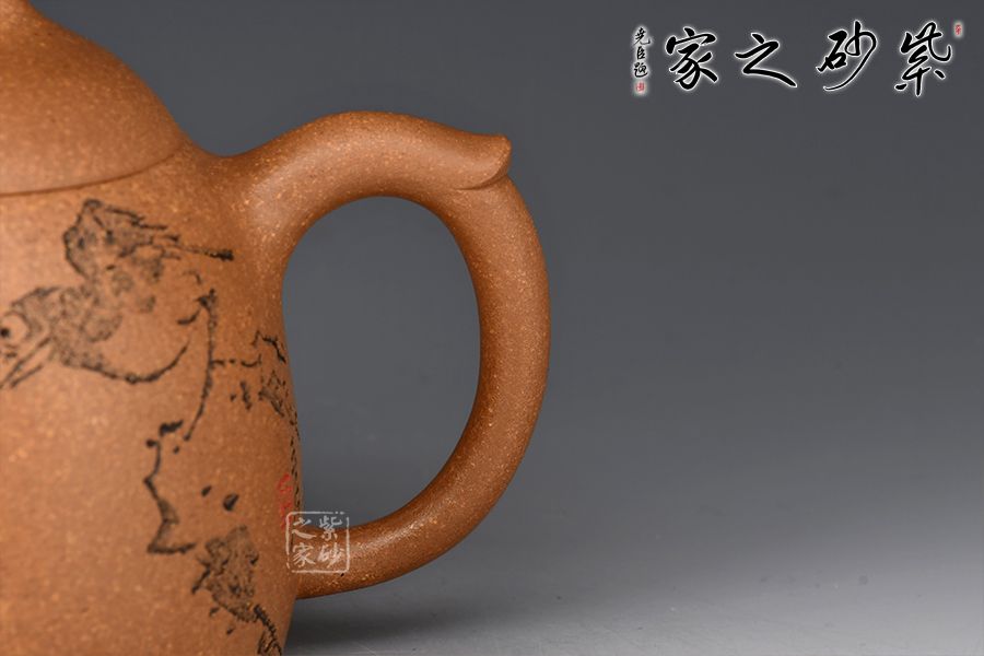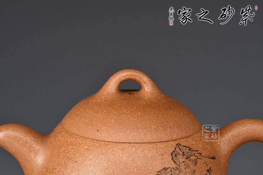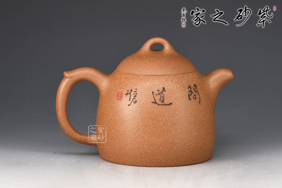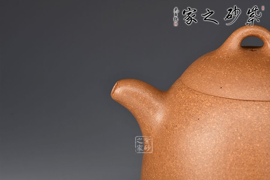 此壺為作者選用老段泥精制而成,泥色明潤,伴以粒粒金砂,彰顯古樸韻味。壺身若秤砣之形,高聳挺立,自下至上逐漸收斂,截蓋上下渾然一體,線條自然流暢。一彎流短而挺拔,出水爽利,環(huán)形飛把不矯不揚,儒雅端莊。