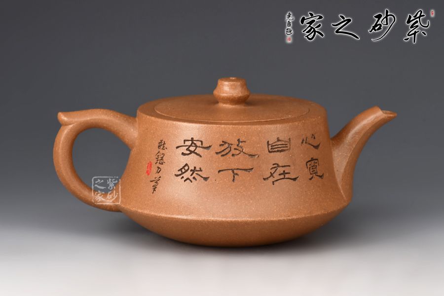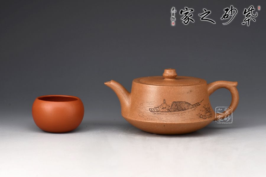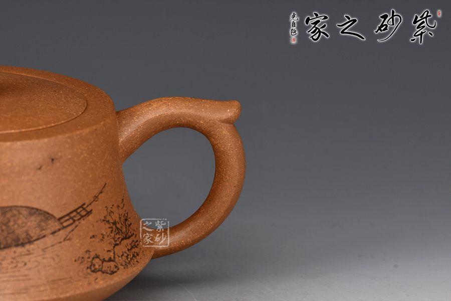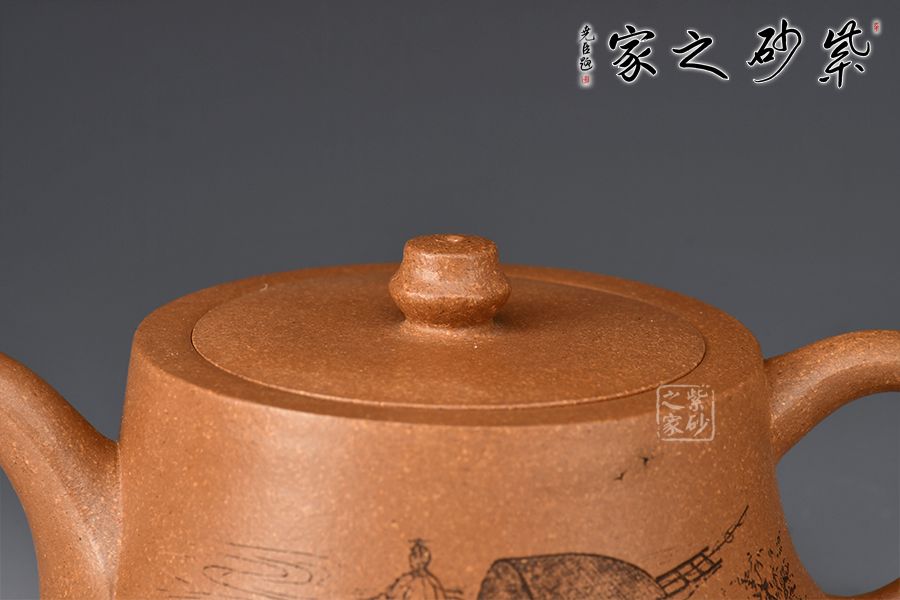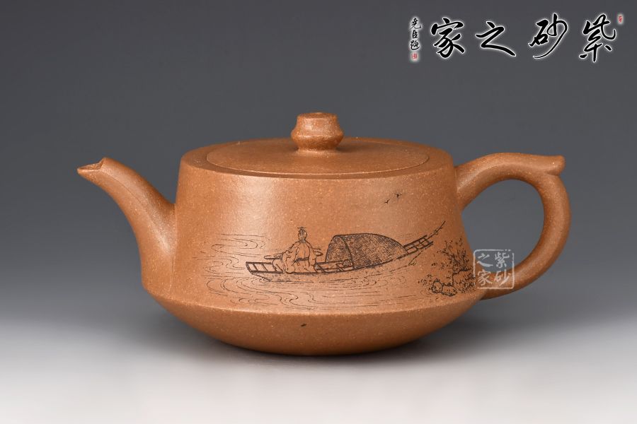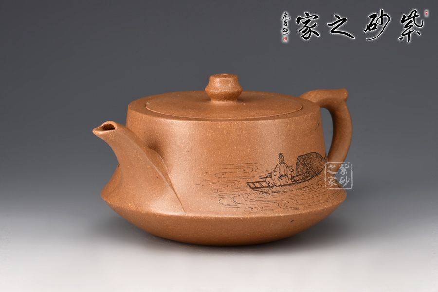柱礎是用來承受房屋立柱壓力的一塊墊基石,此壺創(chuàng)作靈感來源于此。壺身似圓石鼓凳,上窄下寬,腰間微斂;嵌蓋與壺身渾然一體,氣密性好,壺鈕與壺身一致,短彎流,耳形把,弧度優(yōu)美,與壺身相應。壺身名家張聽鋼雙面陶刻,正面刻繪湖中泛舟,反面陶刻詩詞,文人氣息濃厚,美壺一把,堪為賞用!