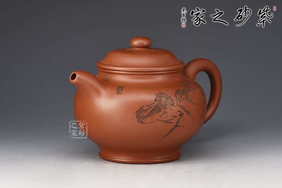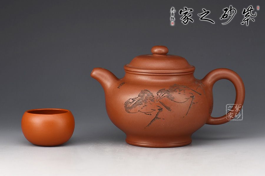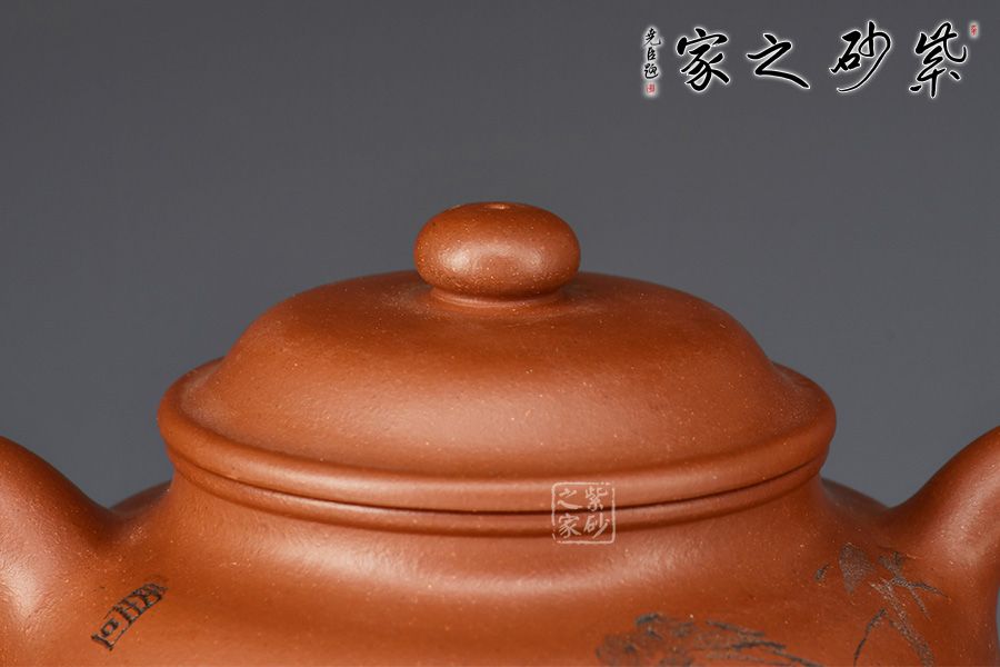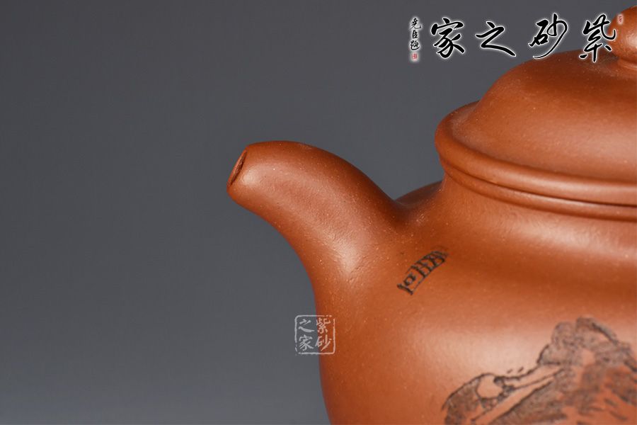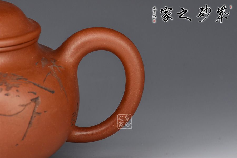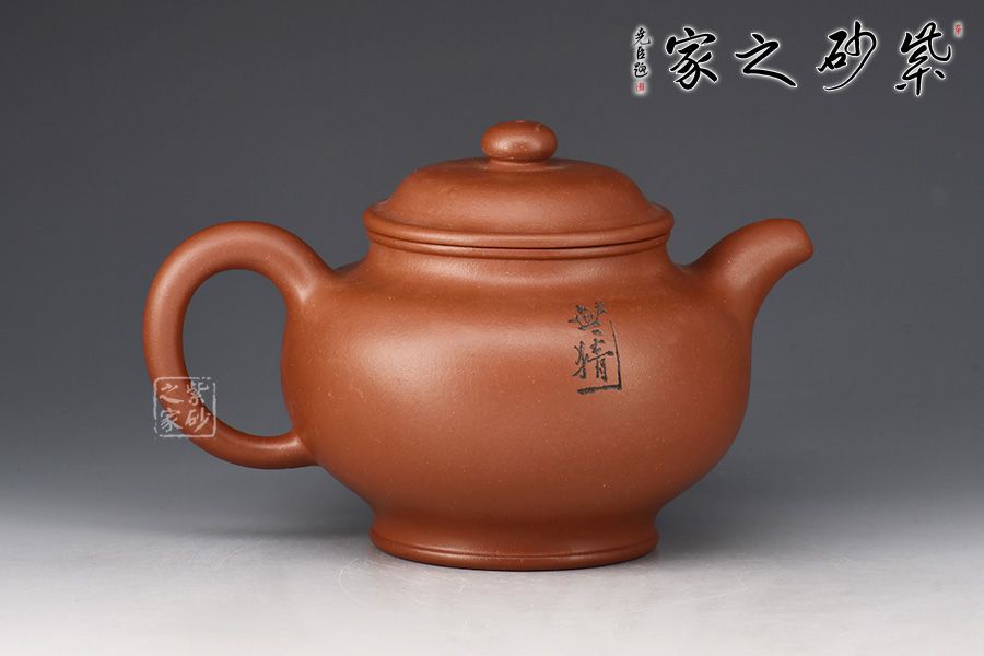 整器簡潔素雅,壺身圓融飽滿,口蓋寬大,利于投茶。壺蓋隆起,壺鈕呈扁球狀,壺鈕、壺蓋、壺身以扁圓形相呼應(yīng),圓圓相疊,極富韻律。流、把自然胥出,線條柔和而圓潤,細(xì)膩而流暢,加之圈足,平添輕盈之感。