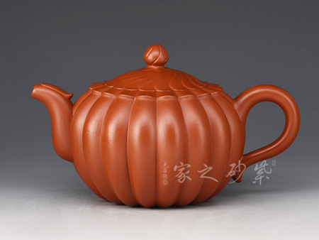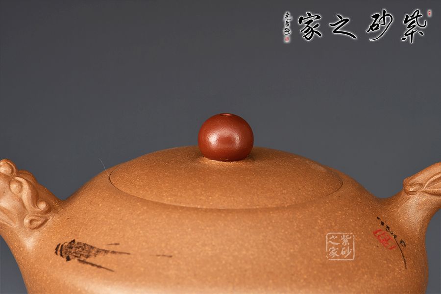 此件作品有著豐富吉祥的含義,在圓珠壺的造型上進(jìn)行創(chuàng)新,突出壺鈕的紅色,烘托了吉祥寓意的主題。