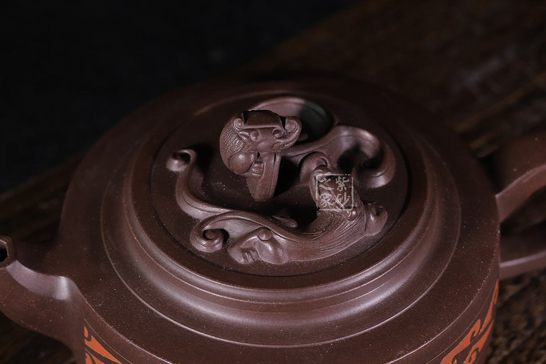 此作品造型端莊大氣,古韻盎然;器型古樸,線條簡(jiǎn)潔流暢,寓意深邃,將楚漢爭(zhēng)雄的場(chǎng)面呈現(xiàn)在世人的面前。兩條象征著歷史人物的螭龍氣勢(shì)恢宏,盤(pán)結(jié)于壺蓋之上,給劉邦和項(xiàng)羽之爭(zhēng)上升到了一個(gè)更具有鑒賞意味的層面,表現(xiàn)出歷史的滄桑和傳承感,使這把壺產(chǎn)生了歷史賦予的文化氣;飛把設(shè)計(jì)飄逸感強(qiáng),四方壺嘴與壺把相對(duì)稱,向上翹起,有如仰天長(zhǎng)嘯。