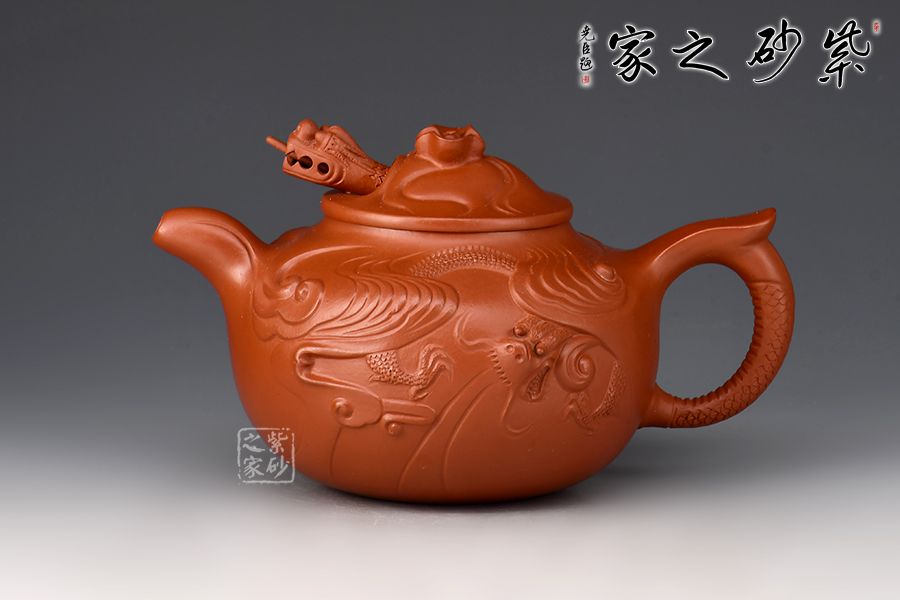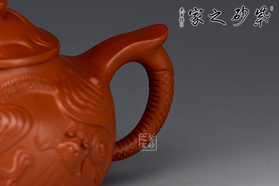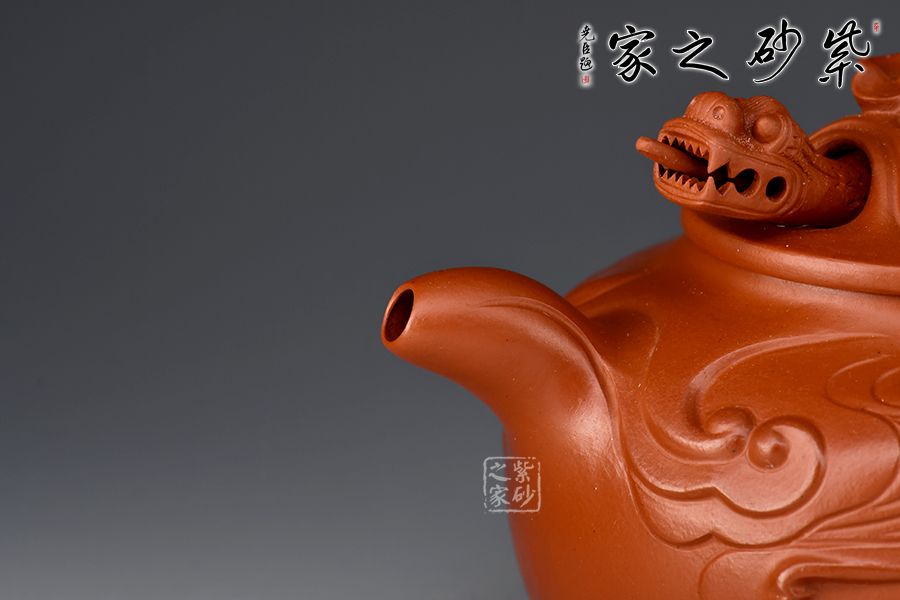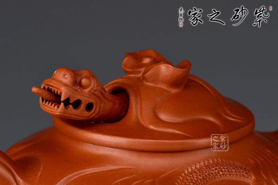 壺把裝飾魚鱗紋,壺身為圓形,云霧中伸出兇猛的龍頭。壺蓋呈波濤涌起狀,左側(cè)探出立體雕出的龍頭。可謂神龍見首不見尾,該壺設(shè)計巧思,造型華美大方,刻畫精細(xì)而不繁瑣,塊面清晰簡潔,線條流暢明快,沉靜中透出活潑,令人嘆為觀止。