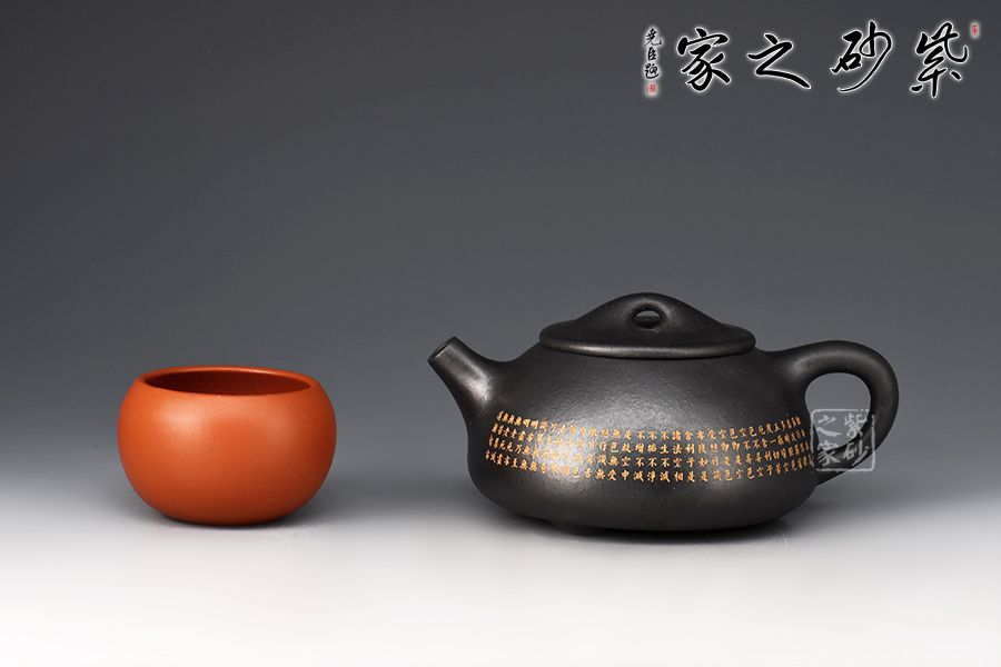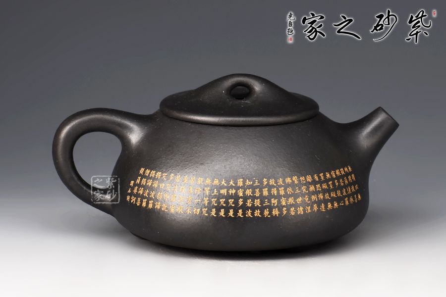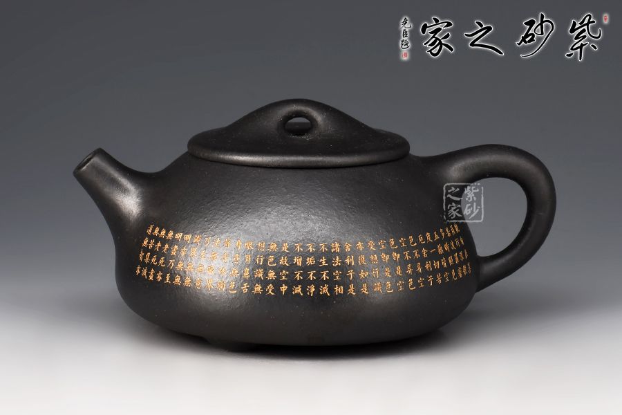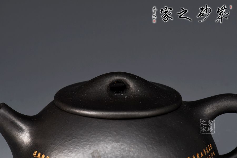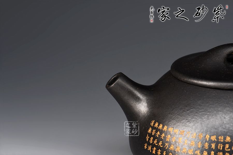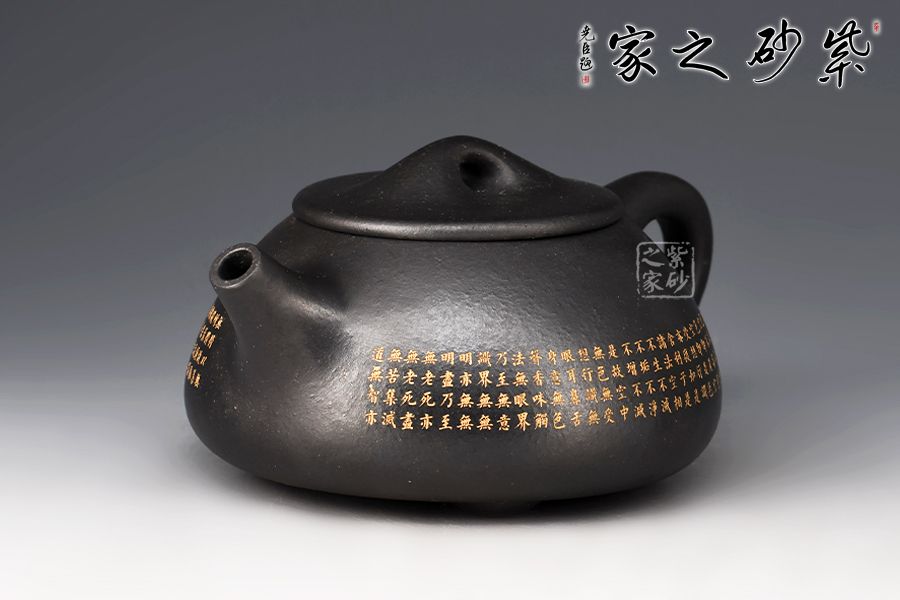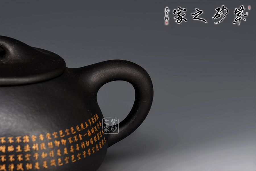 此景舟石瓢壺采用黑泥制成,其色如墨,神秘靜寂、引人神往。壺身下大上小呈三角形,周身皆以圓弧線條構(gòu)成,嘴、把、的處處銜接自然流暢,線條利落明確,起承轉(zhuǎn)合交待清楚。下以三圓足支起全身,使壺顯得挺括有神,沉靜而深意雋永。壺身的刻繪錦上添花,此壺不論自用或是收藏都極為推薦!